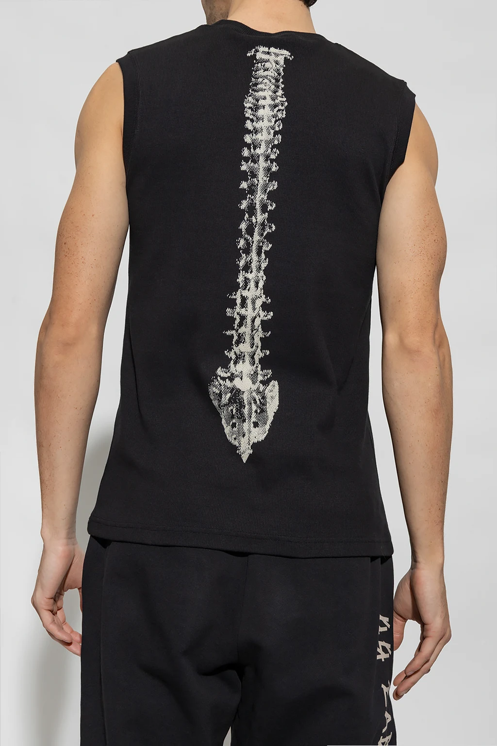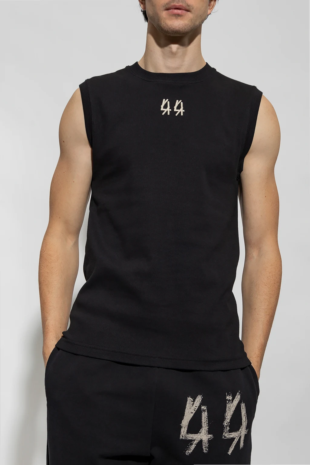 Black sleeveless T-shirt from 44 Label Group. Crafted from cotton with a ribbed texture, this style features an elasticated crew neck and sleeves, an embroidered logo on the front and a cream spine print at the back.