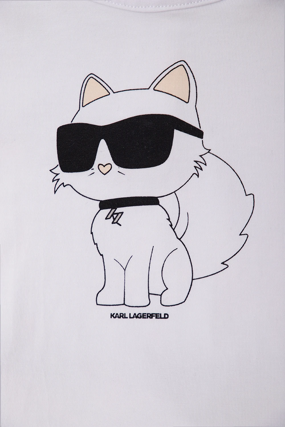 White and pink T-shirt and trousers set from Karl Lagerfeld Kids. Made of cotton, this item is decorated with an animal pattern.