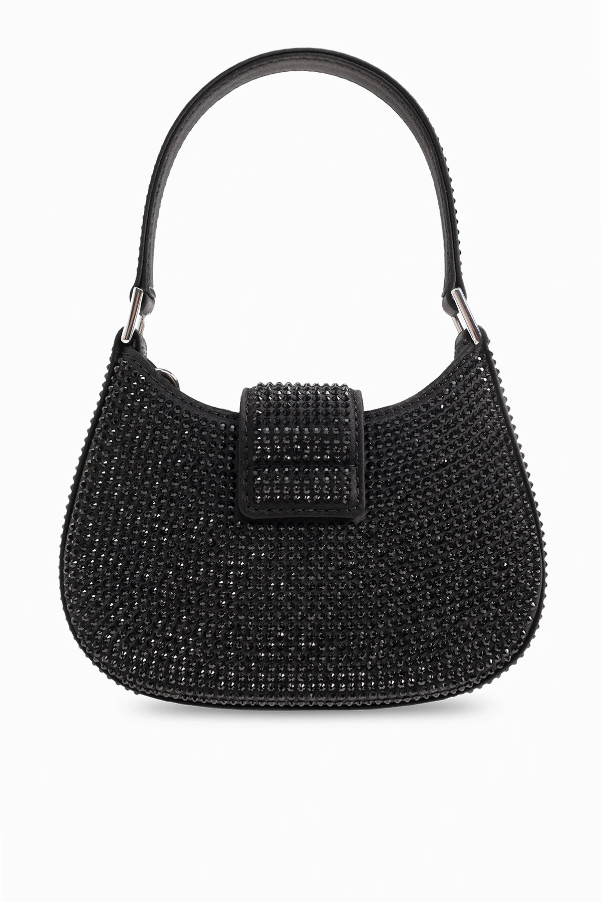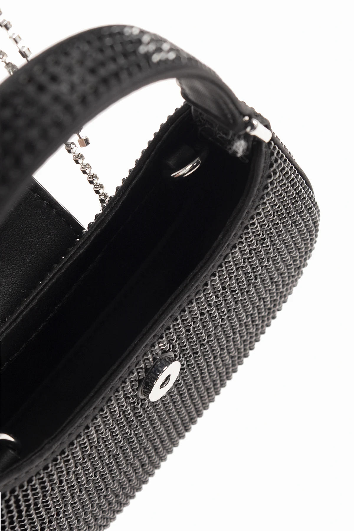 Black ‘Crescent Micro’ shoulder bag from Self Portrait. Crafted from fabric embellished with rhinestones, this model is complete with a snap closure, decorative bow embellished with crystals and fringes, half-round handle, detachable shoulder chain, one internal compartment and silver-tone metal hardware.