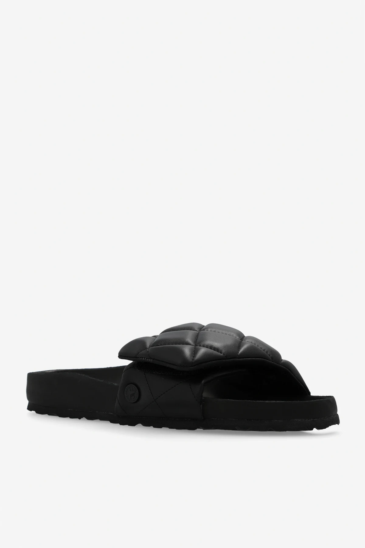 Black ‘Sylt’ quilted slides from Birkenstock 1774. This pair has a tapered upper made from leather, Velcro fastening, logo detail to the side, anatomically shaped cork-latex footbed and black EVA sole.