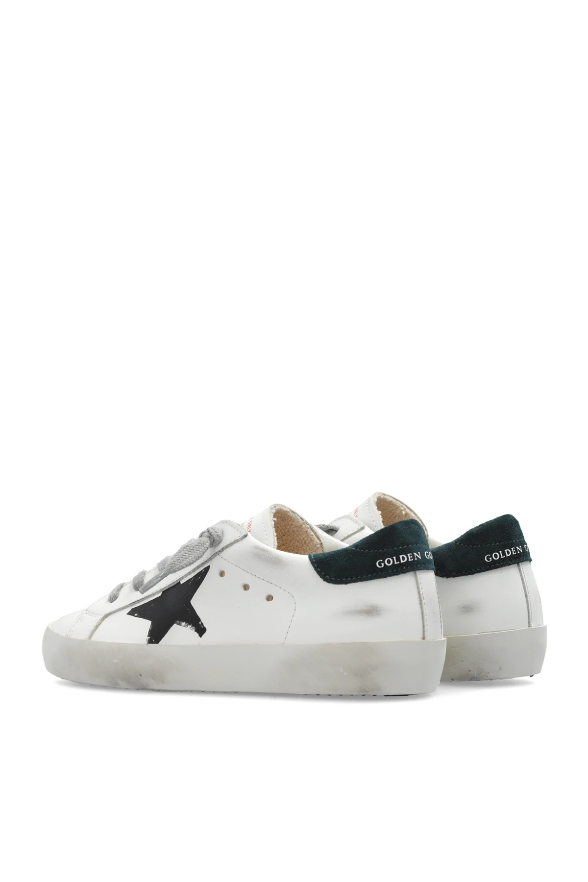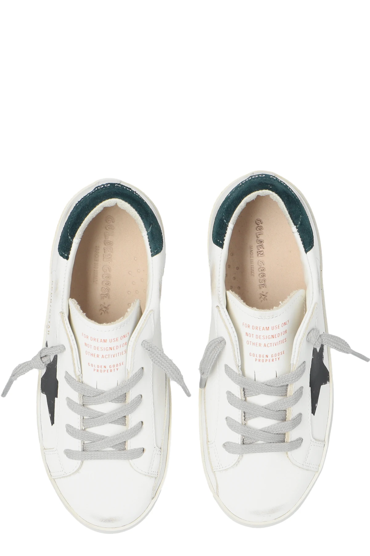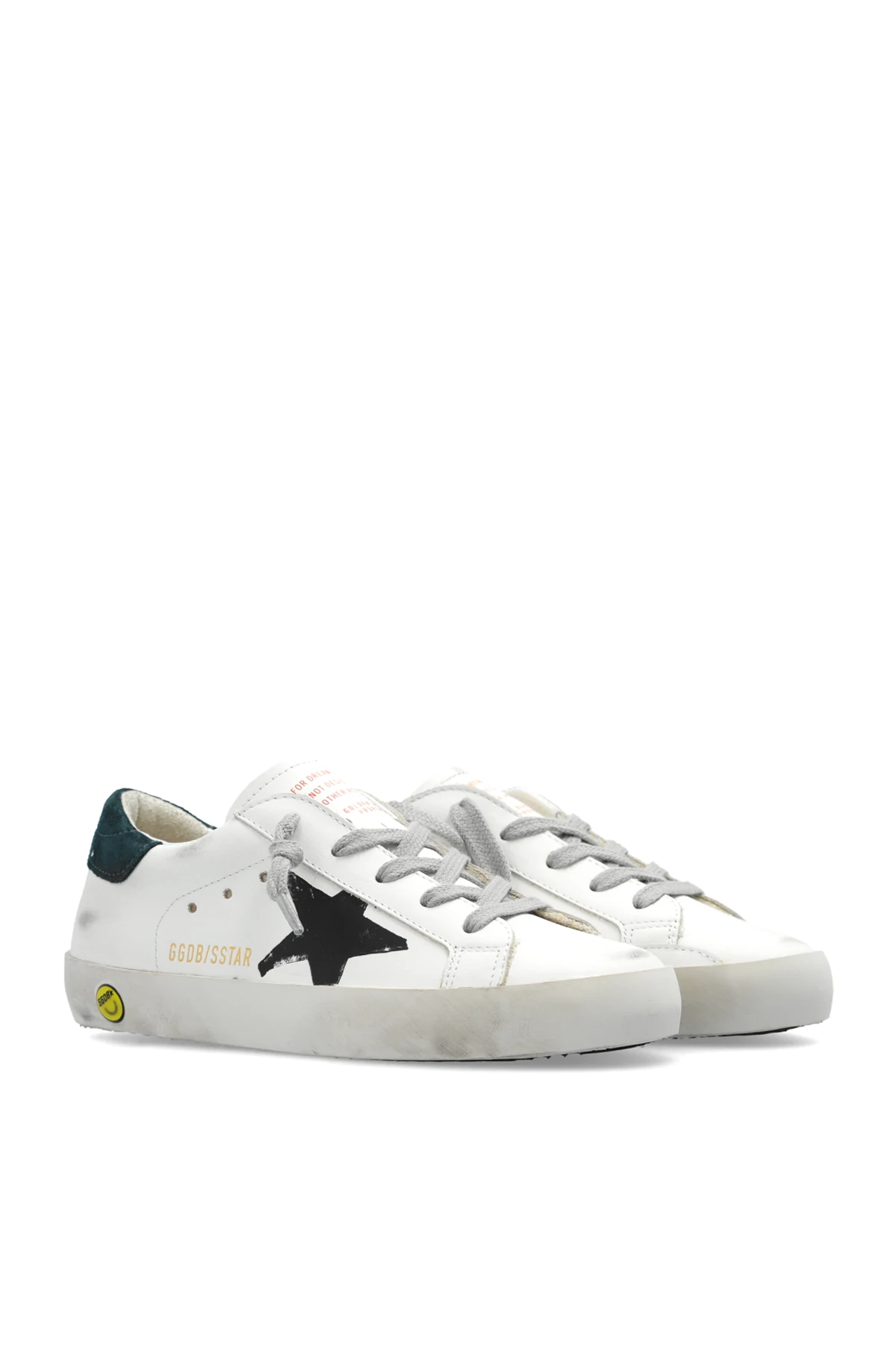 Introducing the exceptional children's sports shoes from the Super-Star With List And Printed Star collection by the renowned brand Golden Goose Kids. These shoes epitomize style and luxury, combining elegance with a touch of rebellious spirit. Made from the highest quality leather, these shoes impress with their meticulous craftsmanship and unique design. The dominant white color harmoniously contrasts with dark green heel tabs, gray laces, and the distinctive black star on the side of the shoe. The heel tab features the inscription GOLDEN GOOSE, and the side of the shoe bears the inscription GGBD/SSSTAR. The unique distressed sole effect is a hallmark of this luxury brand, giving the shoes a slightly worn look. An additional eye-catching accent is the yellow element with a smiling emoticon on the side of the sole and the red inscription on the shoe's tongue. Why should you buy this product? Exceptional design – unique style with an iconic star motif and subtle vintage effect. High-quality materials – outer and inner layers made from top-grade leather, rubber sole. Comfortable wear – carefully padded interior ensures wearing comfort. Exclusive brand – product from the renowned Italian designer Golden Goose. Stylish detail – unique inscriptions and distinctive elements like the emoticon and red inscription on the tongue.