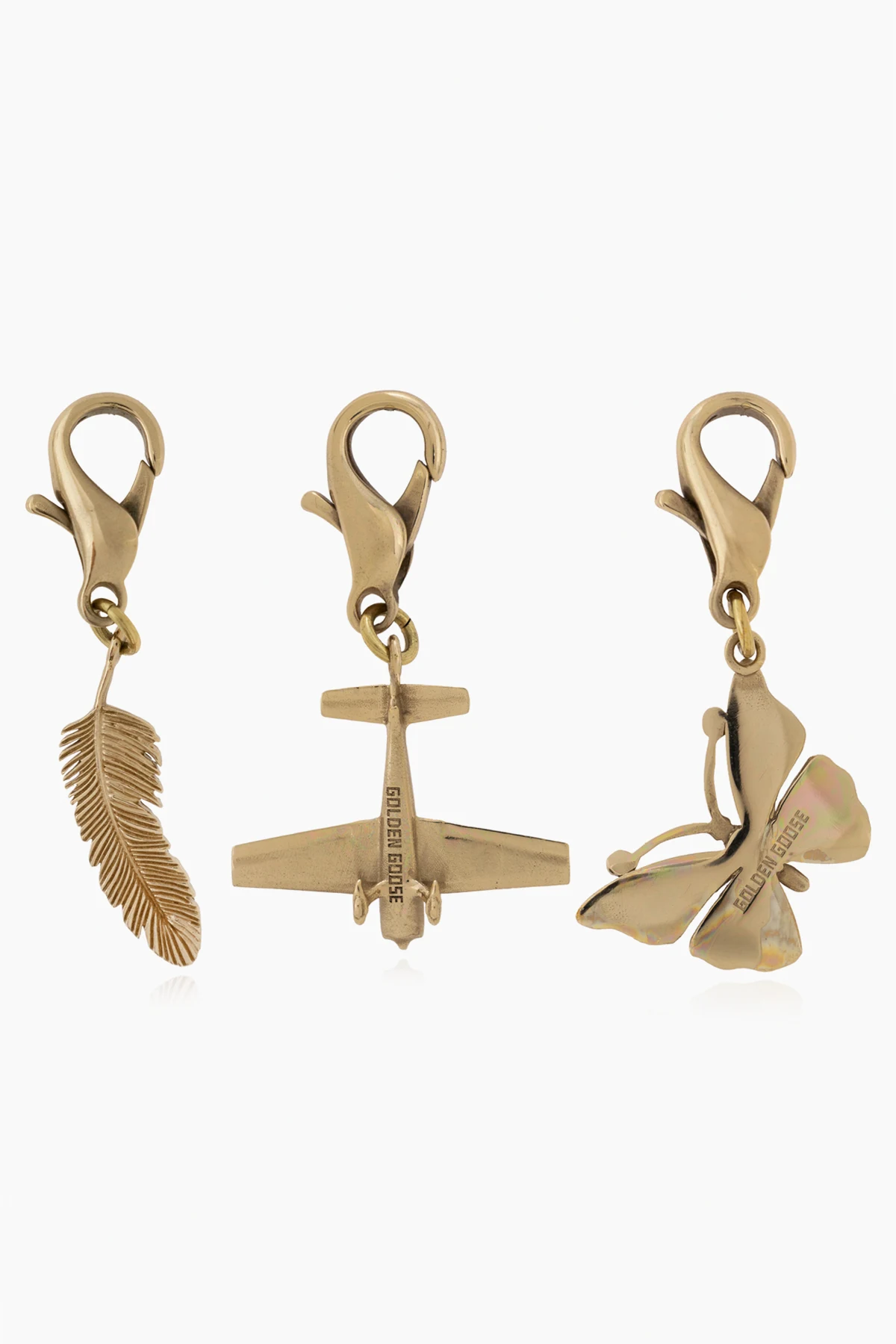 Introducing the Golden Goose Keychain Set: a trio of exquisitely crafted unisex accessories that blend practicality with an air of sophistication. Each piece in this collection, featuring a feather, an airplane, and a butterfly, is a testament to the artistry and meticulous attention to detail that Golden Goose is renowned for. Crafted from 100% high-quality brass, these keychains boast a matte golden finish that radiates an understated elegance. The feather keychain showcases a lifelike representation with intricate lines and texture, embodying the grace and finesse of nature. The airplane keychain, with its classic silhouette and precise form, evokes a sense of adventure and discovery. Meanwhile, the butterfly keychain, with its symmetrical wing pattern and slightly abstract shape, offers a whimsical yet sophisticated charm. Each keychain is equipped with a carabiner clip, allowing for effortless attachment to keys or a handbag, seamlessly integrating elegance into everyday life. Whether adorning a wristlet as seen in our stylized photographs or adding a touch of glamour to a black tote bag, these keychains serve as versatile and fashionable accessories. Why Purchase This Product? Elegant Design: Each keychain is a work of art, reflecting Golden Goose's commitment to beauty and quality. Versatile Use: Easily attach to keys or bags, transforming ordinary objects into a statement of style. Exquisite Materials: Made from 100% brass, promising durability and a luxurious feel. Unique Gift Idea: Perfect for those who appreciate the finer things in life, these keychains make a thoughtful and distinctive gift.