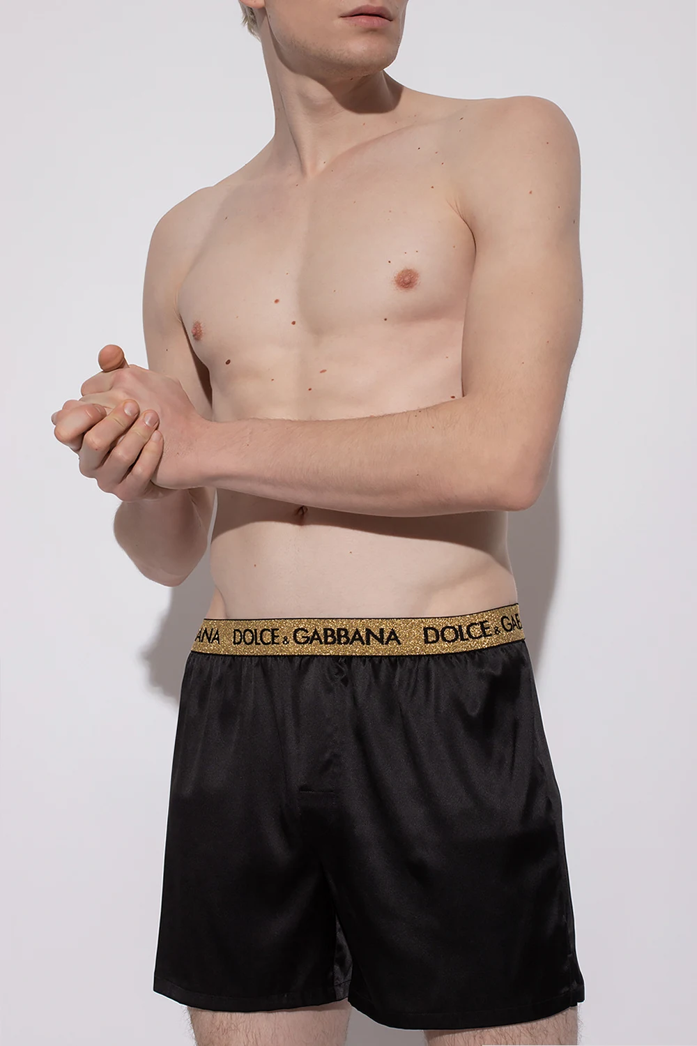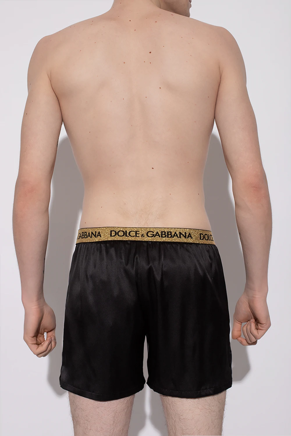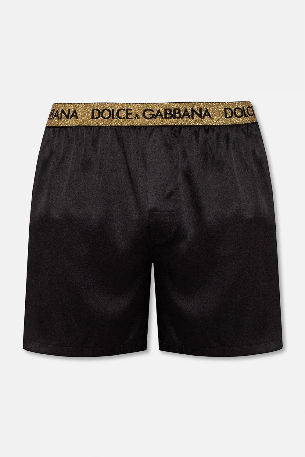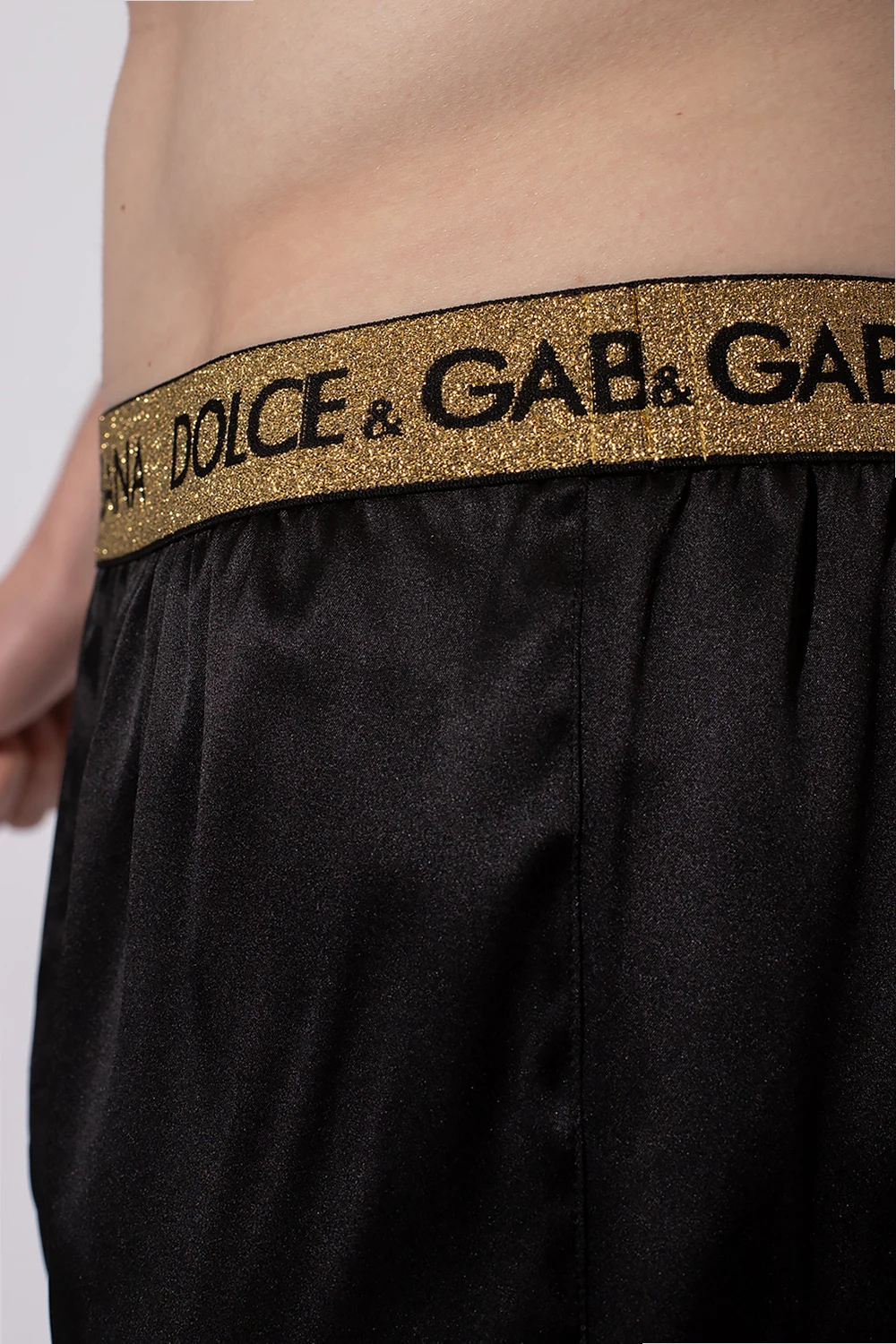 Black set of accessories from Dolce & Gabbana. Made of silk satin and decorated with a black and gold-tone logo motif, it includes boxer shorts, pillow and sleep mask.
