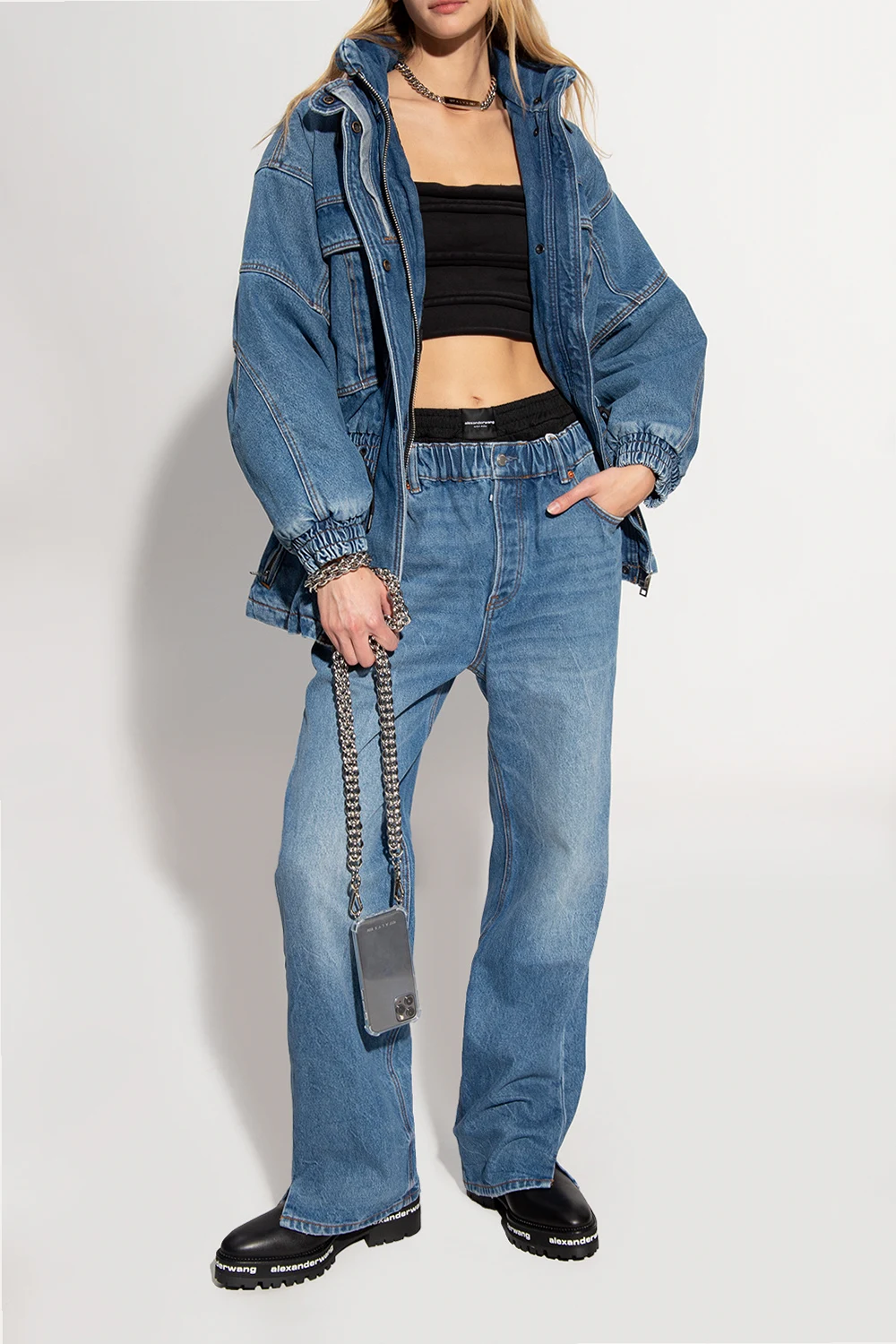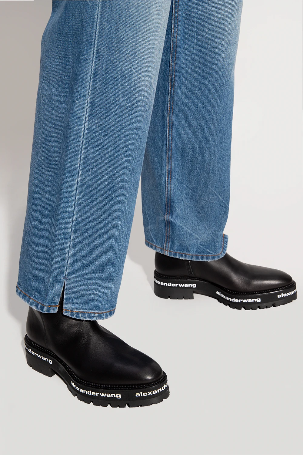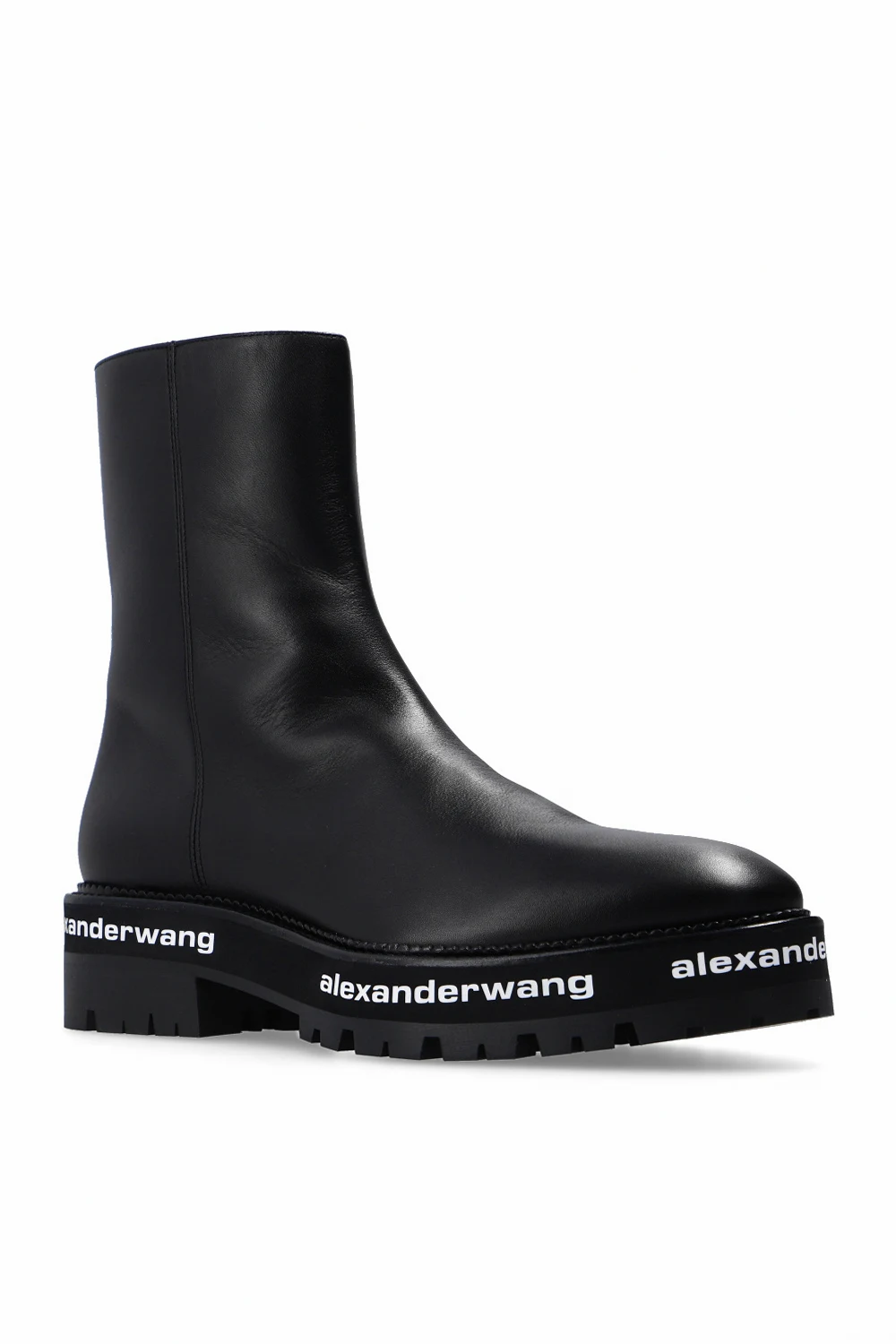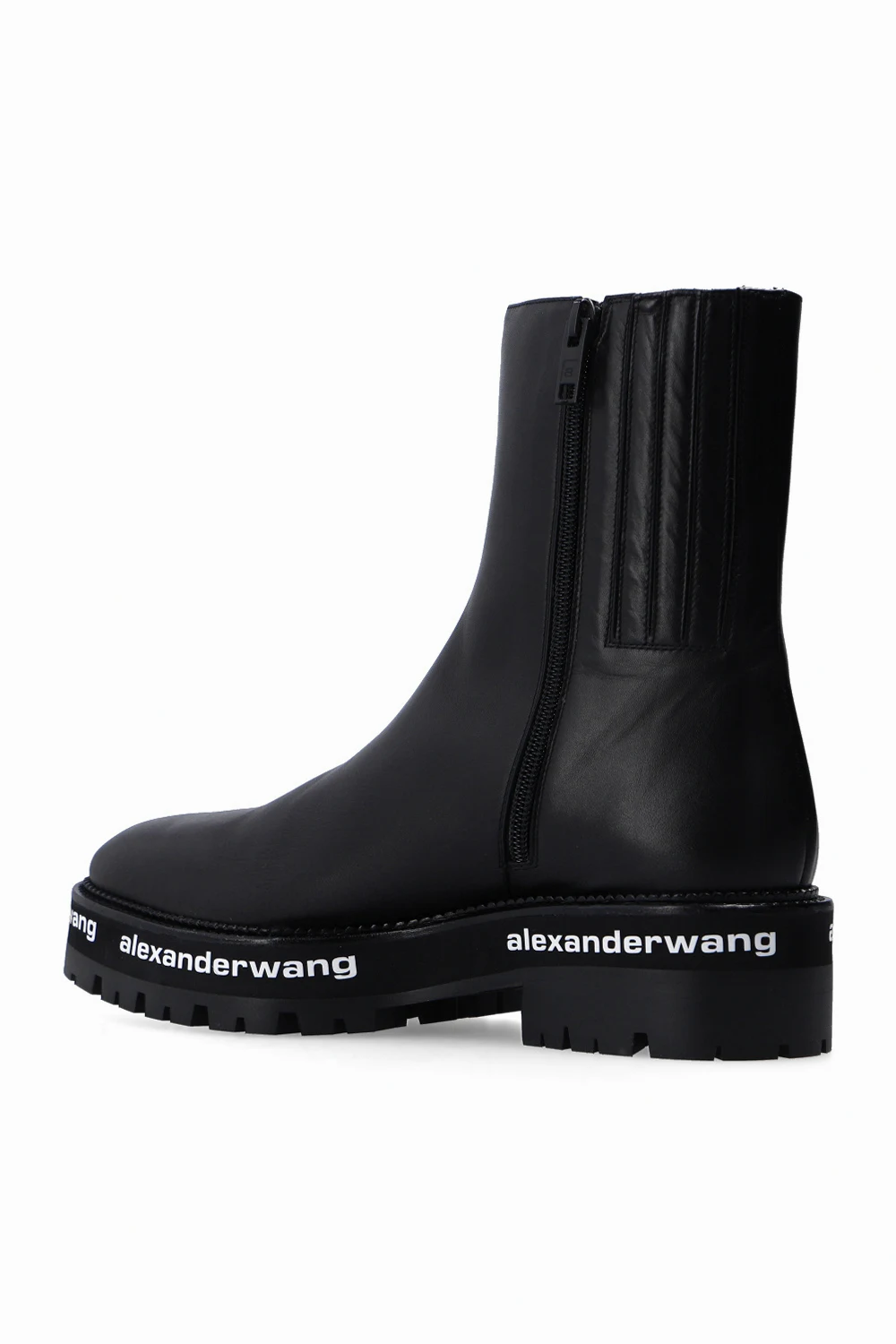 Black ankle boots from Alexander Wang. Made of bovine leather, this model features side zip fastening, decorative stitching details and black rubber sole with white logo prints.