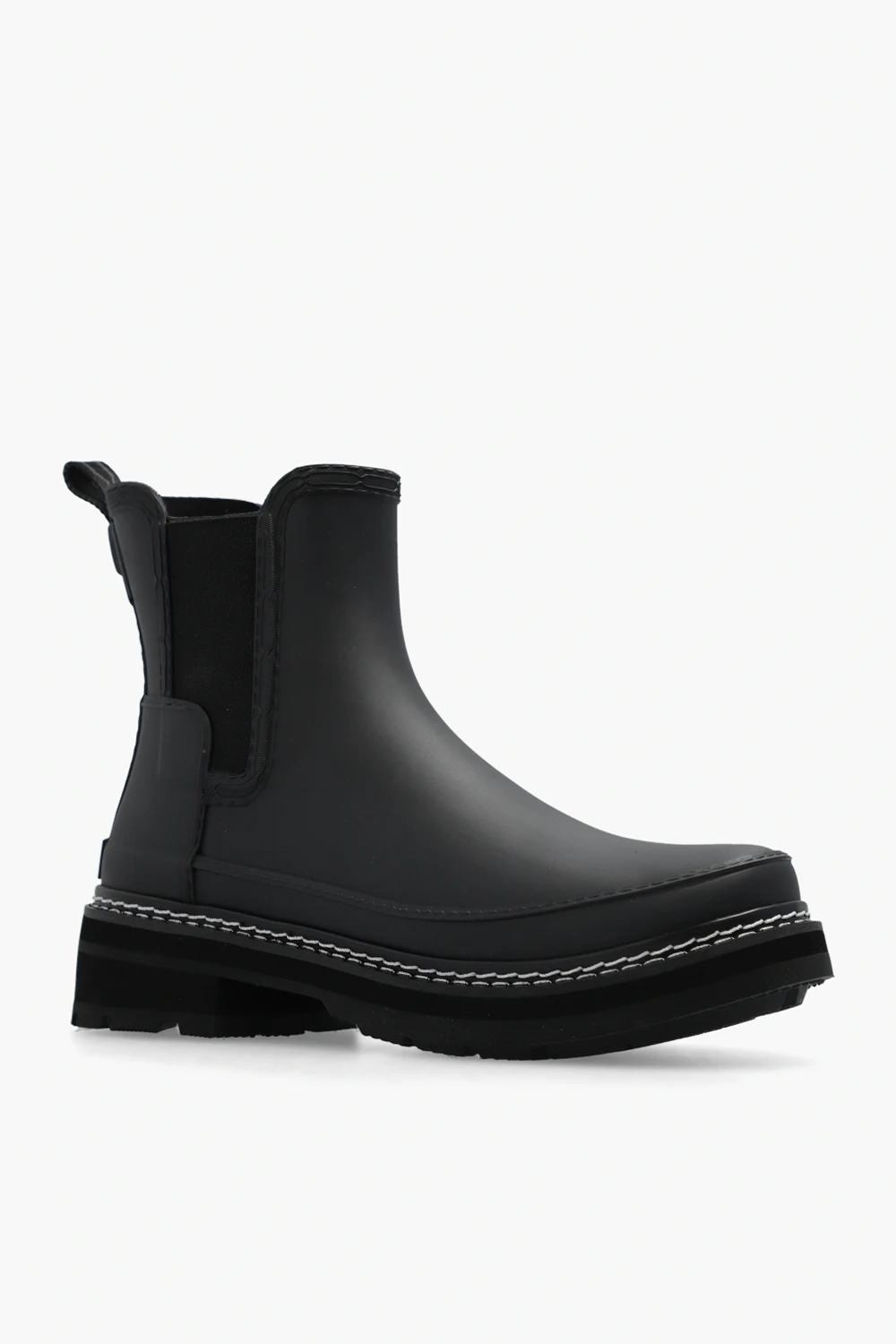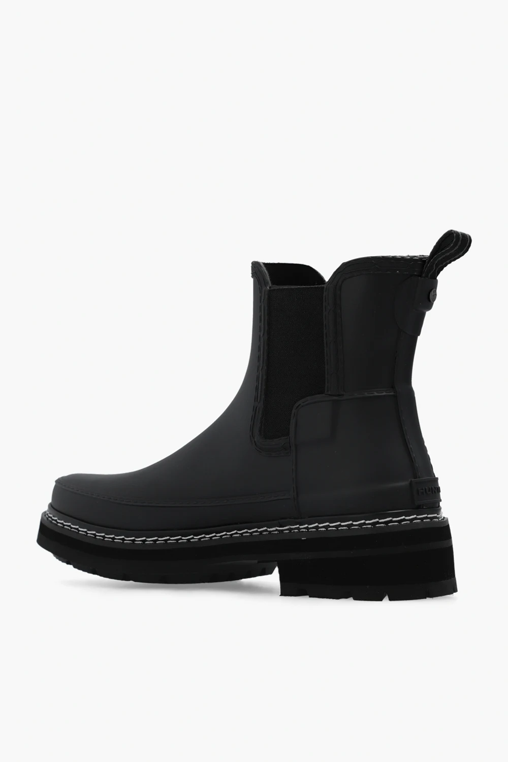 Black ‘Refined Stitch‘ ankle boots from Hunter. Handcrafted from natural rubber, this model sits on a black rubber sole and features a nylon pull-tab and elastic gusset for ease of foot entry, a polyester lining and elastic panels on the sides.