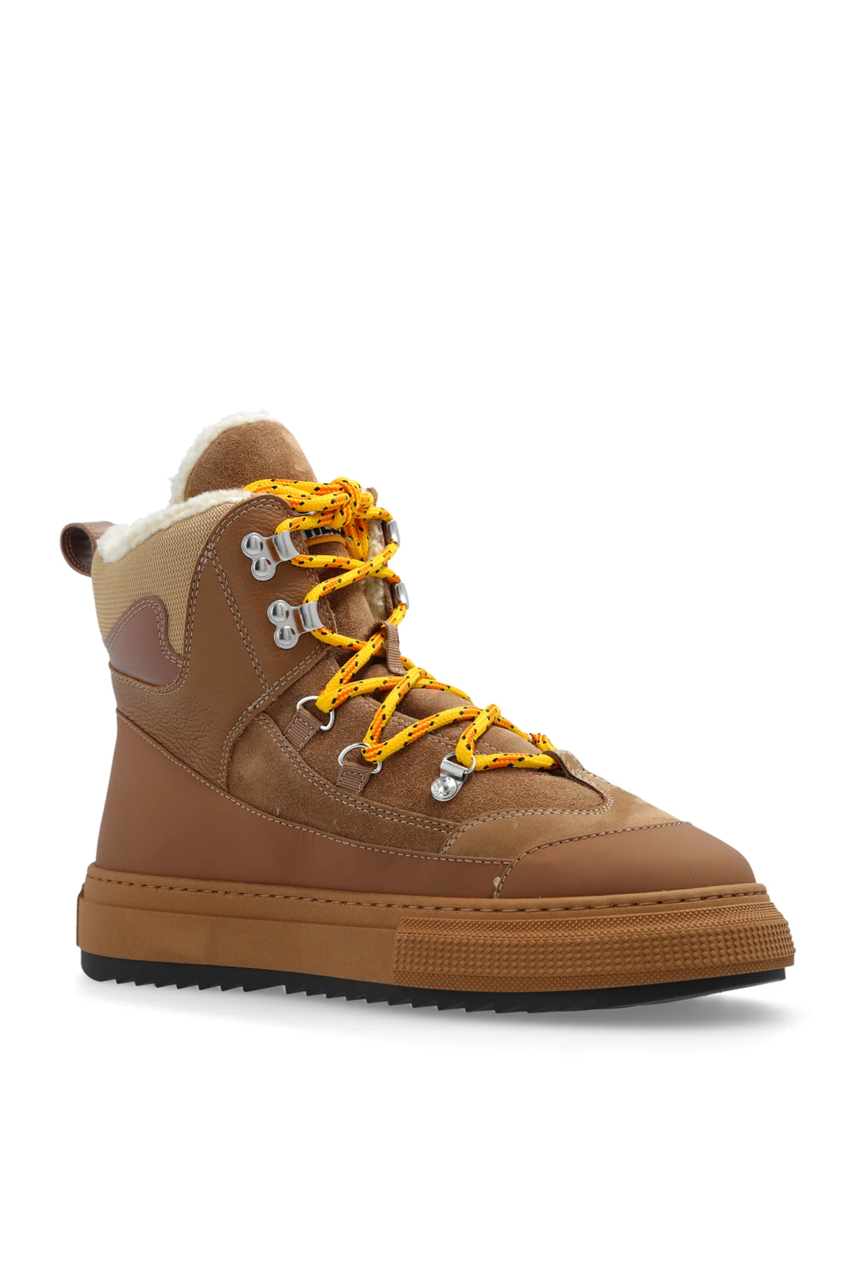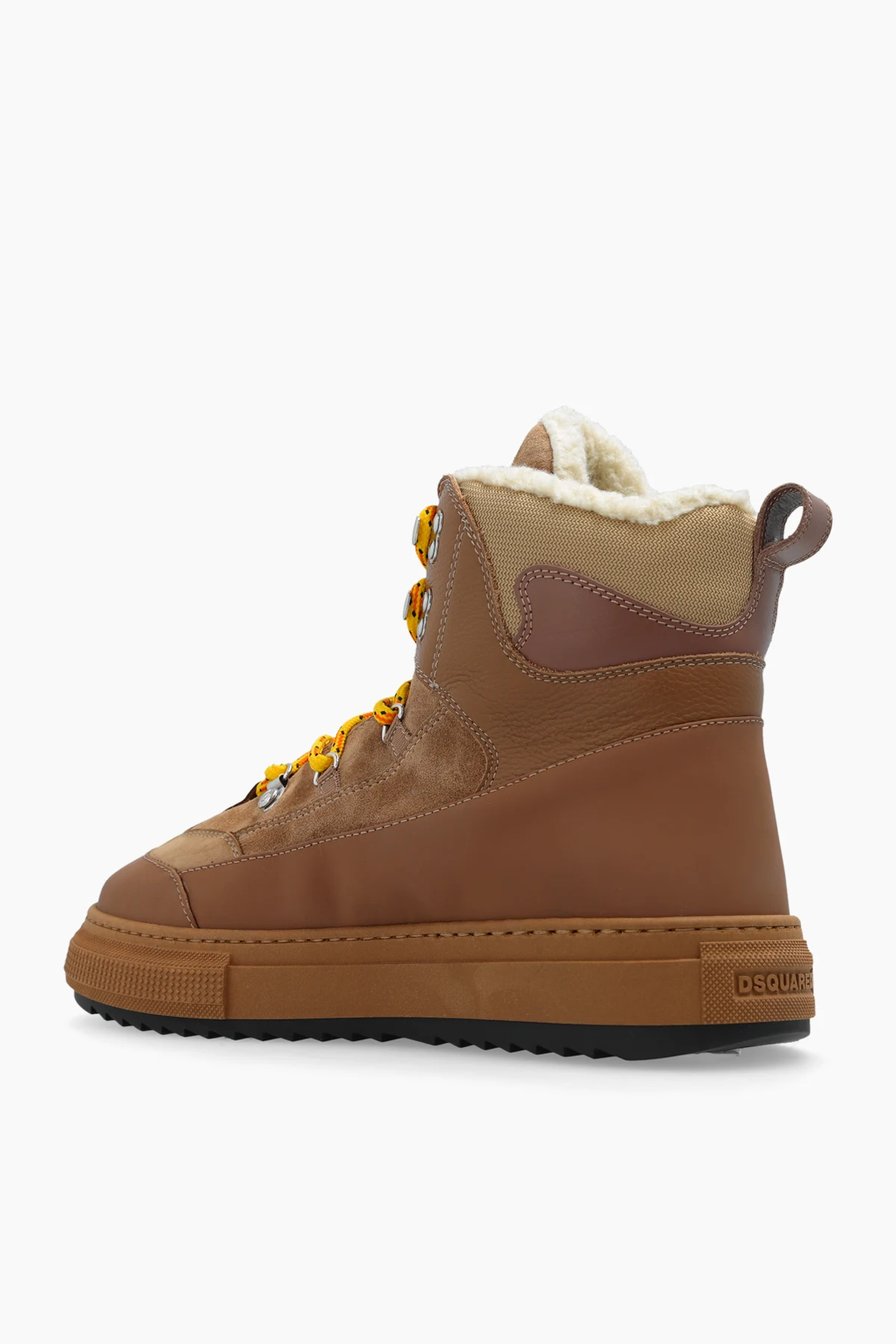 Beige and brown ‘Boogie’ snow boots from Dsquared2. Made from suede and fabric overlays with a high-top silhouette, this lace-up model sits on a black and brown rubber sole and showcases a colourful logo patch on the tongue, colourful, patterned shoelaces and a cream fur lining.