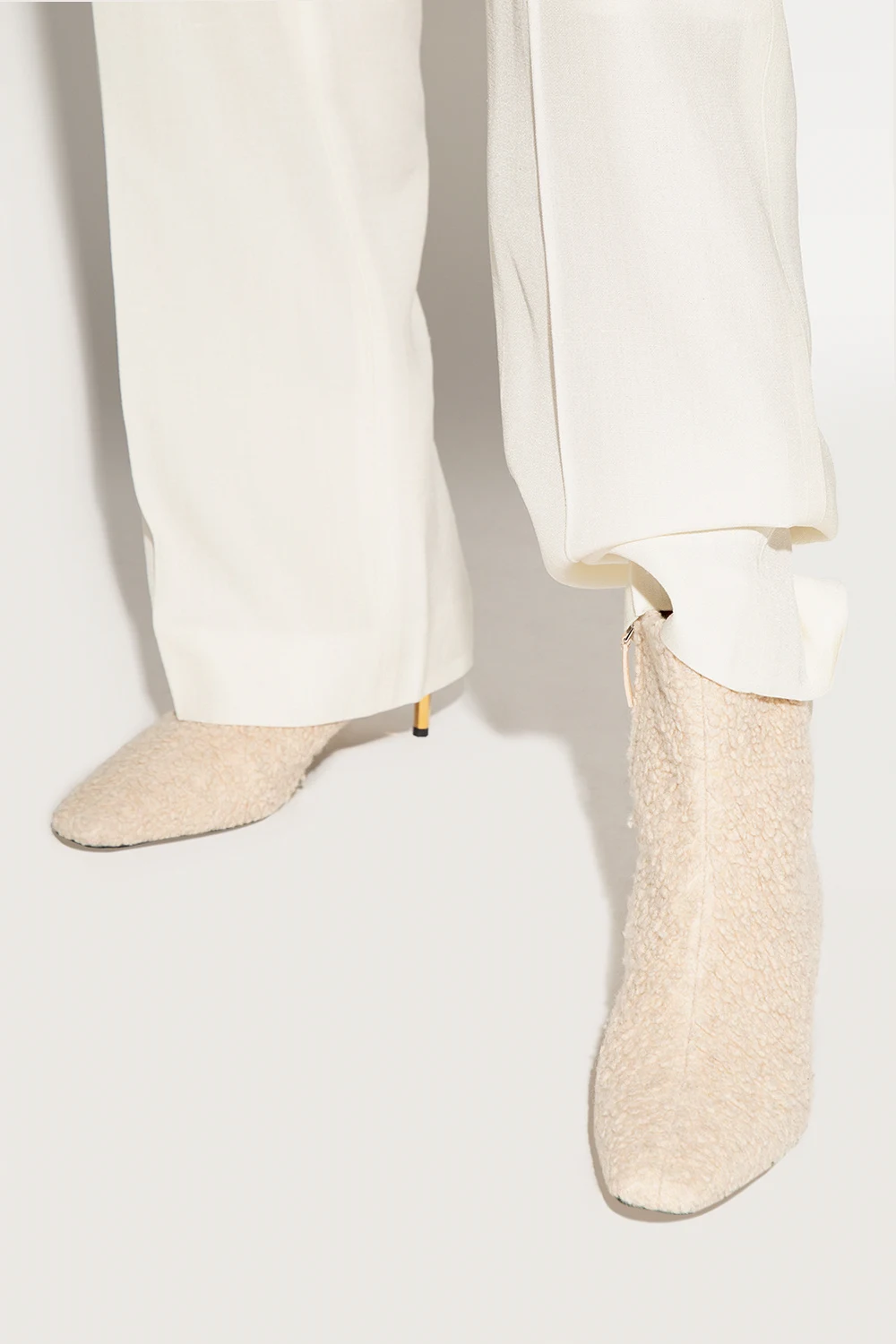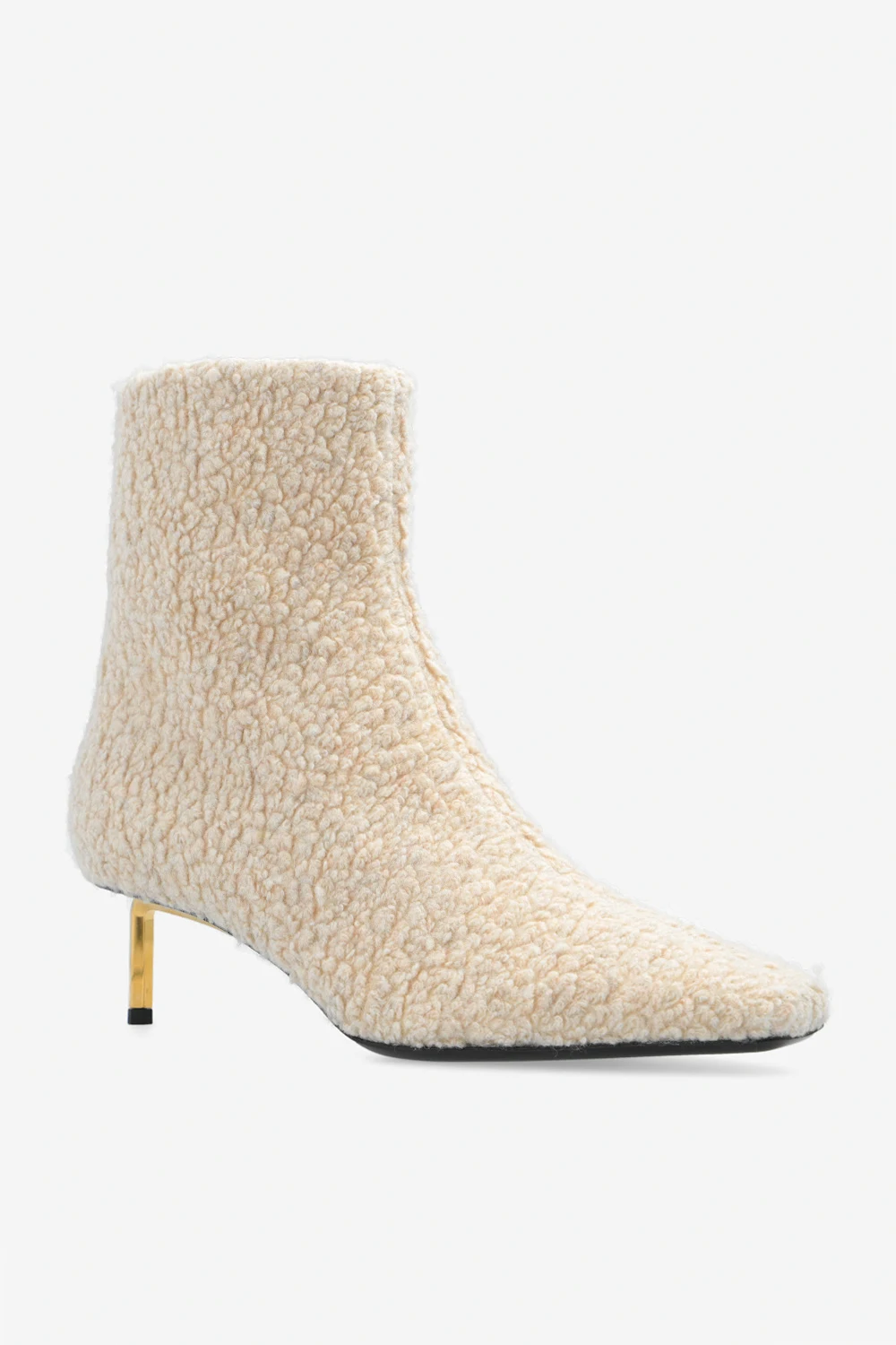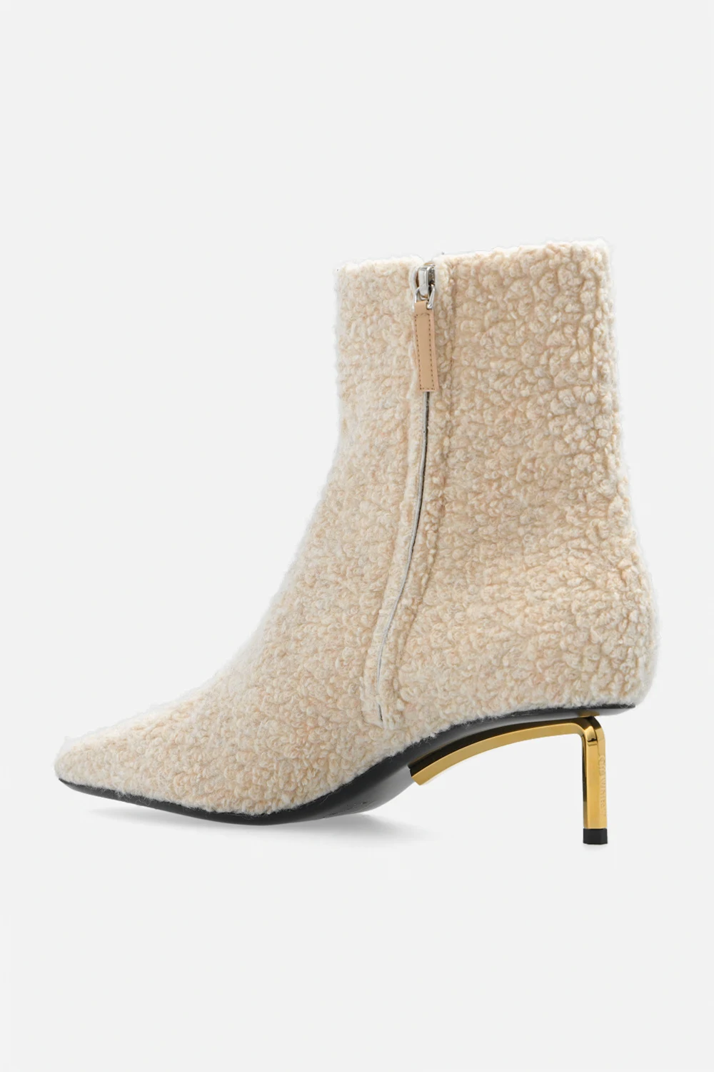 Cream ‘Allen’ heeled ankle boots from Off-White. Crafted from faux fur, this model sits on a black leather sole and features a side zipper and a distinctive gold-tone heel with an engraved logo.