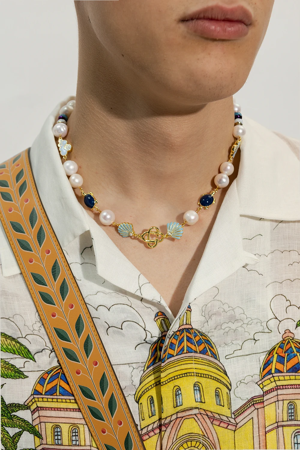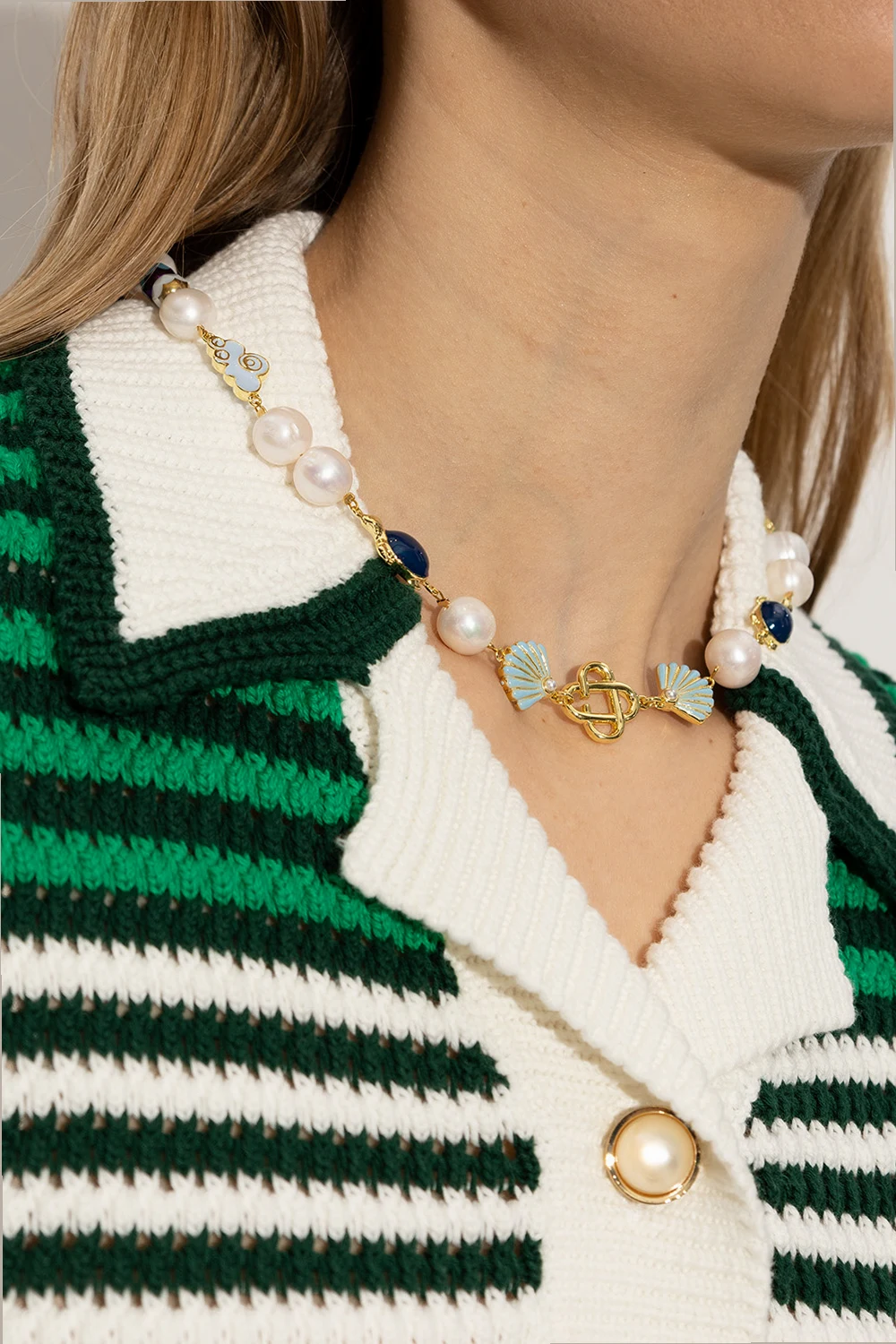 Gold-tone necklace from Casablanca. Crafted from gold-plated brass and trimmed with white faux pearls, this item adjusts via a lobster clasp and features a logo detail and pendants with a motif of shells, turtles and mushrooms covered with colourful enamel.