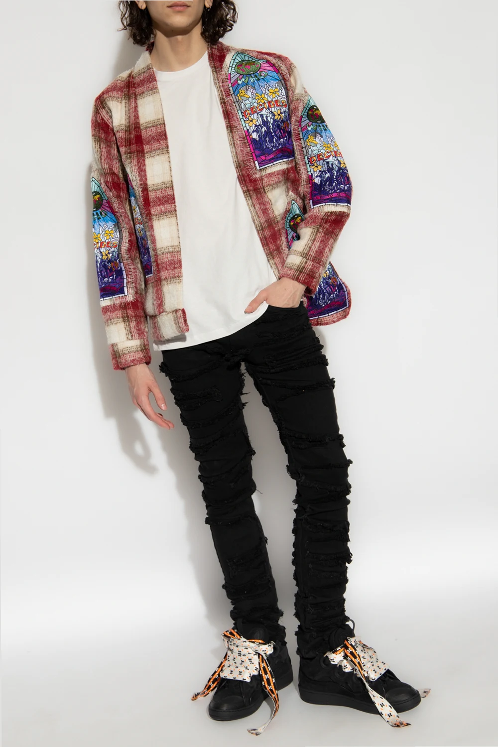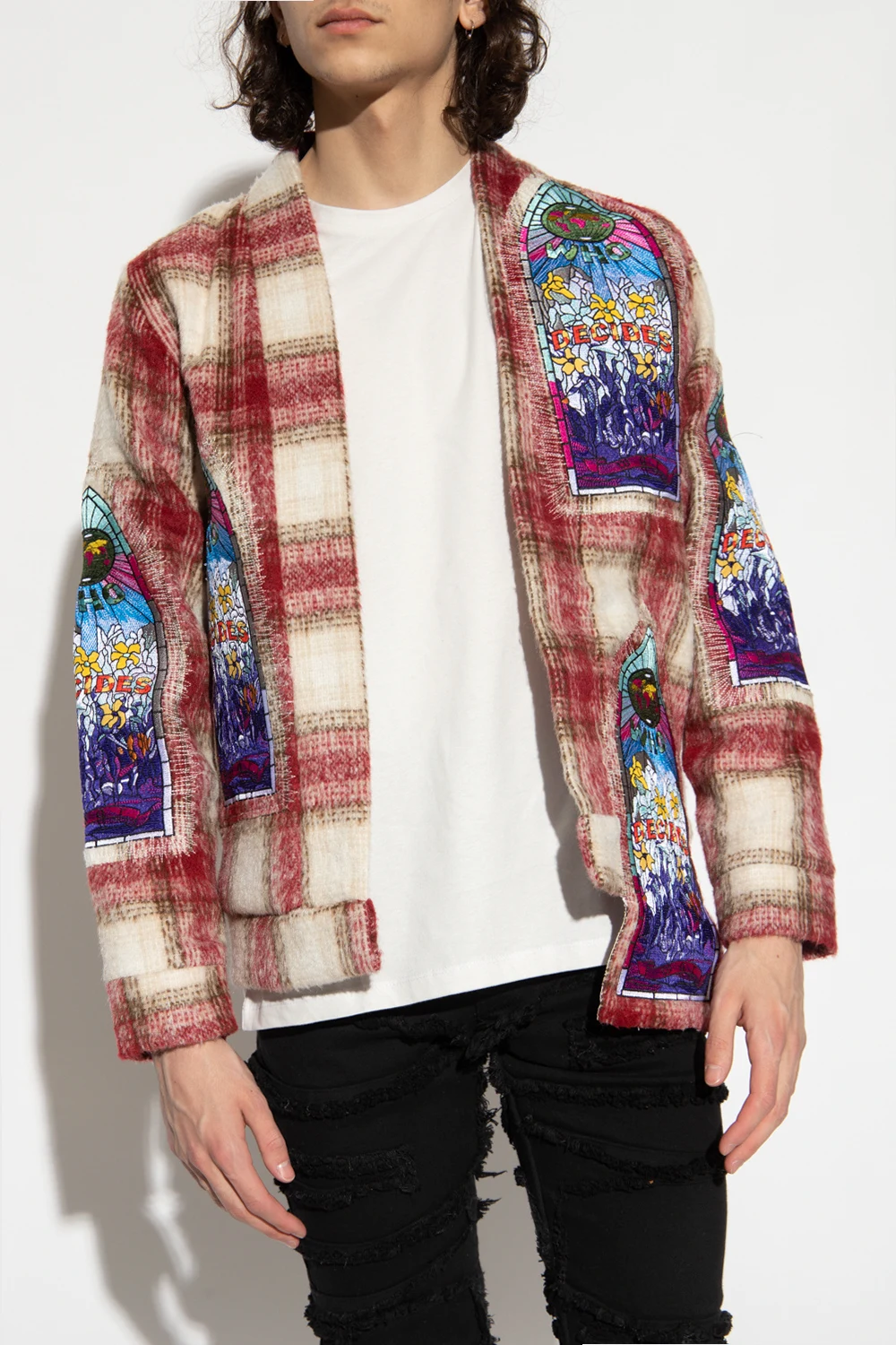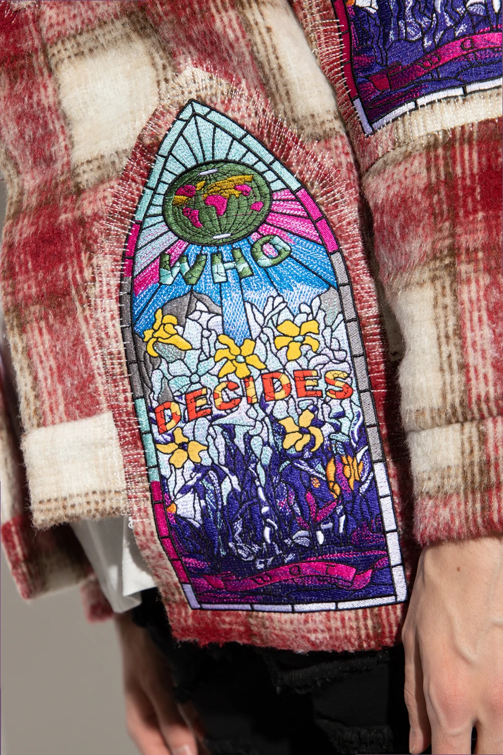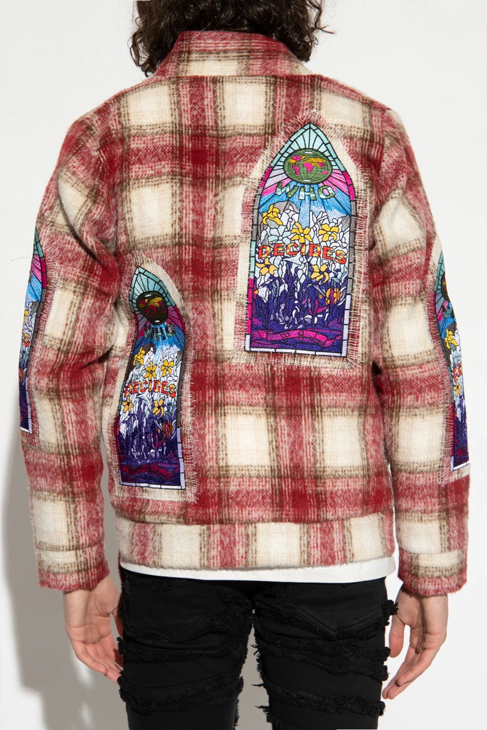Multicolored jacket from Who Decides War. Decorated with a check pattern and stained glass motif, this long sleeve design has two slip pockets and ribbed trims at the hem and cuffs.