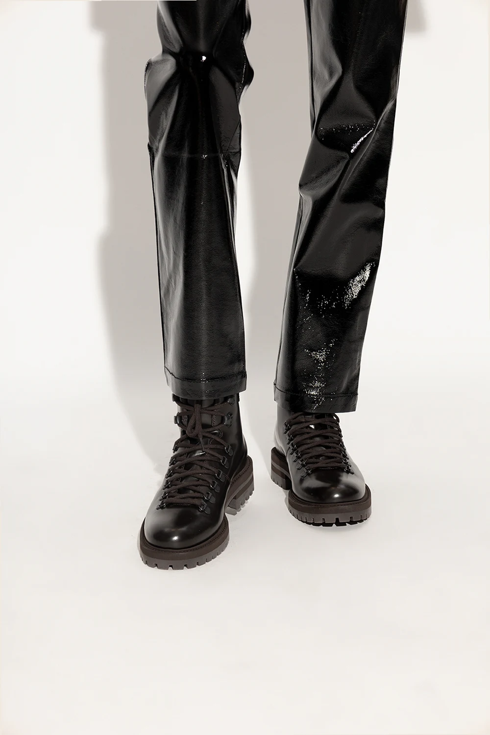 Dark brown ‘Hiking’ boots from Common Projects. Crafted from smooth leather, this lace-up model sits on a dark brown rubber sole and features a gold-tone graphic print. Swappable shoelaces included.
