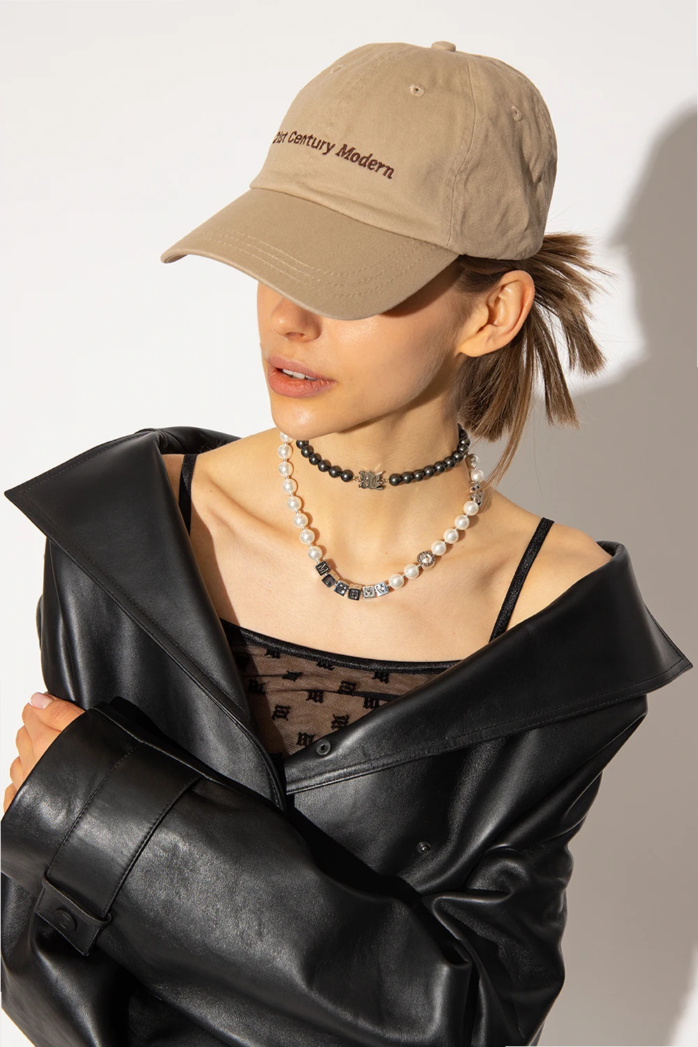 White and silver-tone necklace from MISBHV. Crafted from brass and 925 silver, this item features a lobster clasp closure, shell pearls and decorative logo pendants, including one embellished with crystals.