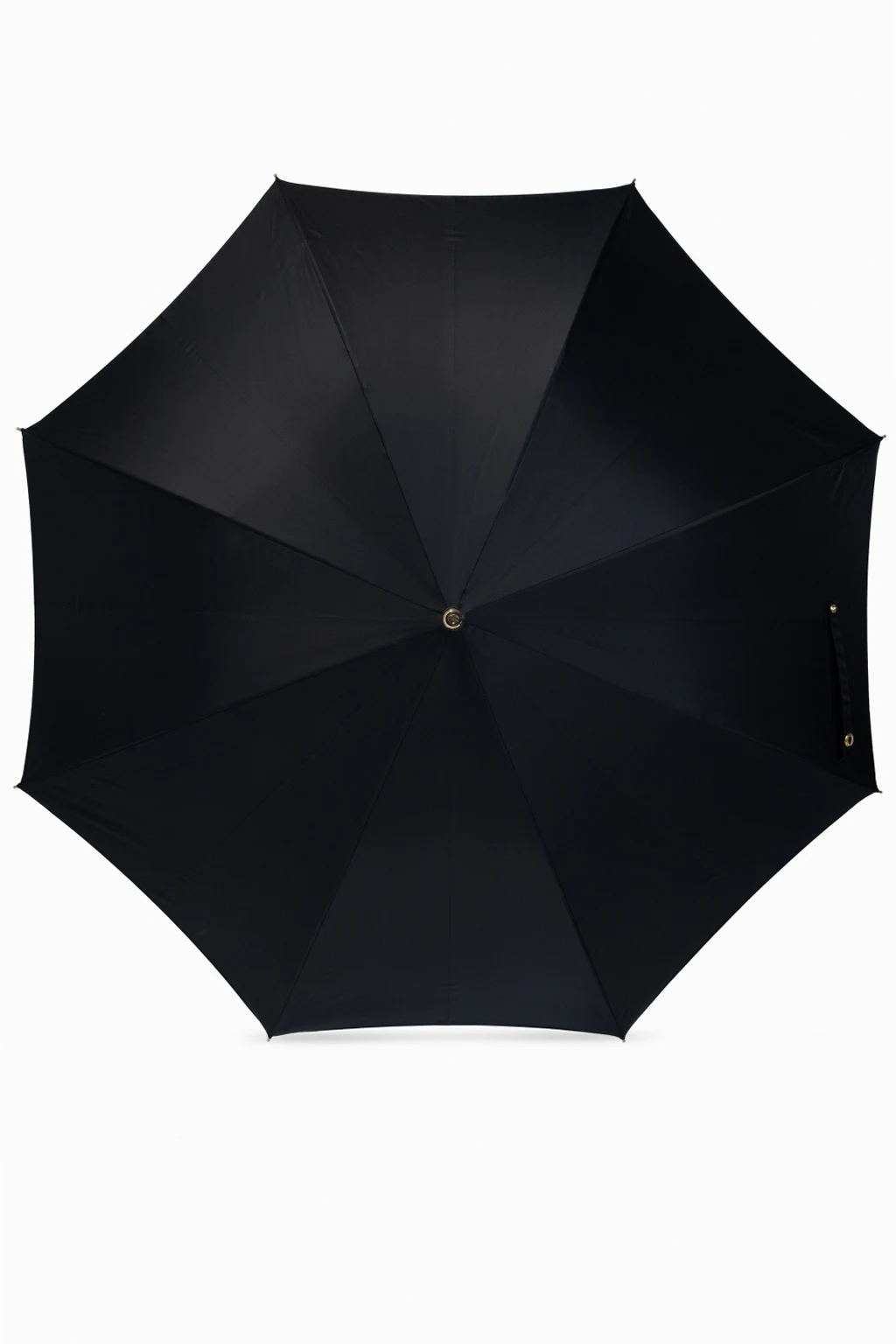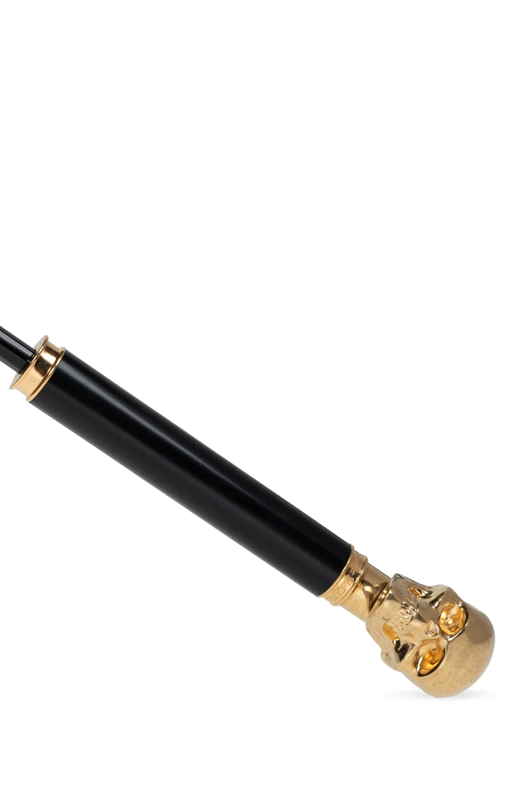 Black folding umbrella from Alexander McQueen. This item showcases a skull-shaped handle in gold-tone metal.