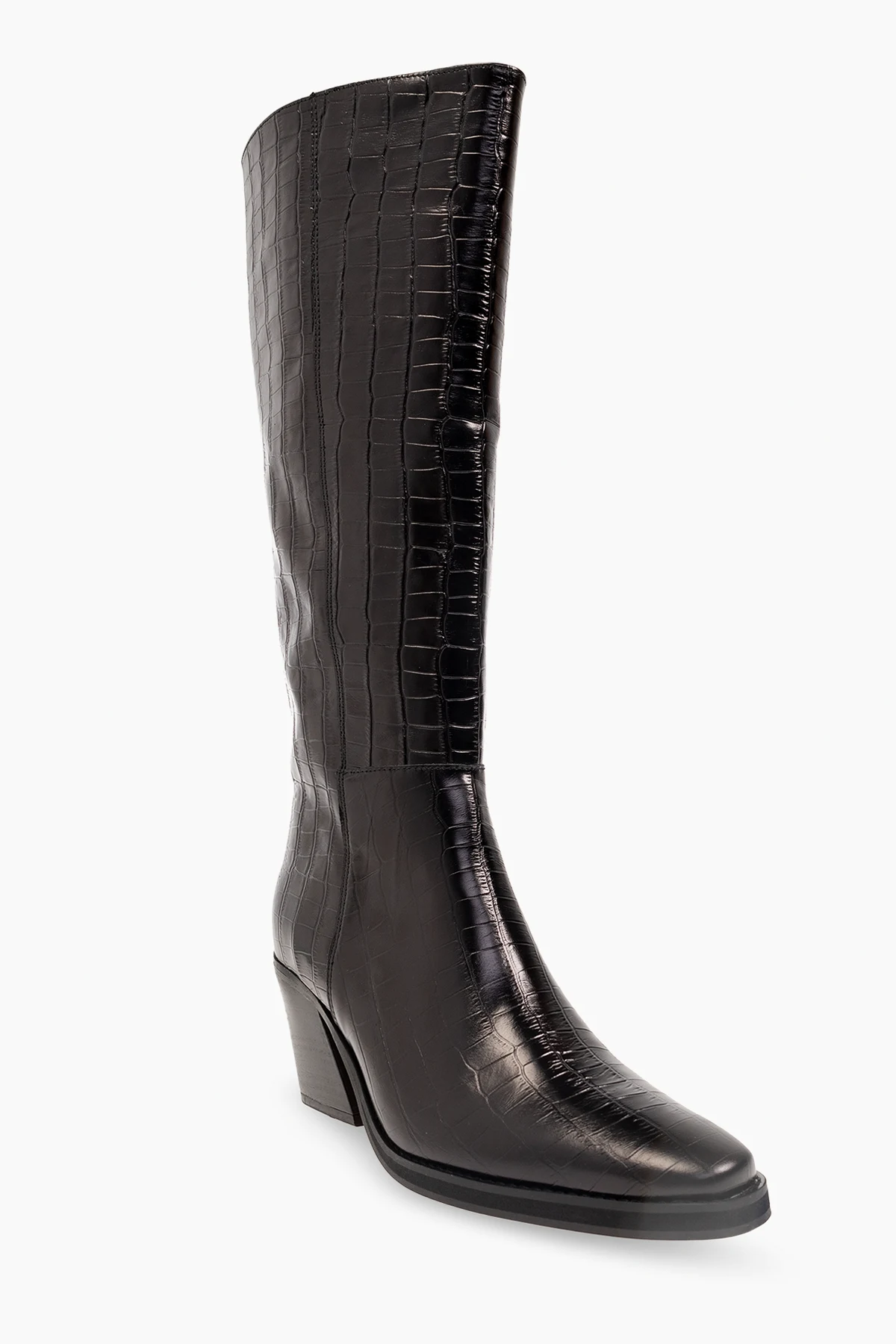 Black ‘Sophia’ boots from Samsoe Samsoe. Made of leather with a crocodile skin effect, this model sits on a beige leather sole and features a round toe and a side zip.