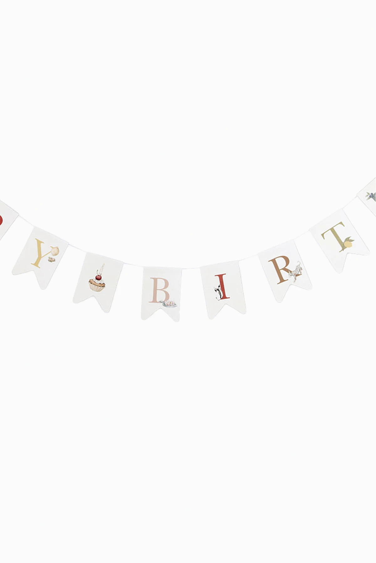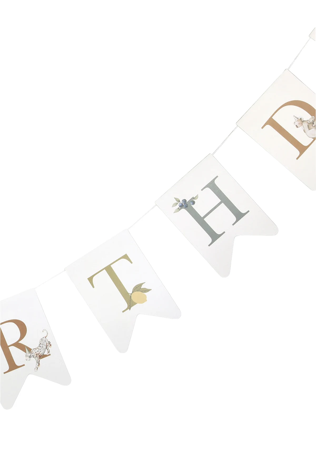 Multicoloured birthday garland from Konges Slojd. Made from FSC-certified cardboard and cord, this item showcases the ‘Happy Birthday’ writing.