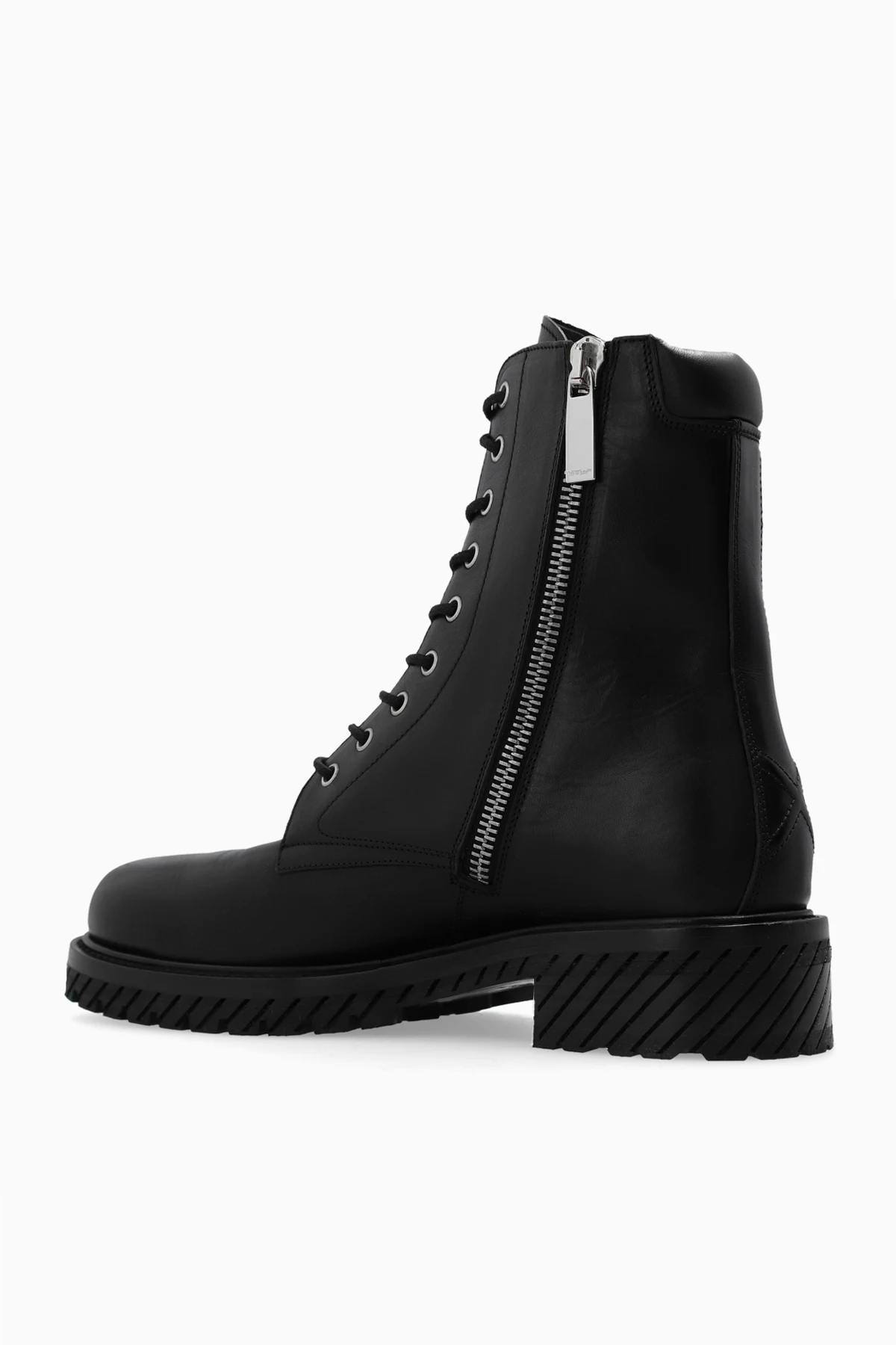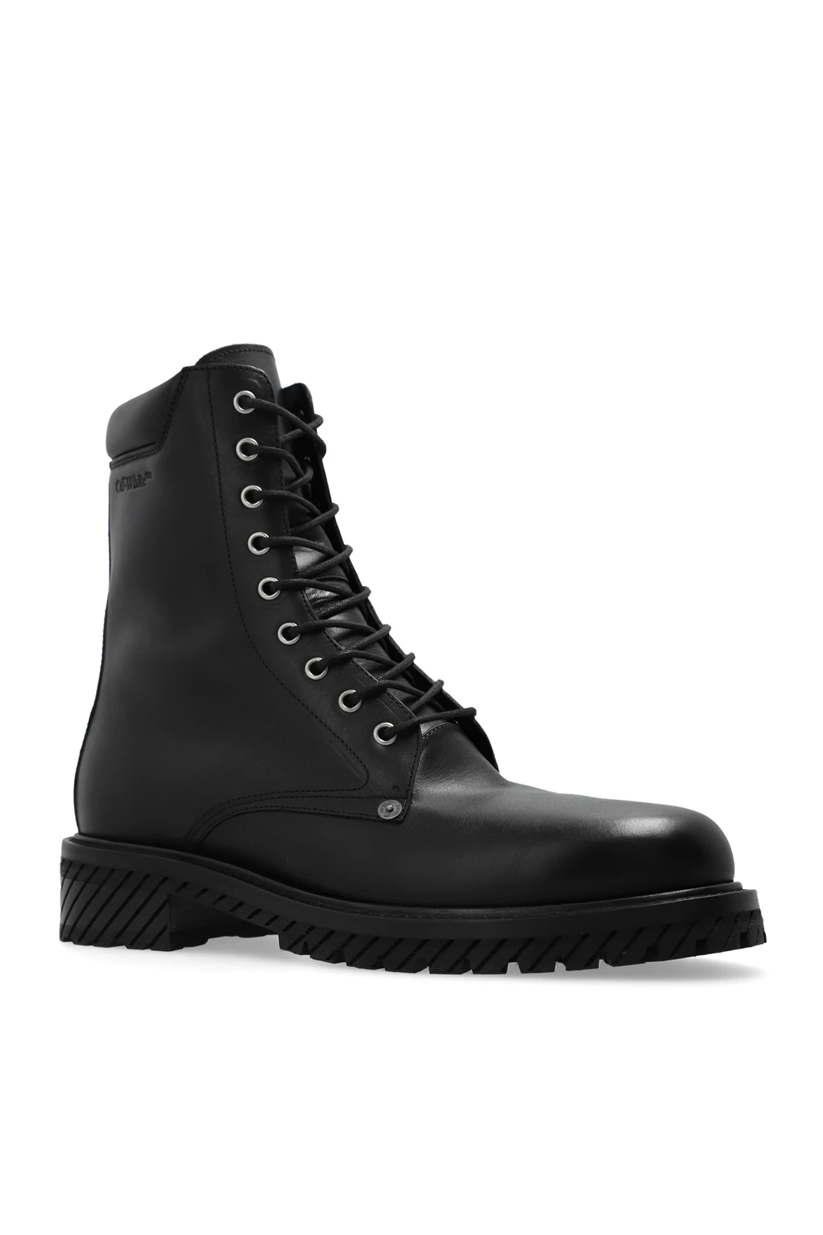 Black lace-up combat boots from Off-White. Made of leather, this pair is decorated with an embossed logo on the side and set on a black rubber sole.