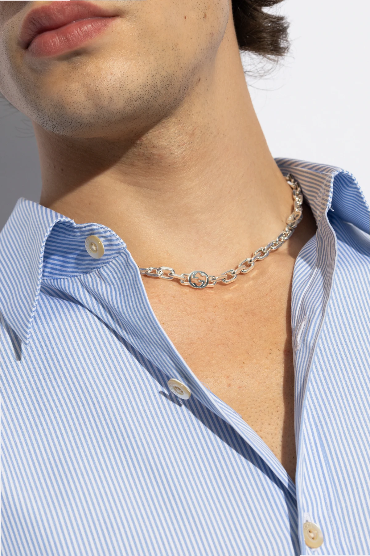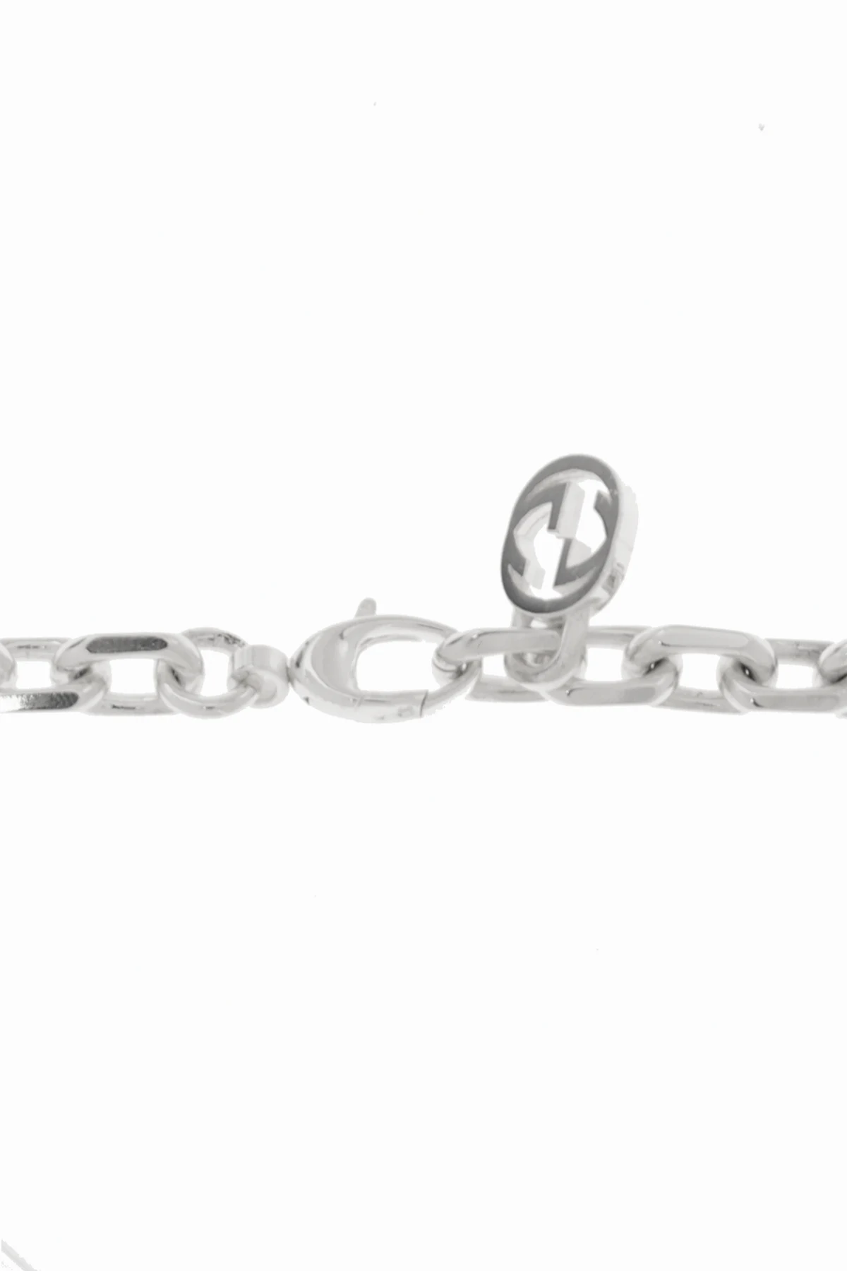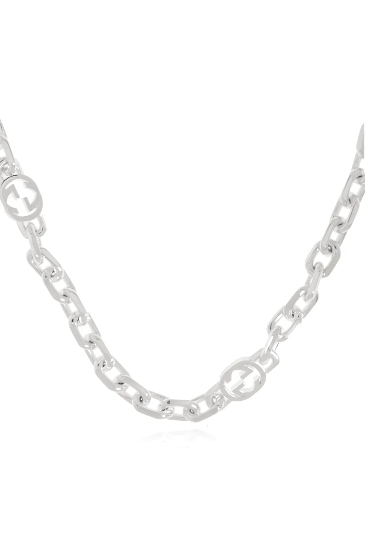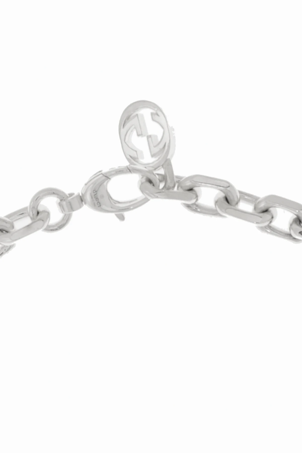 Introducing the epitome of sophistication and timeless style, the Gucci 'GG' Logo Necklace. Crafted with meticulous attention to detail, this accessory is forged from 100% sterling silver (925), ensuring both durability and a lustrous finish. The necklace features large, slightly flattened links, interconnected in a seamless manner, creating an opulent and substantial design. What sets this piece apart is the decorative pattern formed by the iconic 'GG' logo, ingeniously integrated into the links, offering a distinctive and recognizable aesthetic. The inclusion of logo-embellished links even in the clasp highlights Gucci's commitment to excellence and its signature flair, enhancing the necklace's exclusive appeal. Designed to transcend gender boundaries, this unisex necklace is a versatile and bold statement piece, capable of elevating any ensemble. Its silver hue adds a touch of elegance and can seamlessly blend with a wide range of colors and styles. Why Purchase This Product? Exquisite Craftsmanship: Made from high-quality 925 sterling silver, offering longevity and brilliance. Iconic Design: Features the renowned 'GG' logo, symbolizing luxury and unparalleled style. Versatile Elegance: A unisex piece that complements diverse wardrobes and occasions. Attention to Detail: Every link, including the clasp, is a testament to Gucci's dedication to sophistication and detail.
