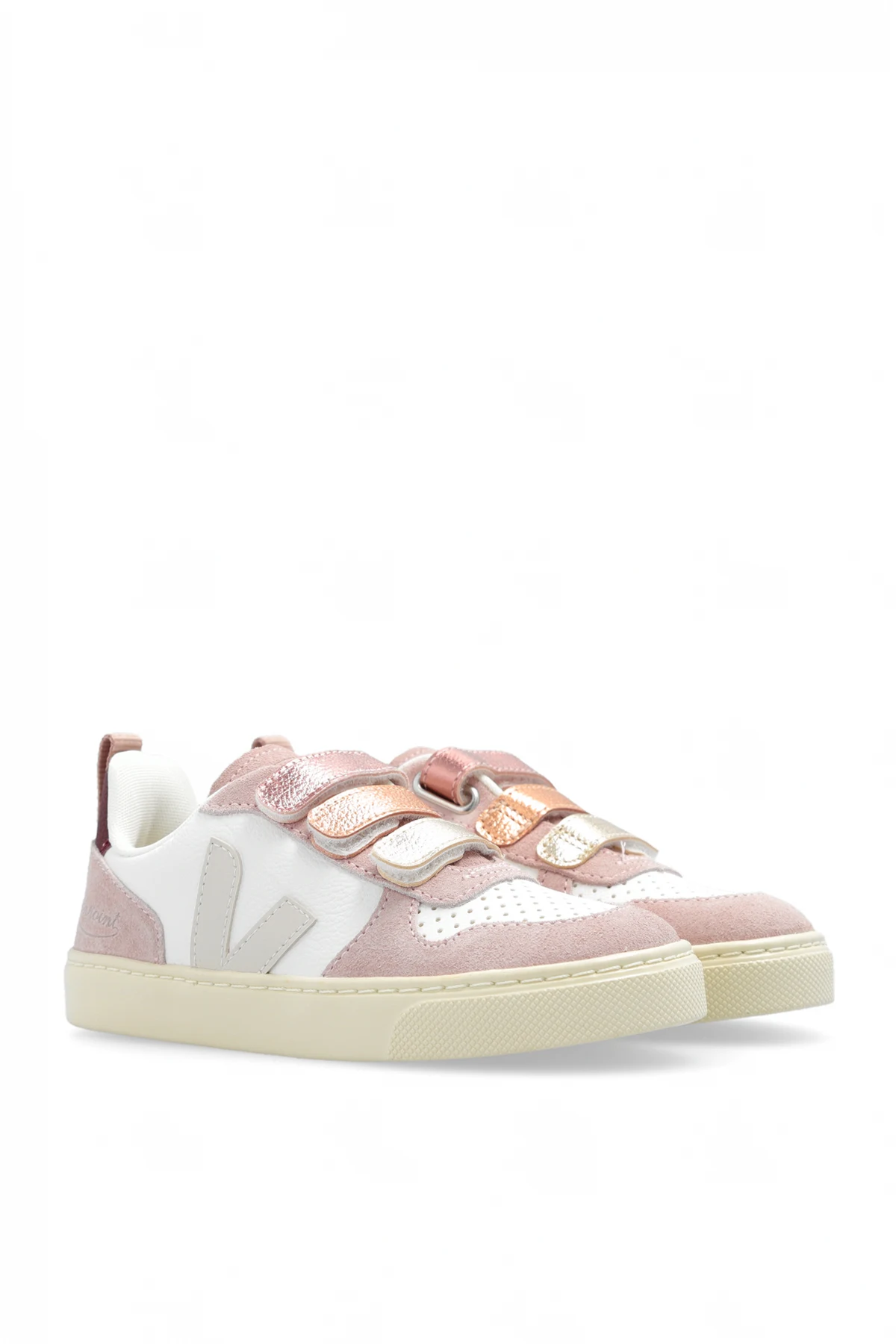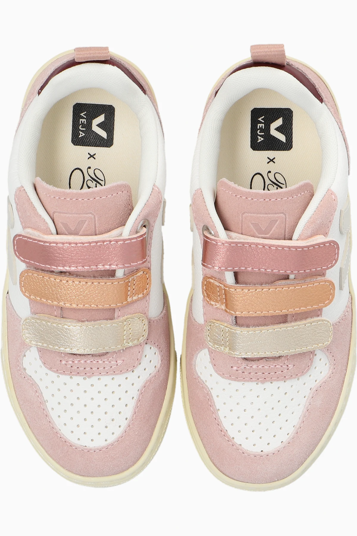 Multicolored ‘Small V-10 Chromefree Leather’ sneakers from Veja x Bonpoint. Crafted from smooth leather and suede, this lace-up model features velcro fastenings with a metallic finish, an embossed logo on the tongue, perforations and organic cotton shoelaces. The mesh inner lining made from recycled materials was developed to acquire a better resistance to friction. The organic-sourced and recycled insole consists of sugar cane, Amazon rubber, organic cotton and recycled EVA. It is set on a cream rubber sole made of organic and recycled materials. This leather undergoes an innovative tanning process where no chrome, heavy metals or dangerous acids are involved. By simplifying the tanning process, the use of chemicals and energy is limited, the use of water is reduced by about 40% and the use of salt by 80%. After tanning, the water is recyclable.