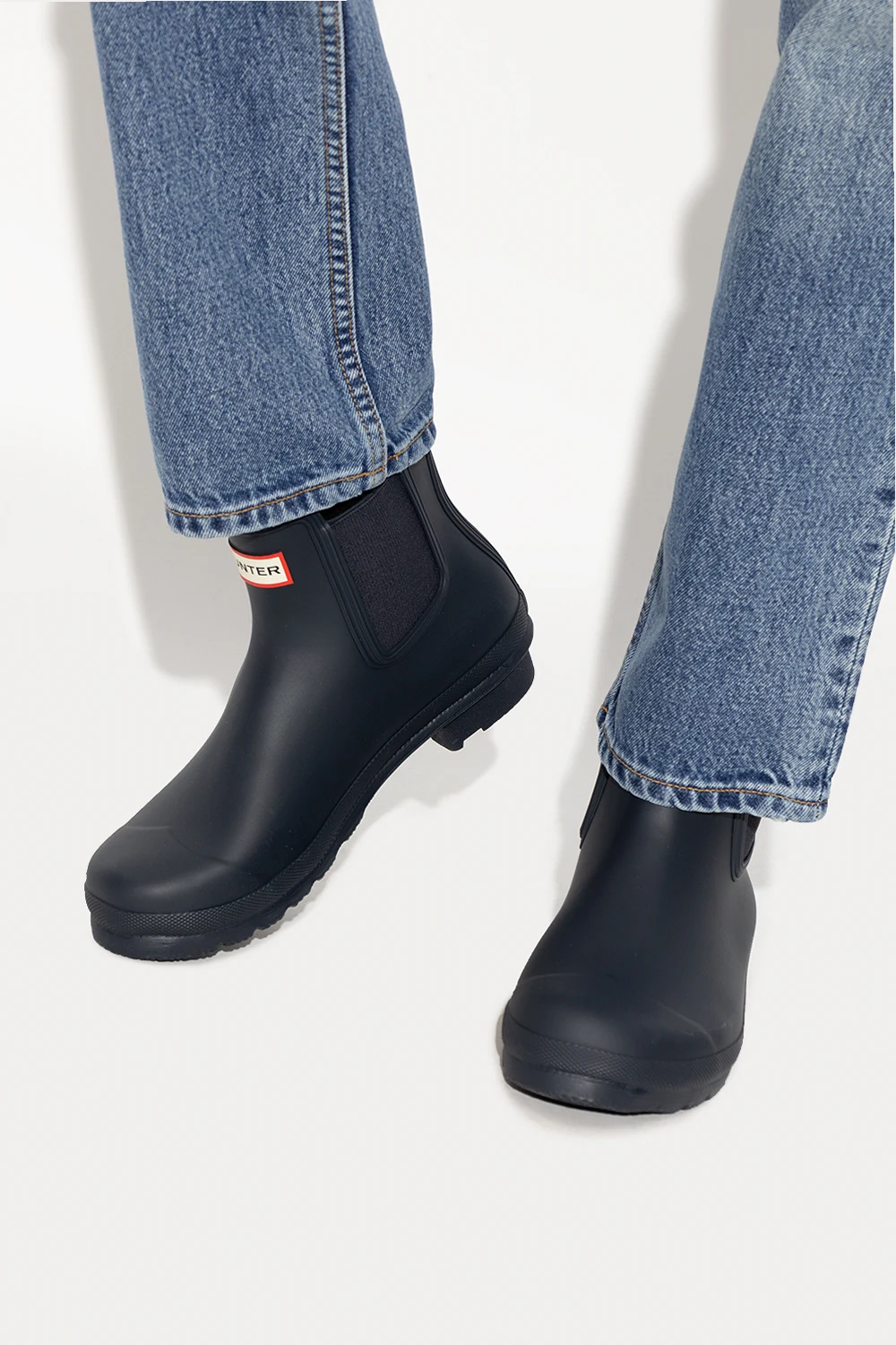Navy blue ‘Original Chelsea’ rain boots from Hunter. Handcrafted from vulcanised natural rubber with a matte finish, this model features a logo application on the front, elastic side panels, a back pull tab and a rubber moulded outsole with Hunter Original tread pattern.