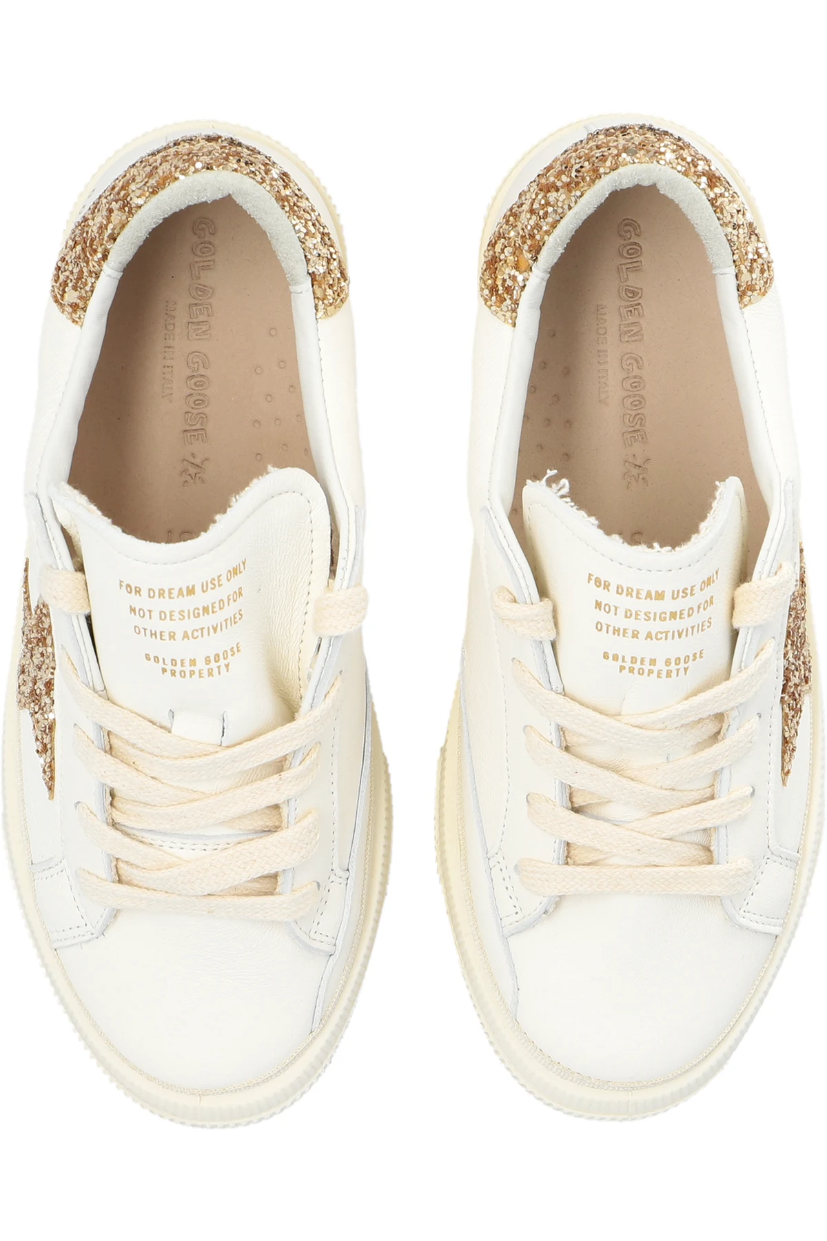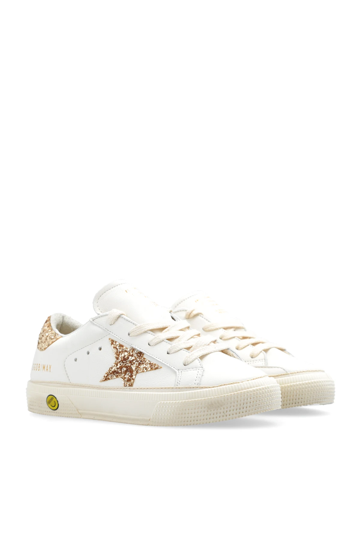 Cream ‘May’ sneakers from Golden Goose Kids. Made of smooth leather and spruced up with gold-tone glitter, this lace-up model sits on a cream rubber sole and showcases a printed logo and a signature star patch.