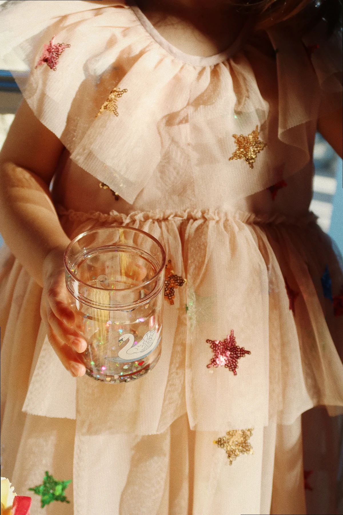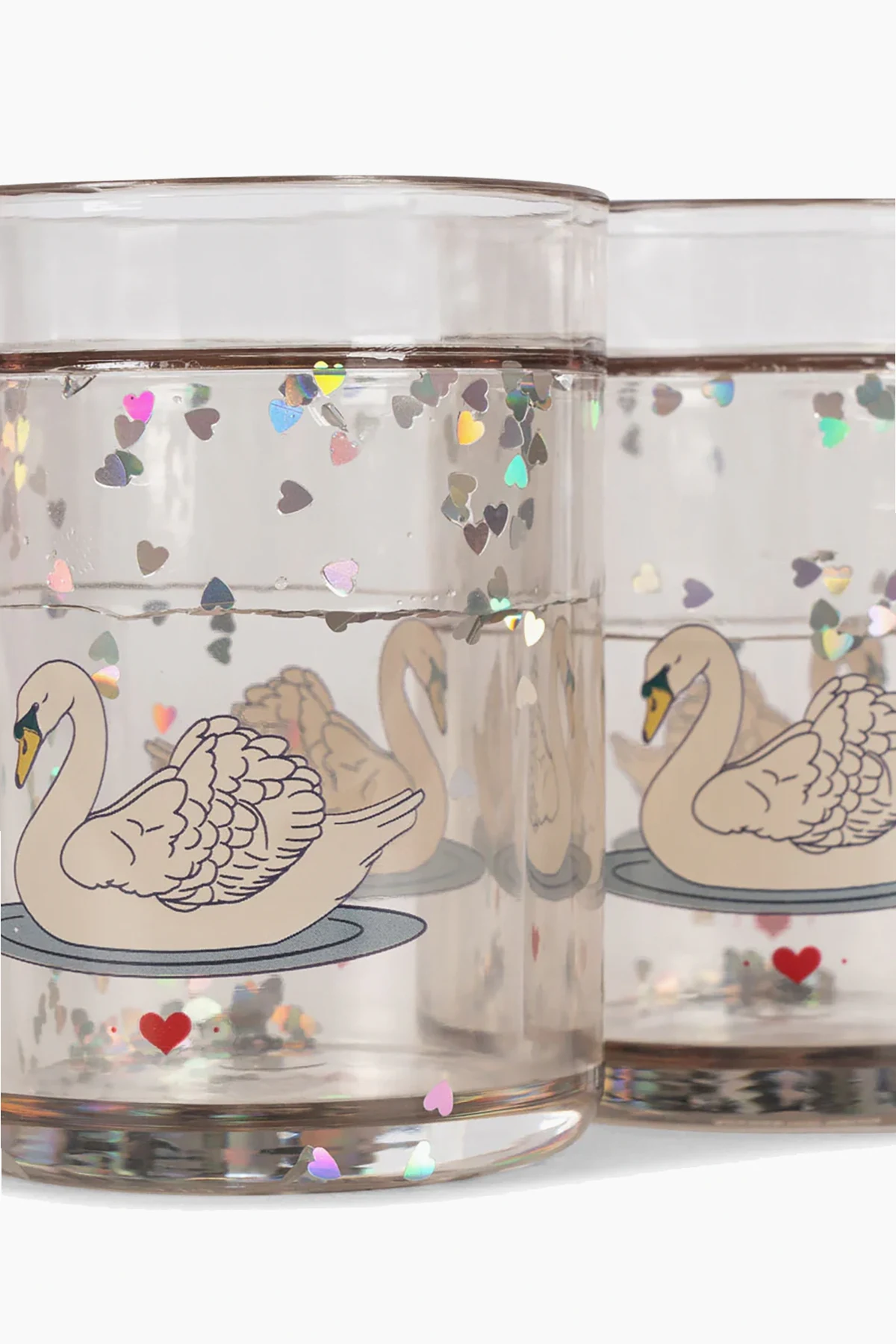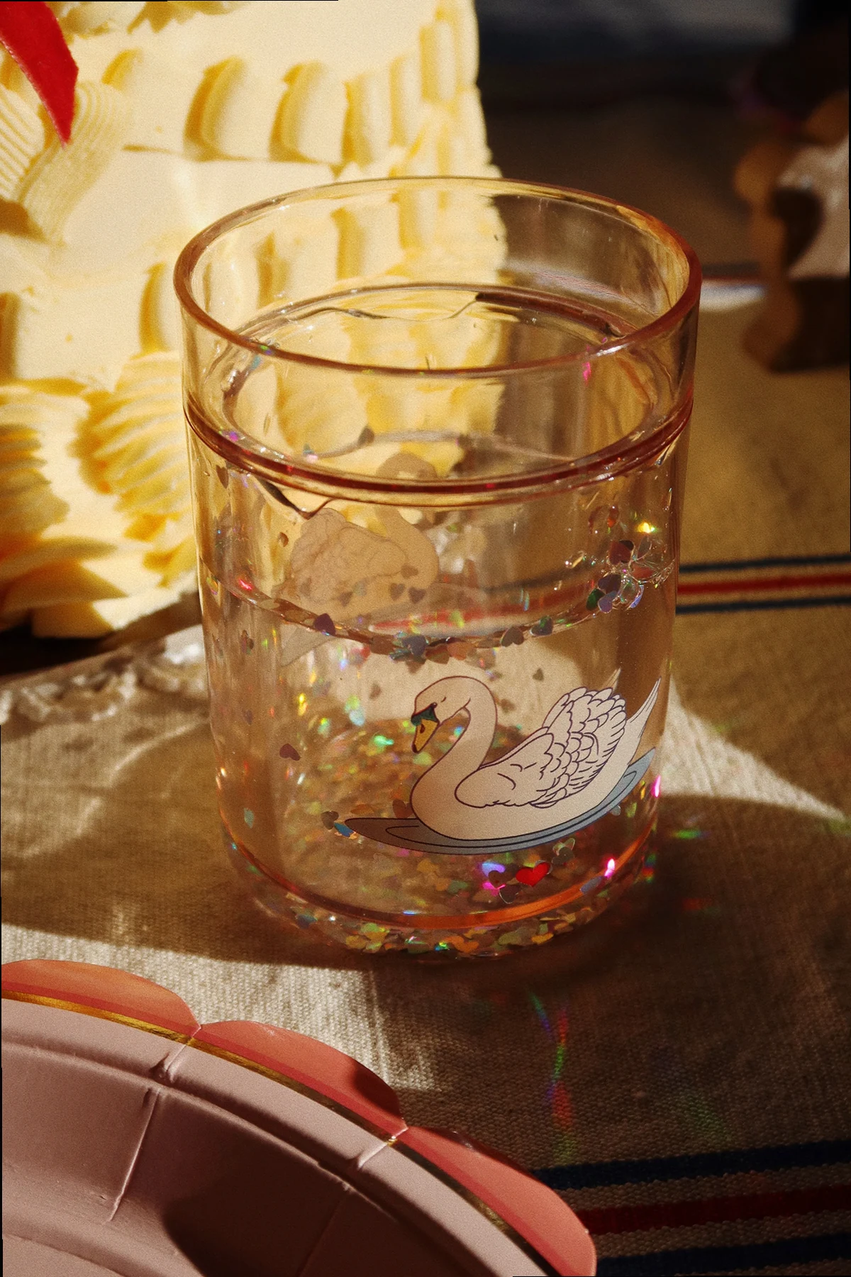 Experience elegance and whimsy with our Set of Two Glitter Cups designed exclusively for children. These cylindrical cups, featuring straight sides and a flat base, are adorned with charming illustrations of white swans gliding on water, complemented by colorful hearts that exude a delightful, childlike appeal. Crafted from high-quality, transparent plastic, these cups are not only safe but also durable for little hands. Inside, a mesmerizing glitter swirls with every tilt, adding an enchanting touch to each sip. Detailed with red hearts at the bottom, these cups are both practical and visually captivating. Why Buy This Product? Made from 100% PCTG, ensuring safety and longevity. Filled with distilled water and PET glitter for a magical effect. Adorned with unique swan and heart prints for a playful design. Complies with EU regulations 10/2011 and 1935/2004 for food contact. Perfect for children aged 3 years and above.