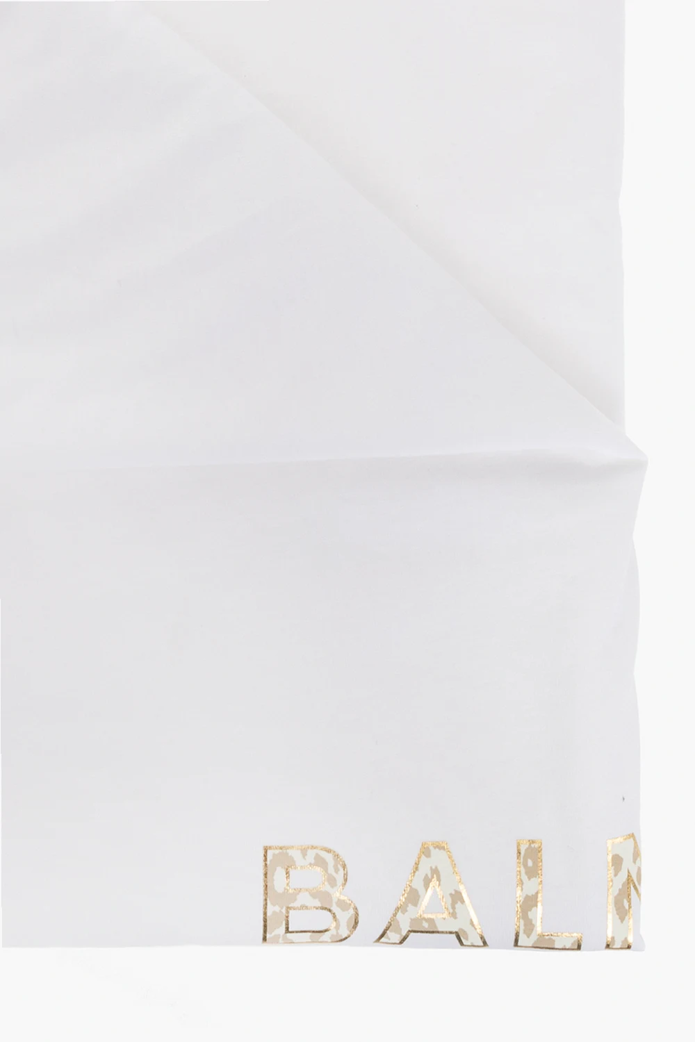White baby blanket from Balmain Kids. Made of cotton, this item showcases a printed gold-tone logo on the front.