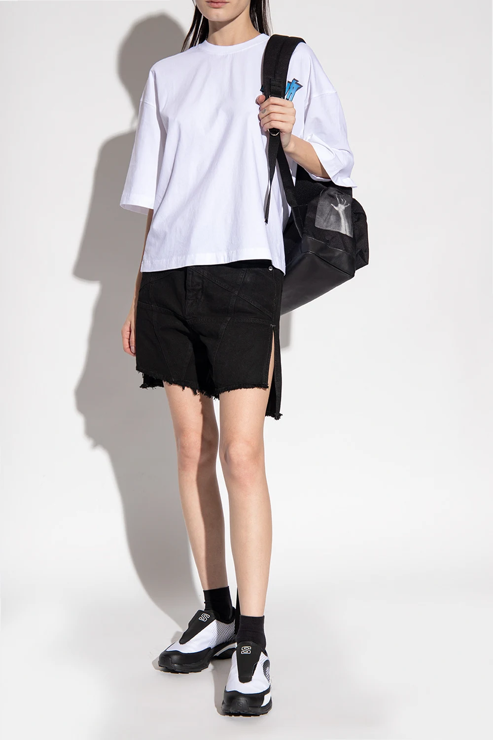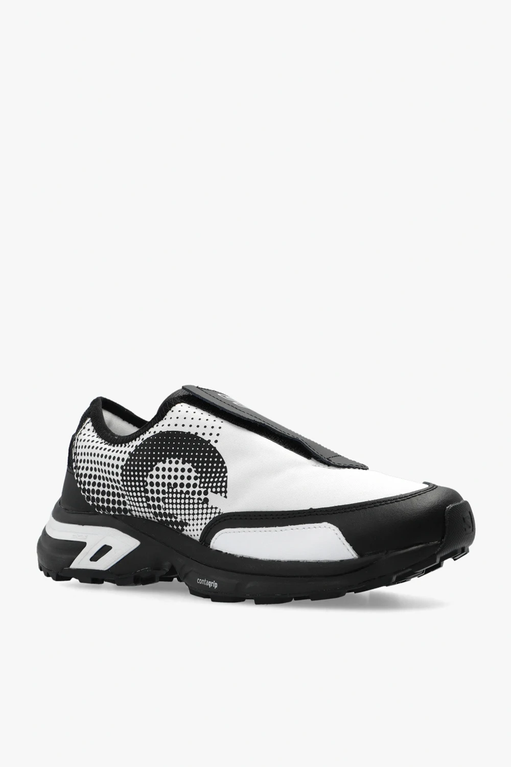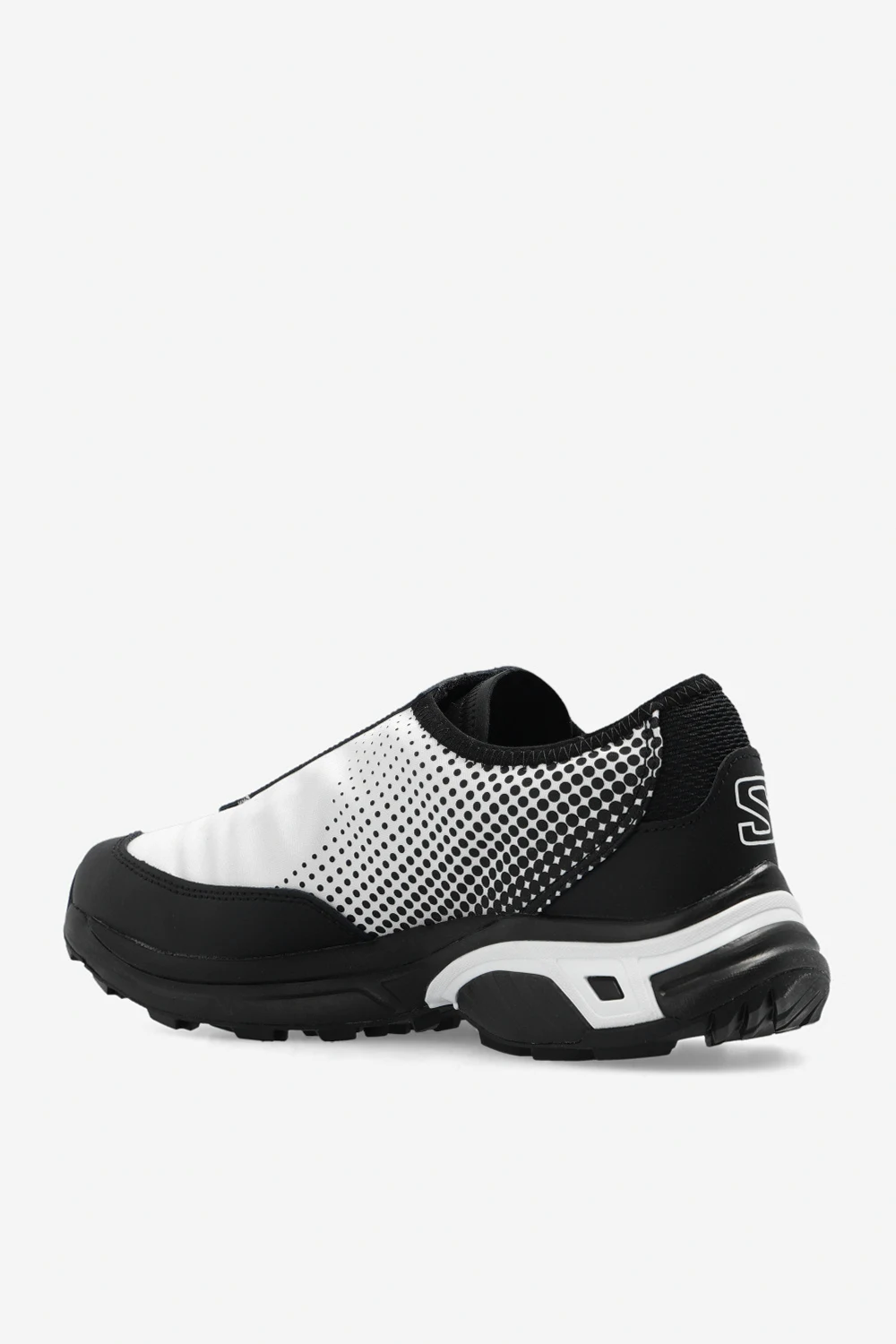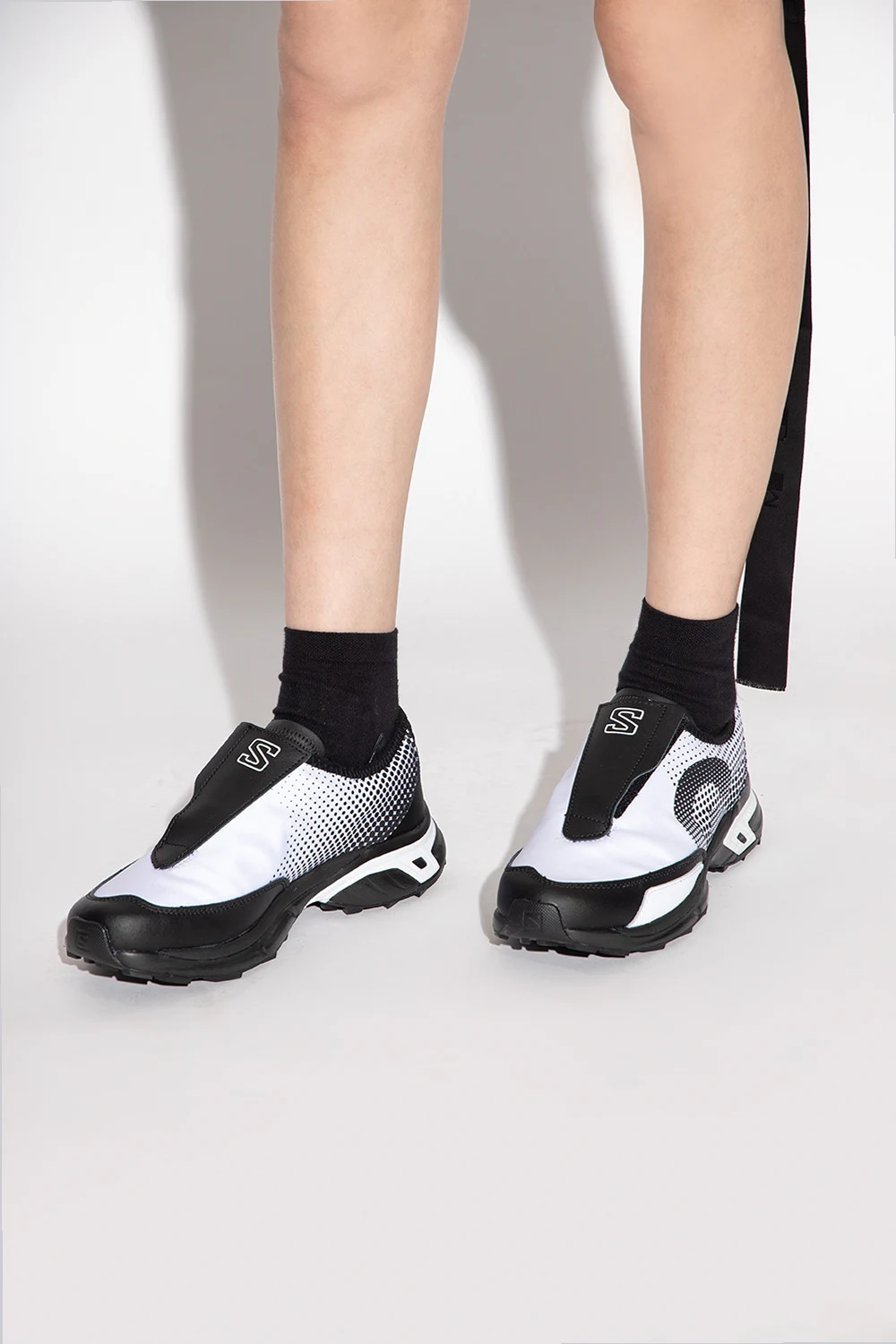 Black and white ‘SR901E’ sneakers Comme des Garçons x Salomon. Trimmed with cow leather in black, this lace-up pair features velcro fastening, black print, and rubber springy and comfortable ‘Energy Surge’ sole in black and white as well as a rubber Contagrip® sole which guarantees grip. Inspired by mountaineering and cross-country skiing, this shoe is reminiscent of the popular XT-WINGS 2.