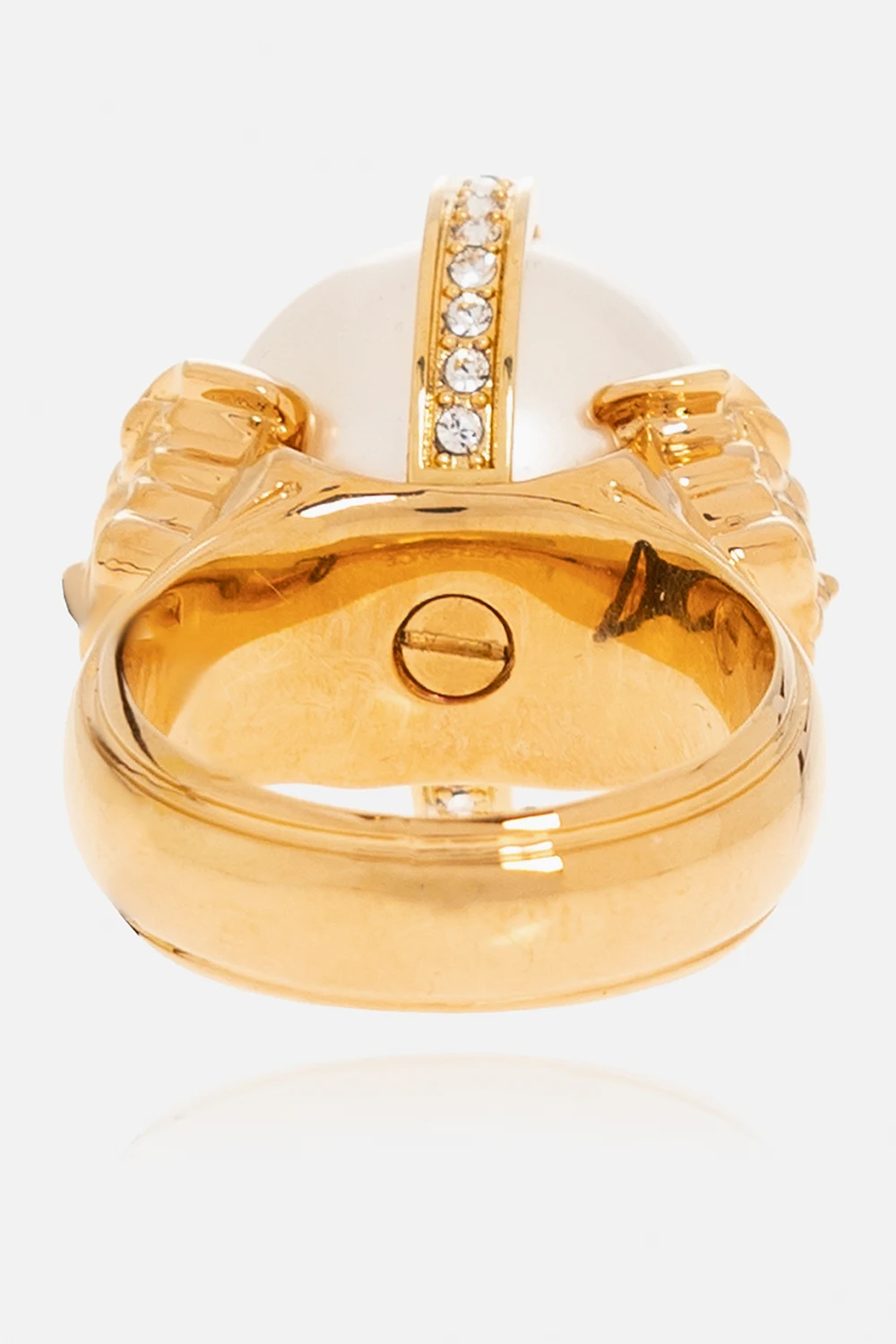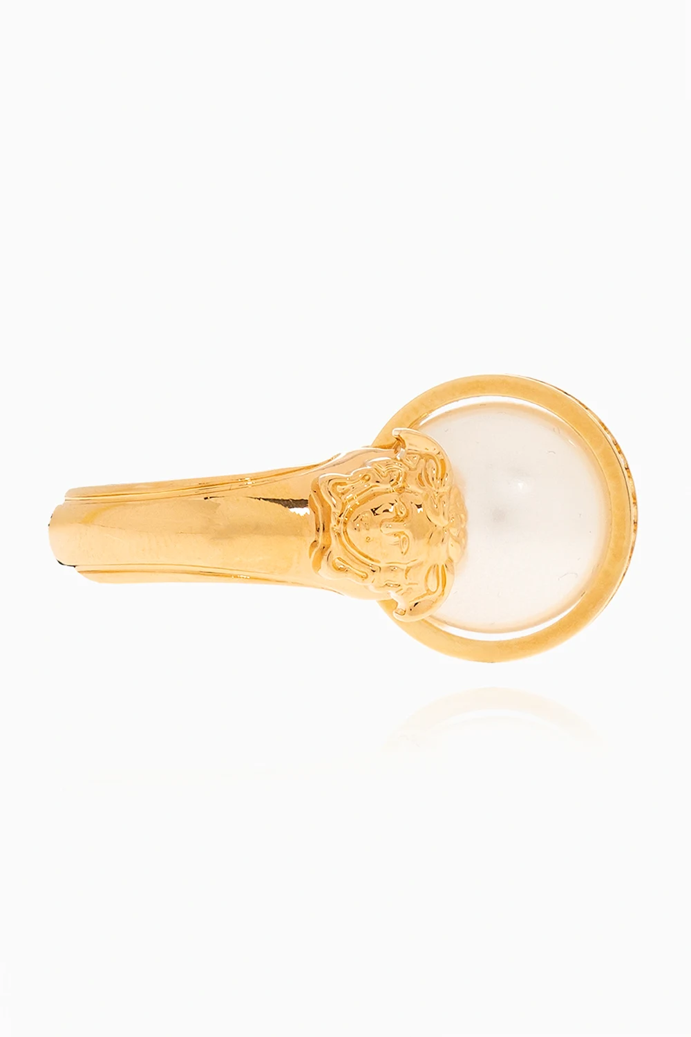 Gold-tone ring from Versace. Distinguished by the brand's signature Medusa on the sides, this item features a white faux pearl and glossy rhinestones. All Versace jewellery products are lead and nickel free. All the materials are hypoallergenic.