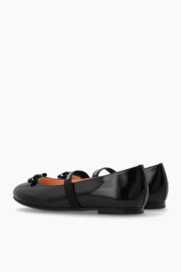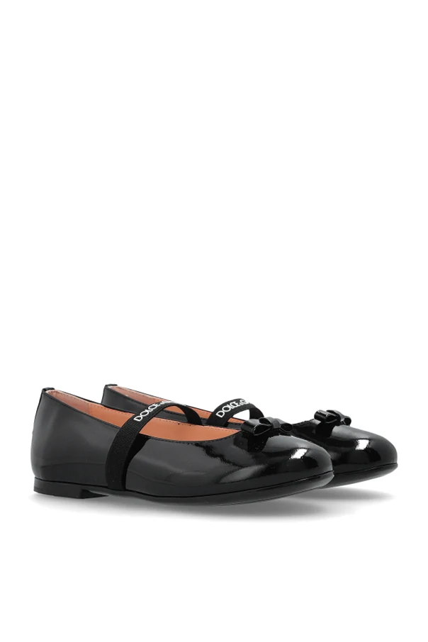 Embodying beguiling sophistication, these leather ballerina flats by Dolce & Gabbana Kids are an exquisite statement for young connoisseurs of style. The lustrous, patent leather exterior in timeless black reflects an unfailing elegance, effortlessly accentuated by a delicate matching leather bow at the toe. A signature contrast elastic strap, boldly adorned with the "DOLCE & GABBANA" inscription, ensures a secure and comfortable fit while bestowing unmistakable designer appeal.