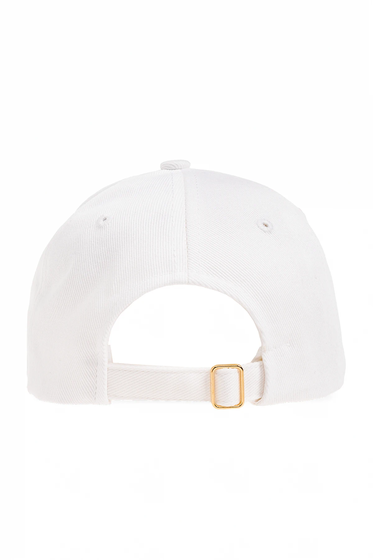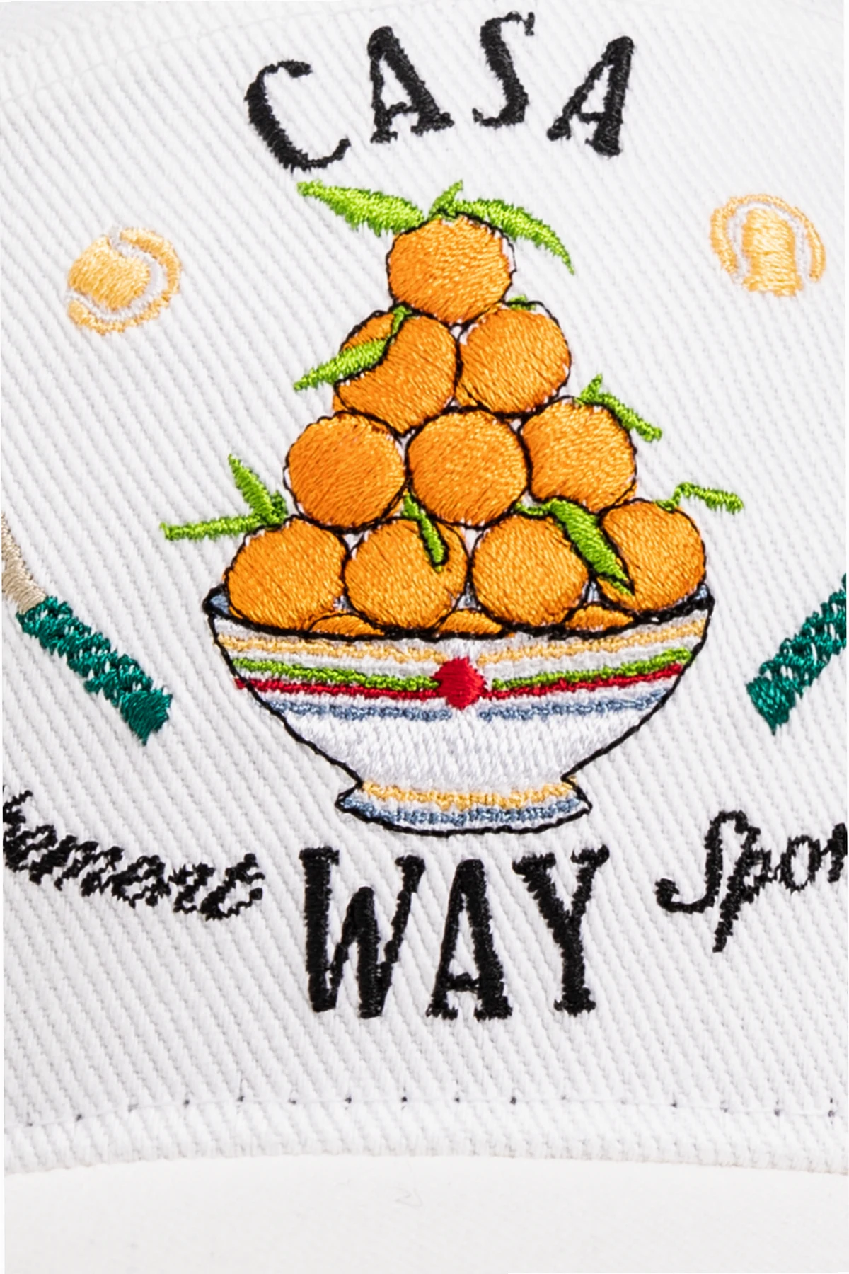 White baseball cap from Casablanca. Made of cotton, this item adjusts via a buckle strap on the back and showcases an embroidered colourful logo pattern.
