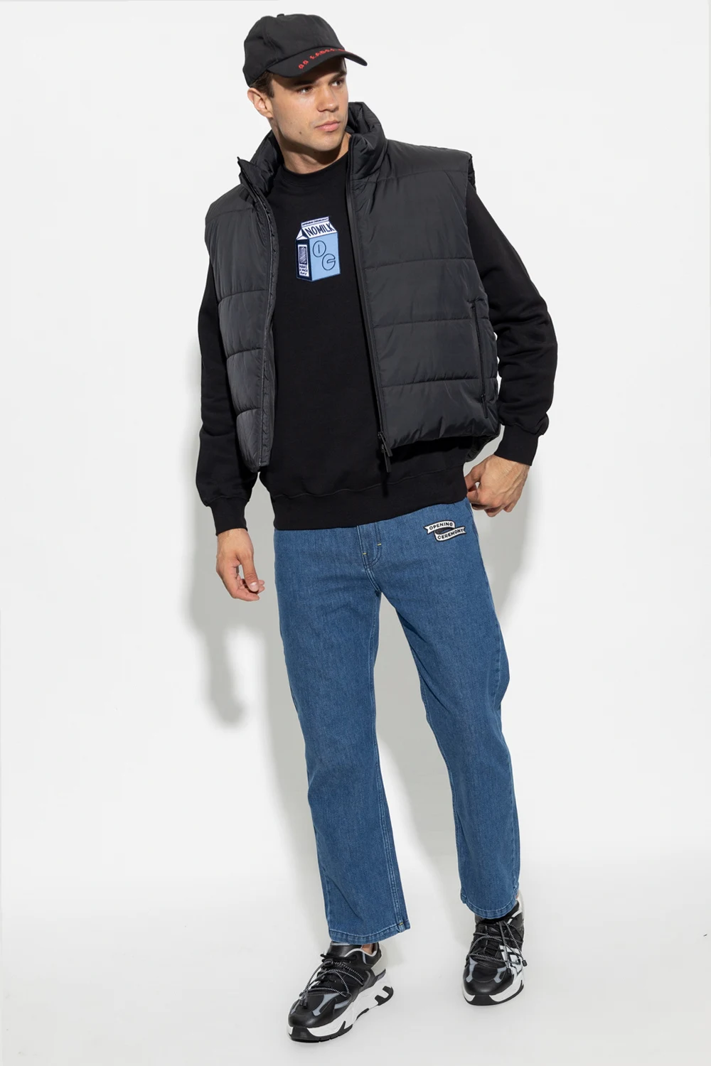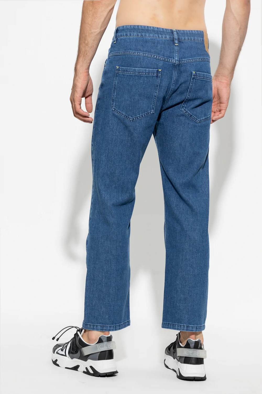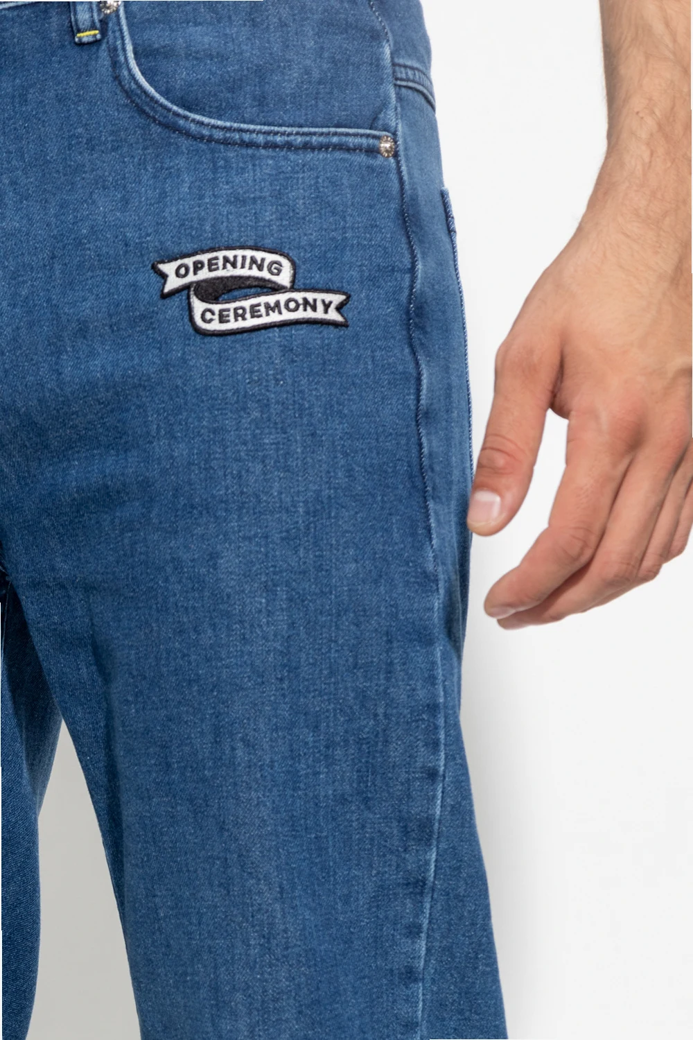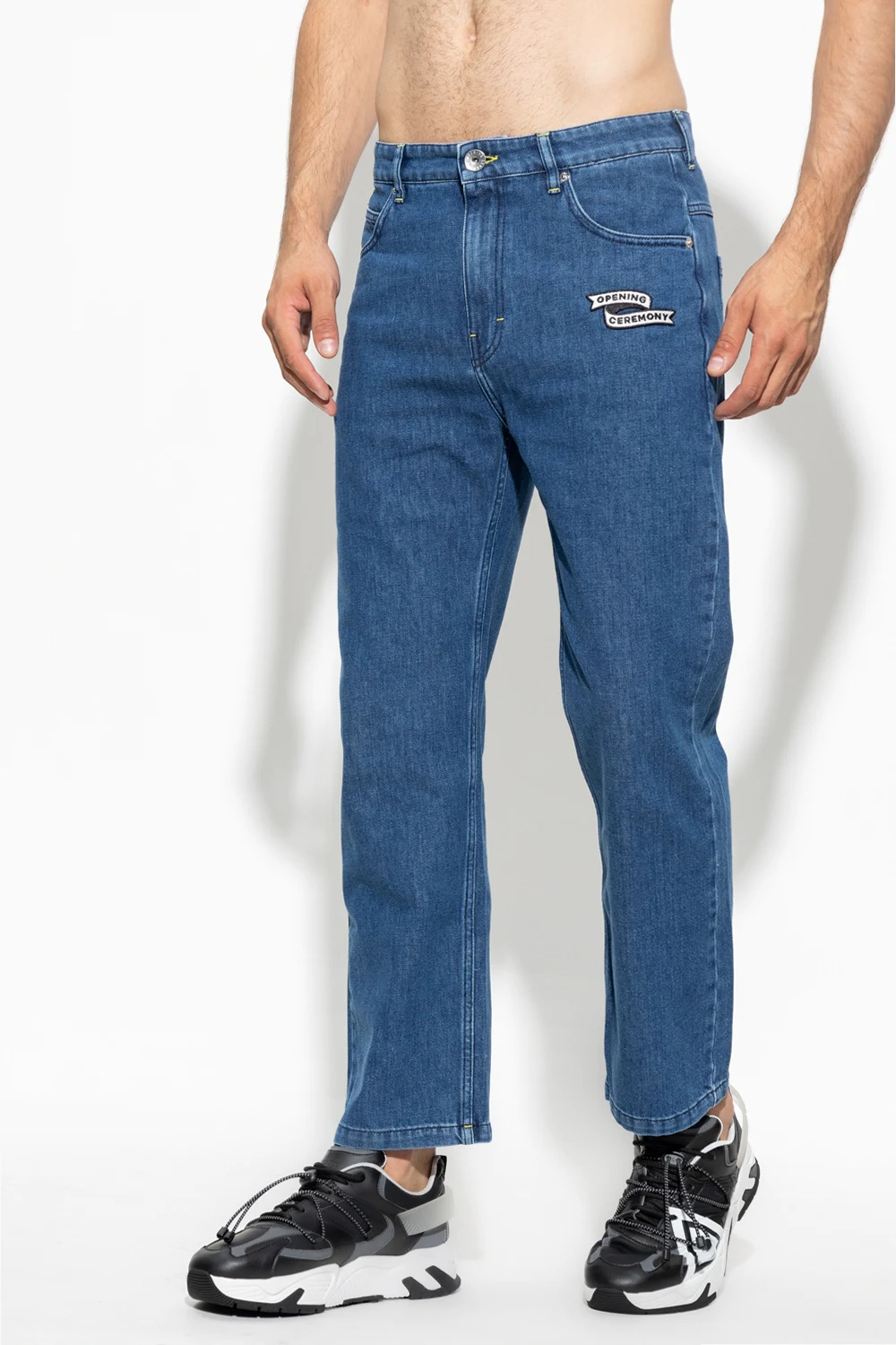 Blue jeans from Opening Ceremony. Fastened with a zip and button, this pair falls down with slightly tapered legs and features a logo patch, three front pockets and two back pockets.