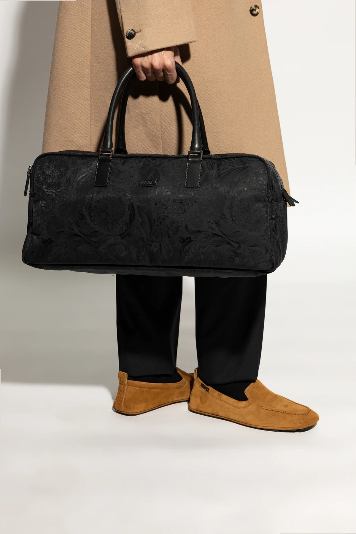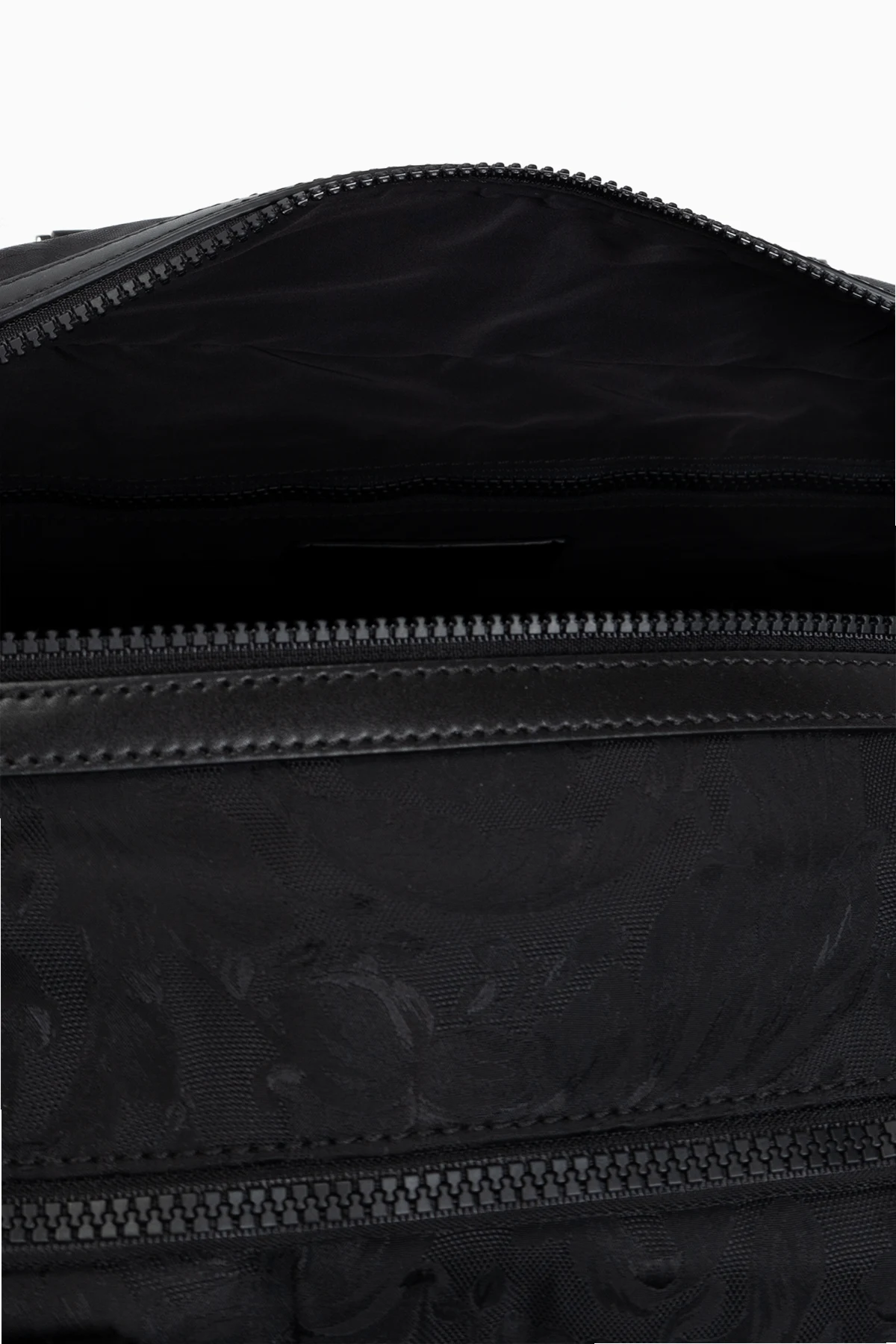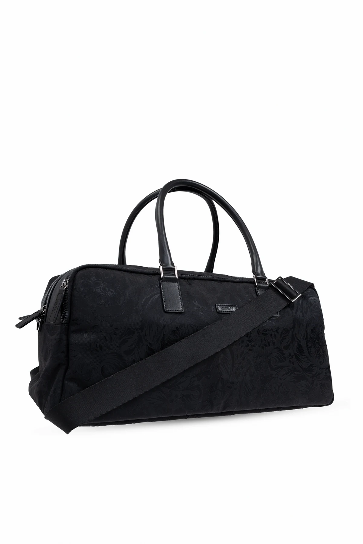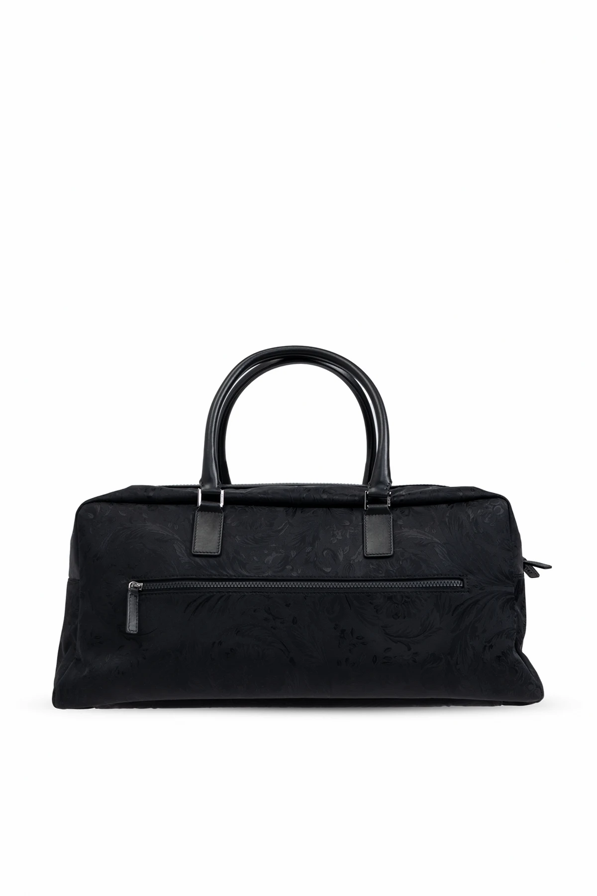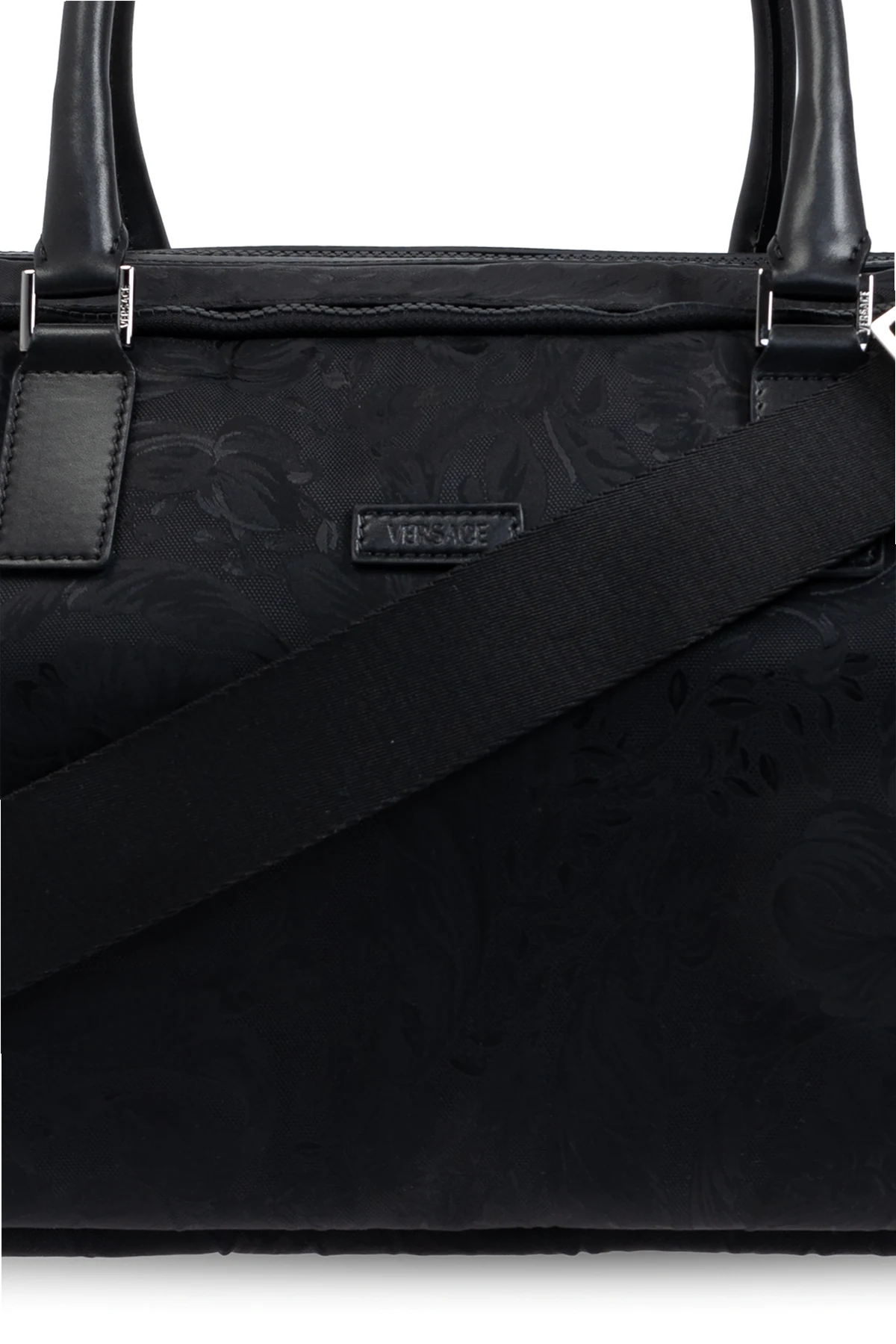 Introducing the epitome of sophistication and functionality - the Versace Handheld Bag. Crafted from premium 100% Nylon, this exquisite piece showcases a subtle, tonal botanical pattern embossed across its entirety, lending it an air of exclusivity and elegance. Its jet-black hue is complemented by silver metal accents, including buckles and a zip closure, that not only enhance its refined appearance but also add a touch of brilliance against the dark fabric. The bag features two sturdy handles for hand carrying and an optional, adjustable shoulder strap, offering versatility in how it can be worn. A discreet brand tag is neatly placed at the center front, serving as a testament to the luxury and quality Versace is renowned for. The zip fastening, detailed in some of the visuals, secures the contents while allowing easy access to the bag's interior. Furthermore, a practical addition comes in the form of a rear zip pocket, perfect for storing items requiring quick access. Why buy this product? Elegant, refined design with an embossed botanical pattern. High-quality, durable Nylon material. Versatile carrying options with both hand straps and an adjustable shoulder strap. Silver metal accents offering a chic contrast. Practicality meets luxury with the inclusion of an accessible rear zip pocket.