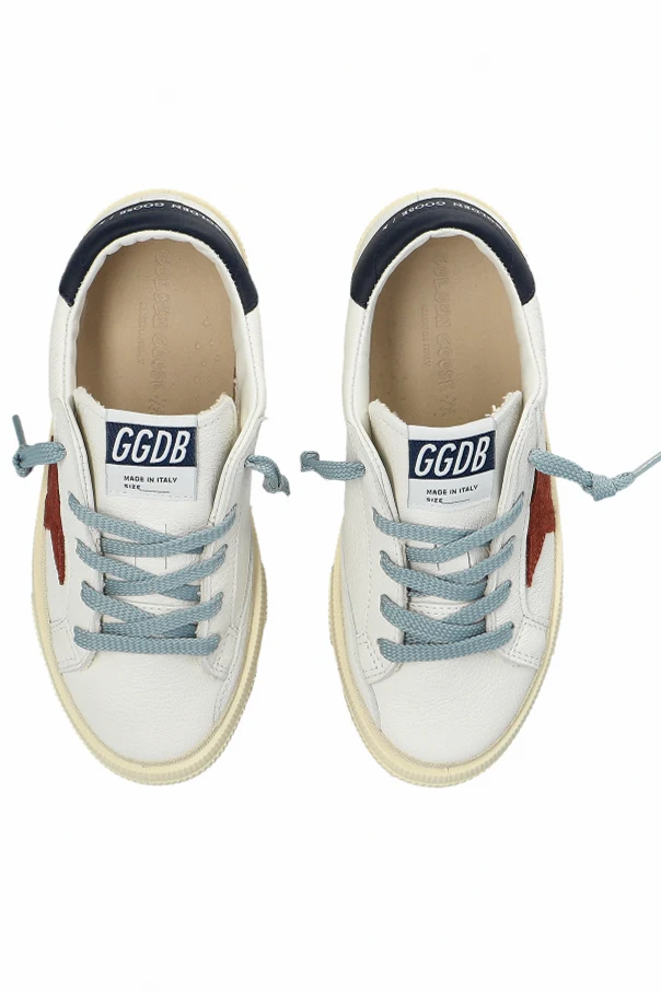 The signature red star motif —unmistakable for the brand—adorns the side, while refined details like the golden “GGBDMAY” inscription at the heel and navy heel tab with the GOLDEN GOOSE branding speak to the house’s artisanal heritage. A contrast designer patch graces each tongue, enhancing their collectible character.