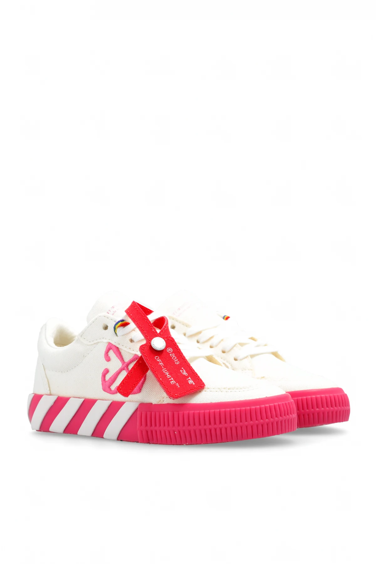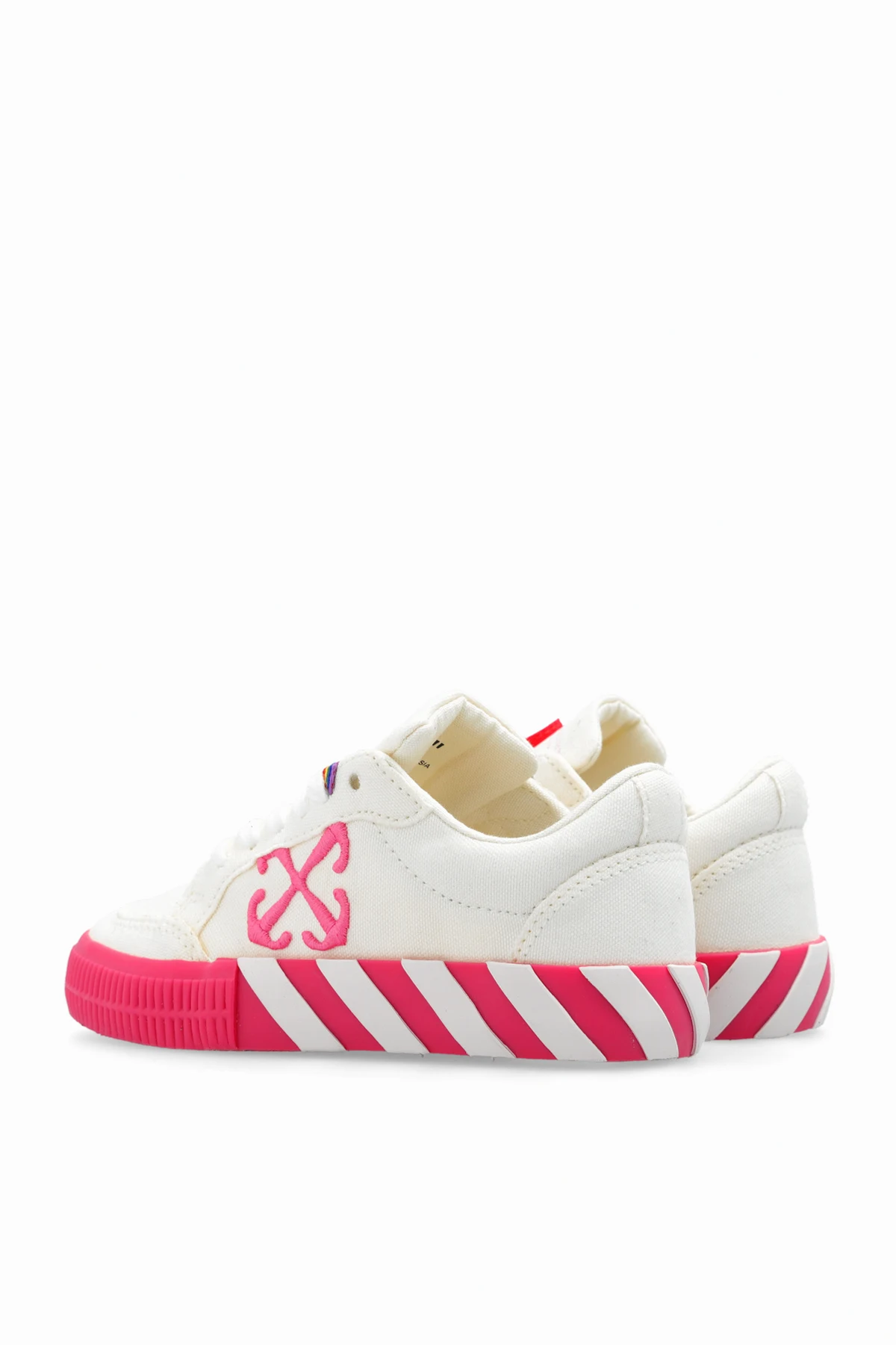 Cream platform sneakers from Off-White Kids. Made of cotton, this lace-up pair features the brand’s signature embroidered arrows in pink as well as a red snap-fastened logo charm and a rubber sole in pink, white and red.