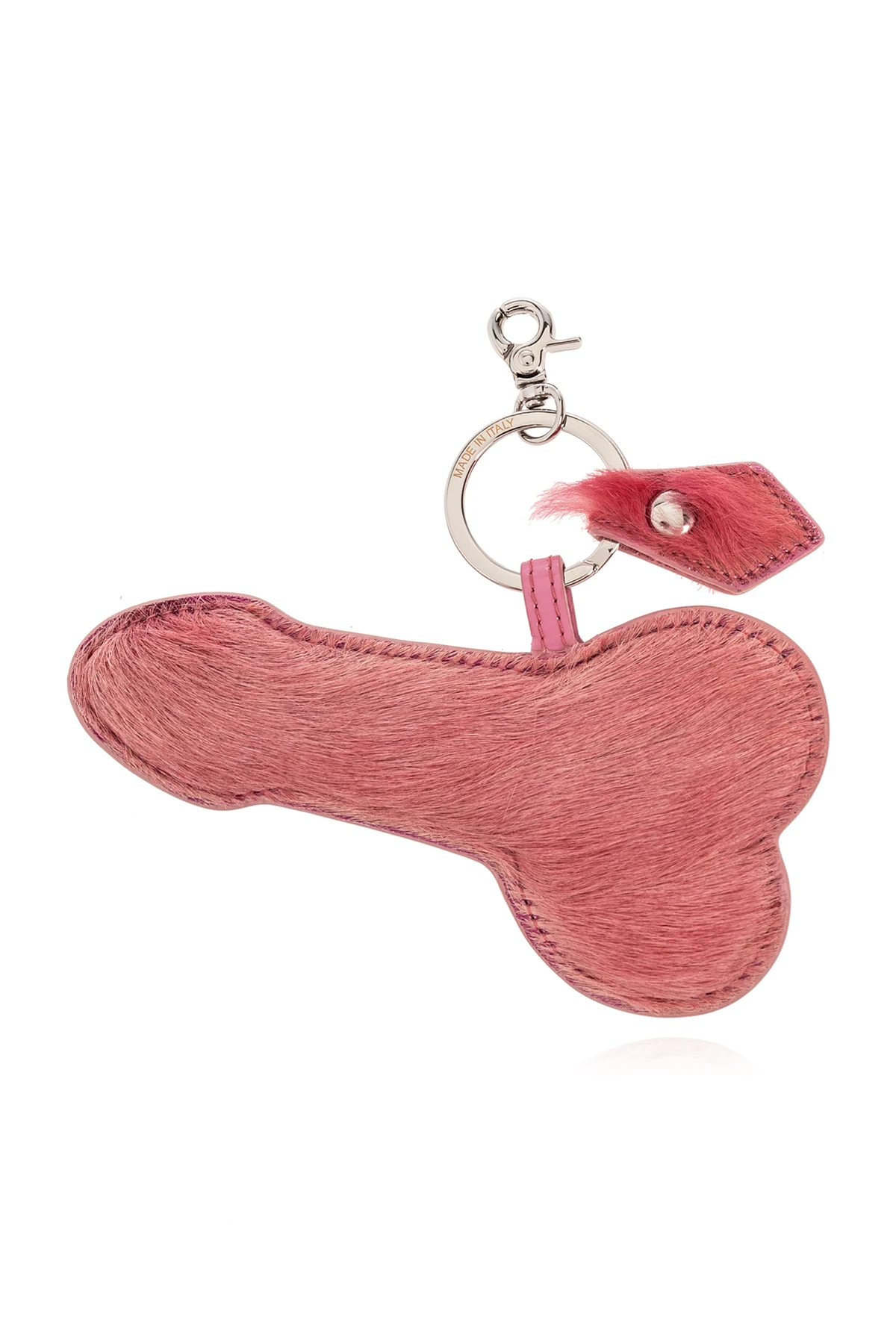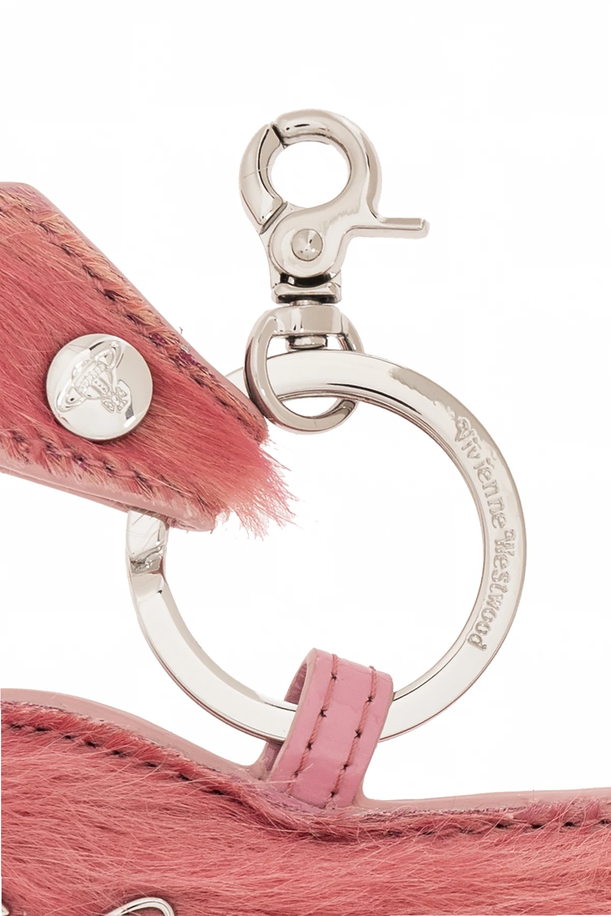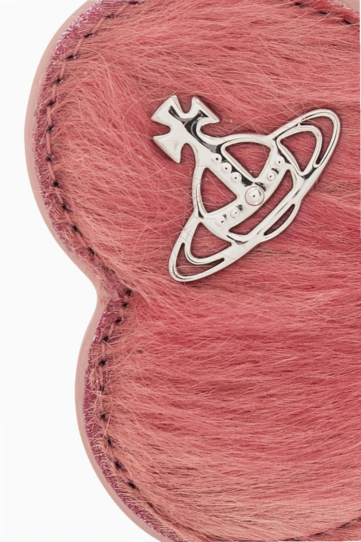Introducing an exquisite addition to your accessory collection, the Pink Fur-Textured Keychain from the exclusive line by Vivienne Westwood. This luxurious keychain is crafted from a plush, fur-like material in a vibrant shade of pink, designed to add a touch of elegance and whimsy to your everyday essentials. The keychain boasts a unique, rounded shape with whimsical extensions that suggest an animal silhouette, showcasing the designer's flair for combining playful elements with sophisticated style. A shimmering, silver-toned metal logo adorns one side, signifying the high-quality craftsmanship and attention to detail that is synonymous with the Vivienne Westwood brand. Functional as well as fashionable, it is equipped with a sturdy metal ring and a carabiner clasp, allowing for versatile attachment options to your keys, purse, or other personal items. The carabiner features engraved text, potentially including the brand name, adding an extra layer of exclusivity. The visible, robust stitching further attests to the item's premium construction and durability. Why Purchase This Product? Elegantly crafted from high-quality, fur-textured material in a striking pink hue. Features distinctive design elements, including a silver-toned metal logo by Vivienne Westwood. Equipped with a metal ring and carabiner for versatile attachment options. Represents a blend of functionality, luxury, and distinctive style.