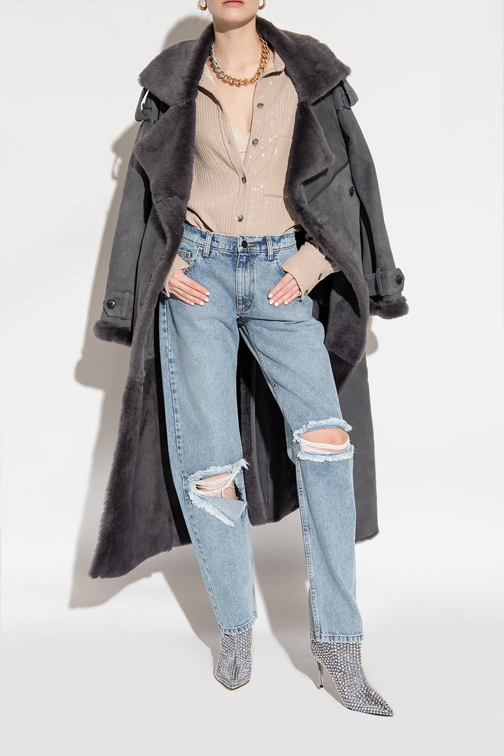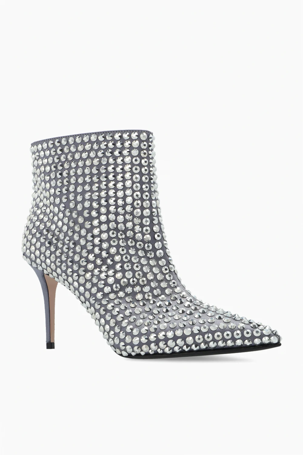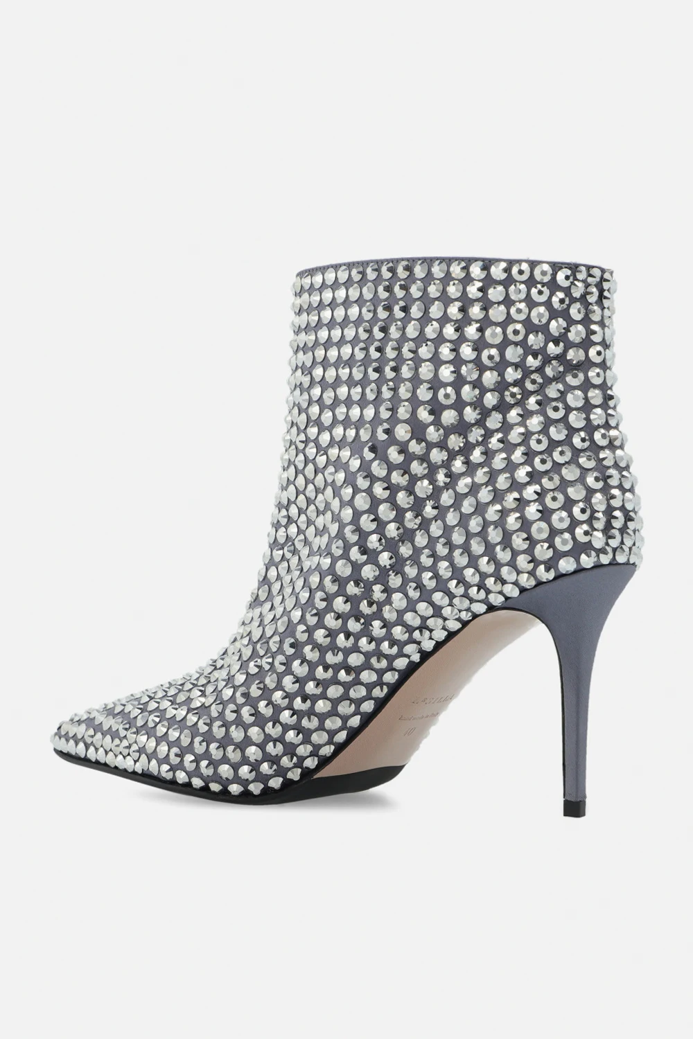 Dark grey ‘Eva’ heeled ankle boots from Le Silla. Crafted from satin fabric, this model has been covered with glossy studs all over. Sitting on a cream and black leather sole with a rubber trim, it has a slip-one silhouette.