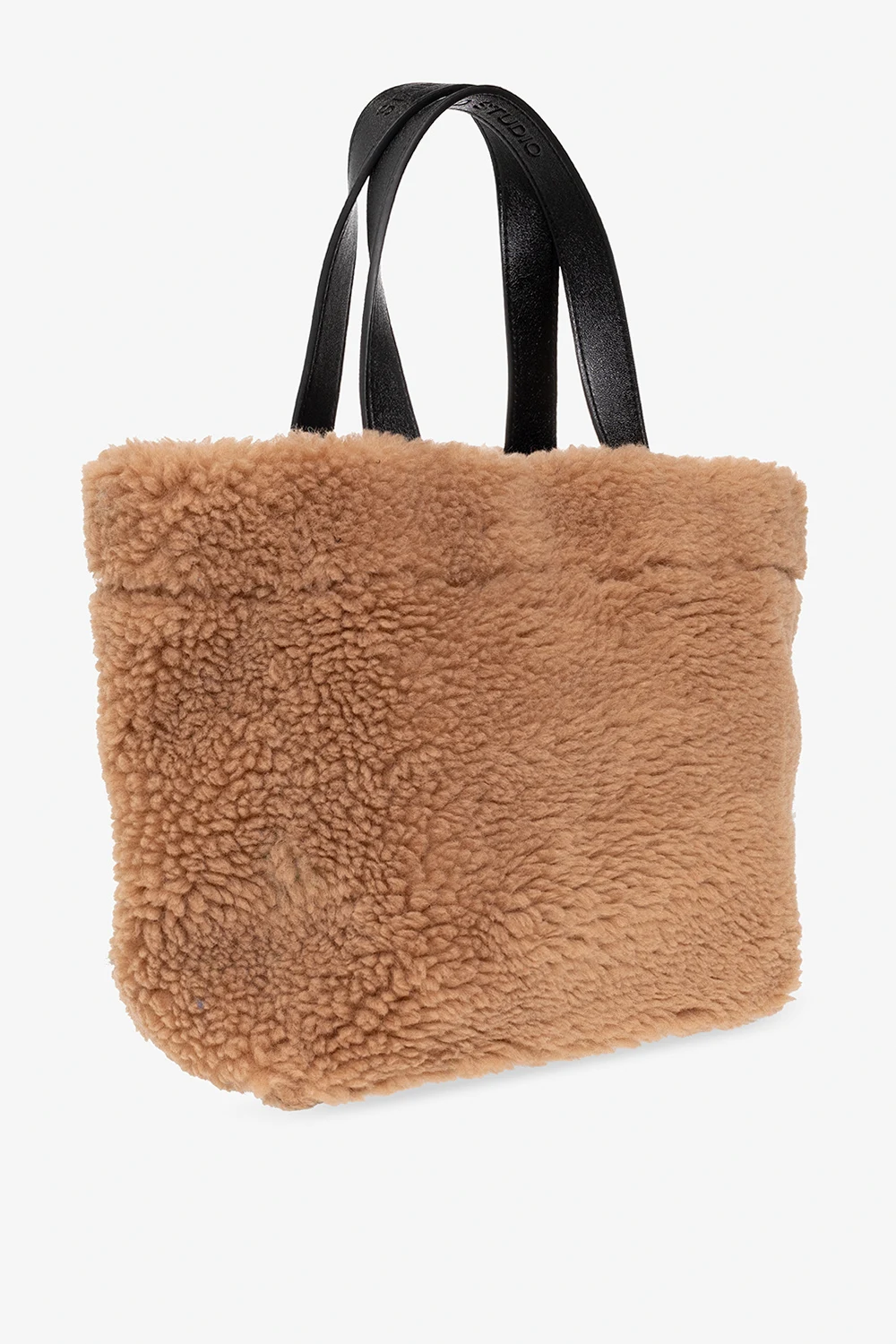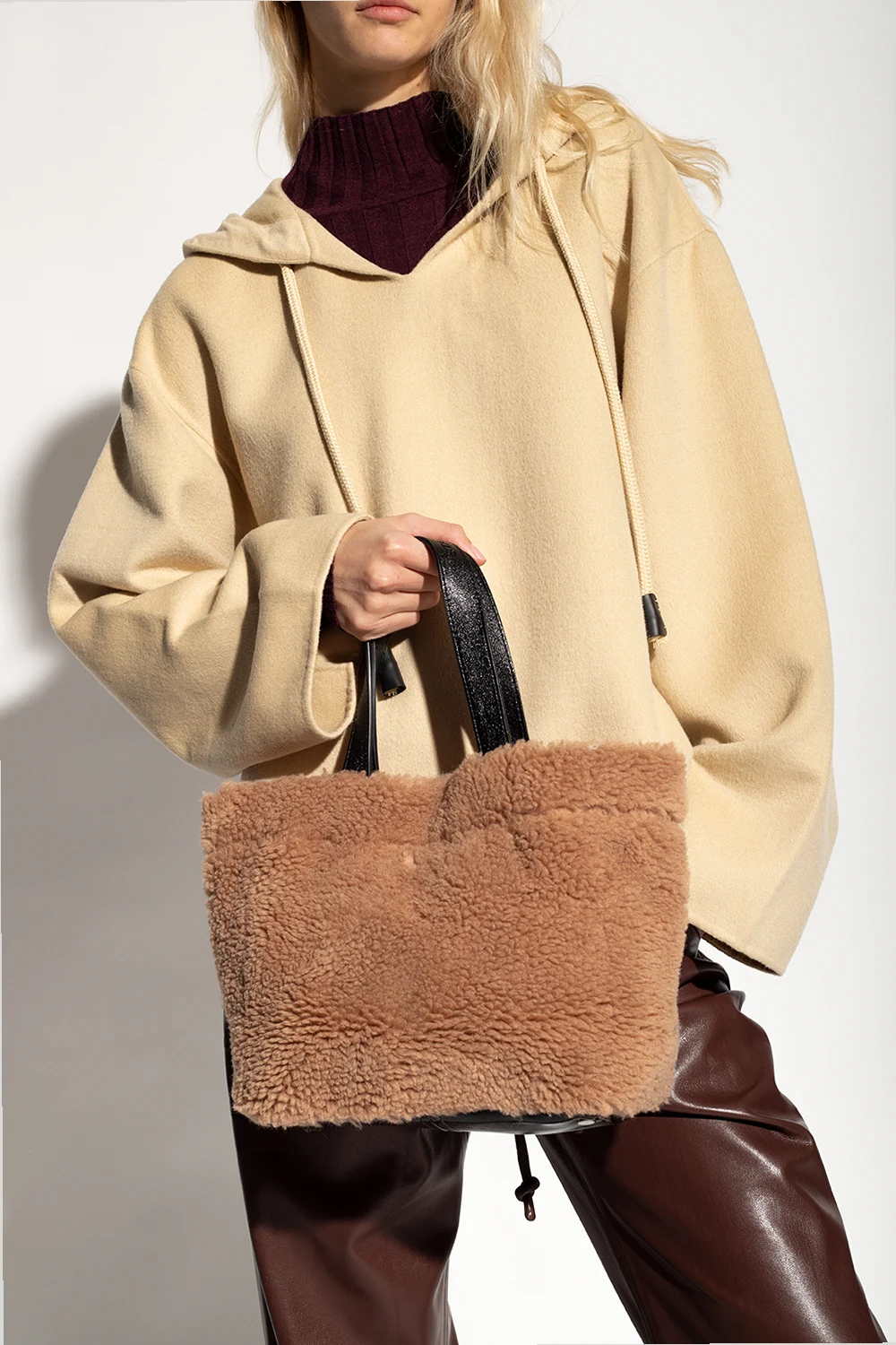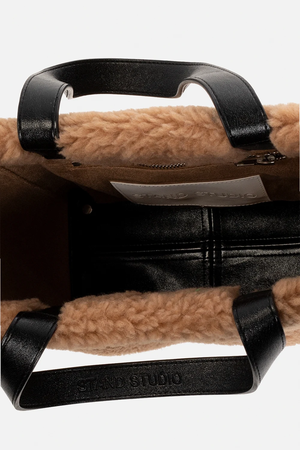 Brown shopper bag from STAND STUDIO. Made of faux fur and leather, this model is complete with a snap closure, two black half-round handles with a glossy finish and embossed logo, silver-tone metal hardware and one internal compartment with one zip pocket.