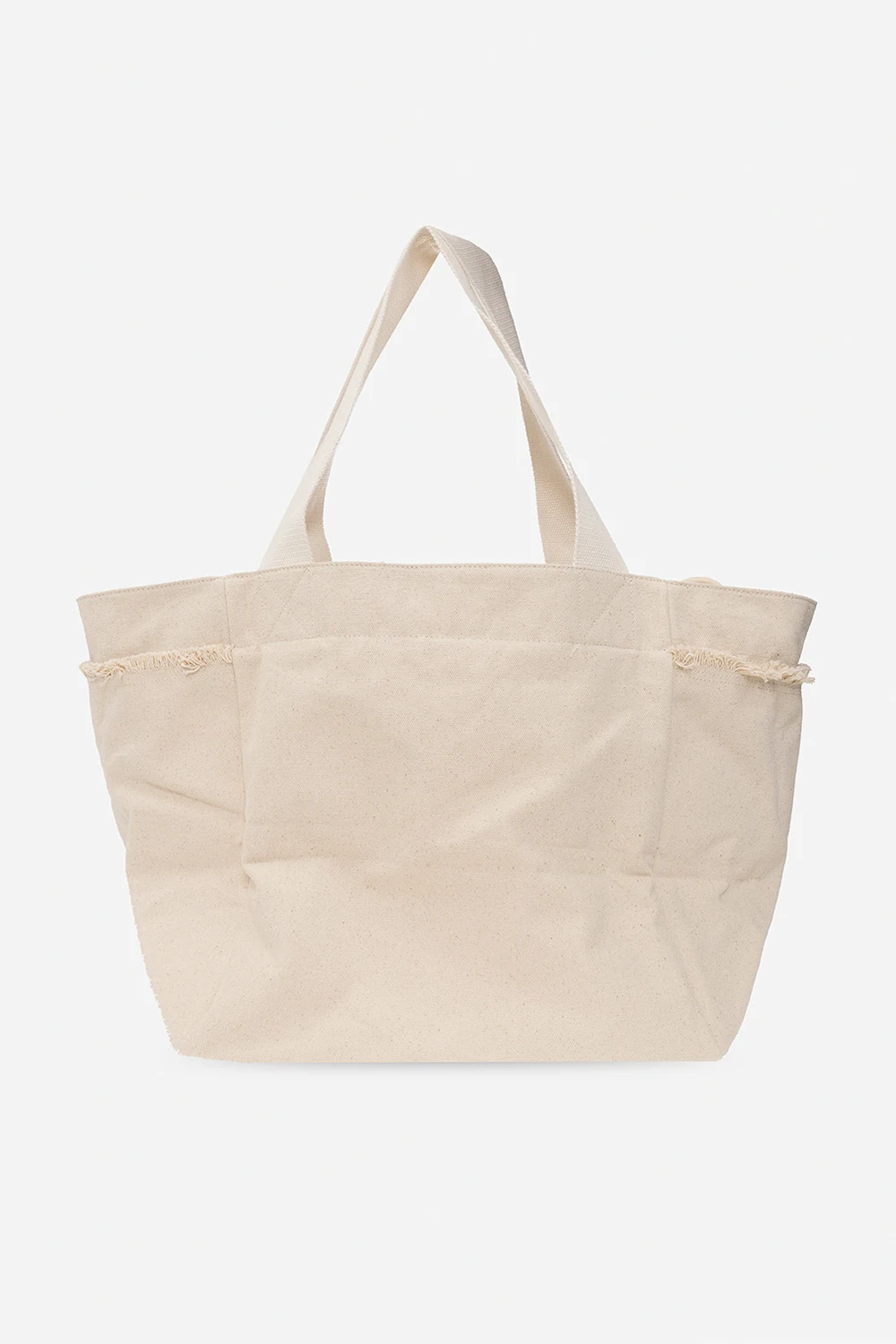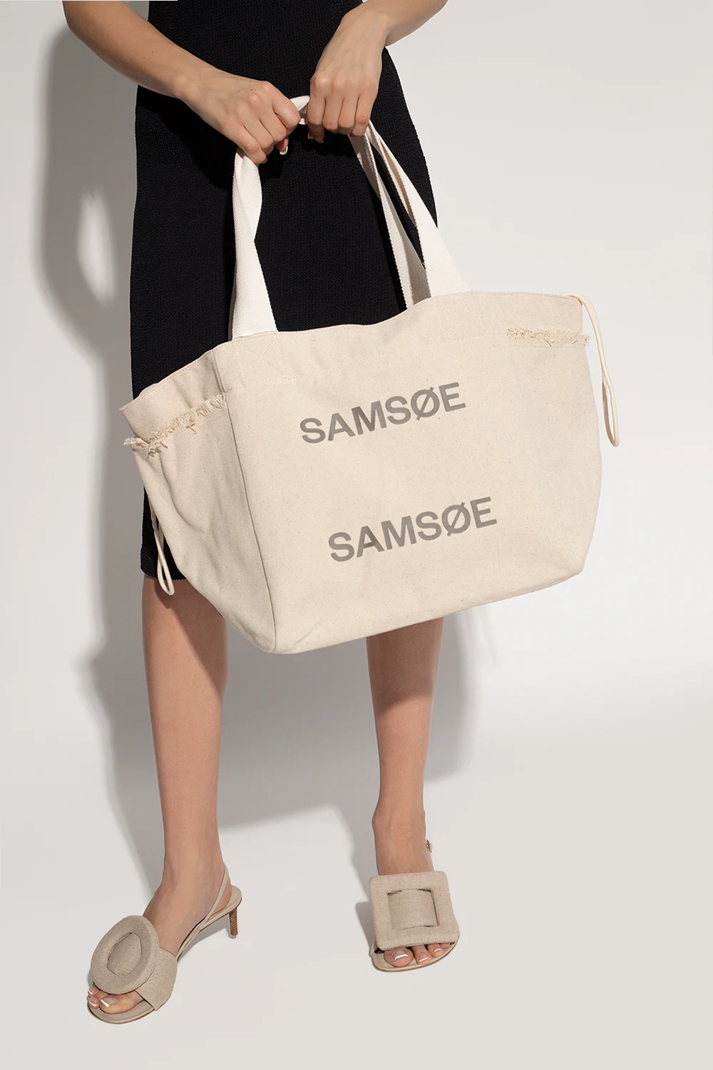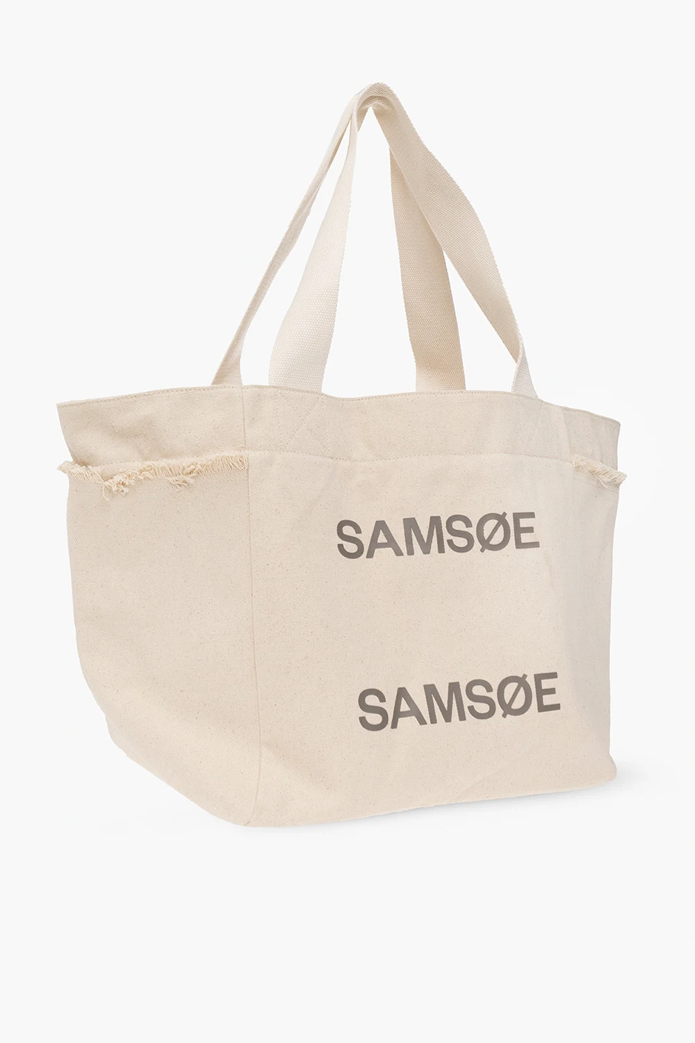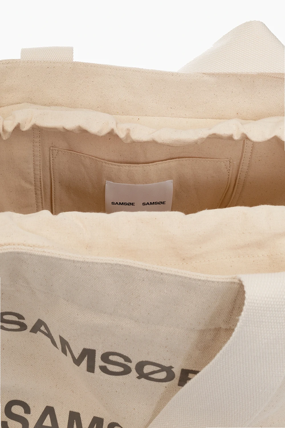 Cream 'Lamis Large' shopper bag from Samsoe Samsoe. Crafted in part from recycled material, this design features a grey logo print on the front, two shoulder straps and one internal compartment with a slip pocket.