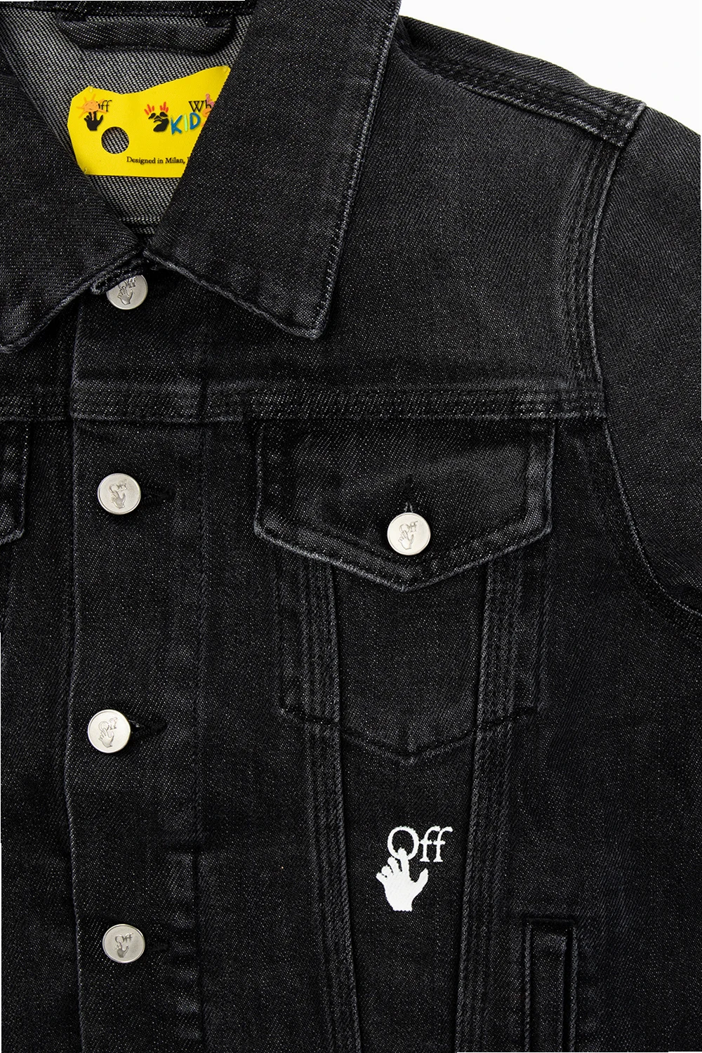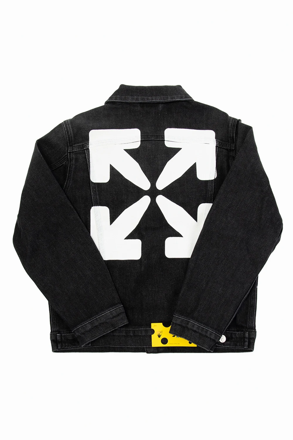 Black denim jacket from Off-White Kids. Fastened with buttons, this garment features a white logo print, two slip pockets, two buttoned flap pockets, yellow logo appliqué at the back and long sleeves with button cuffs.