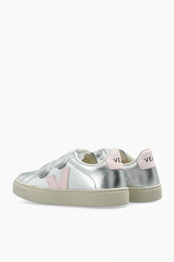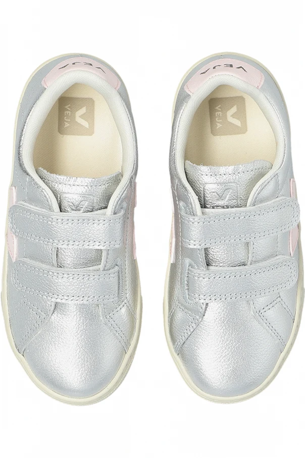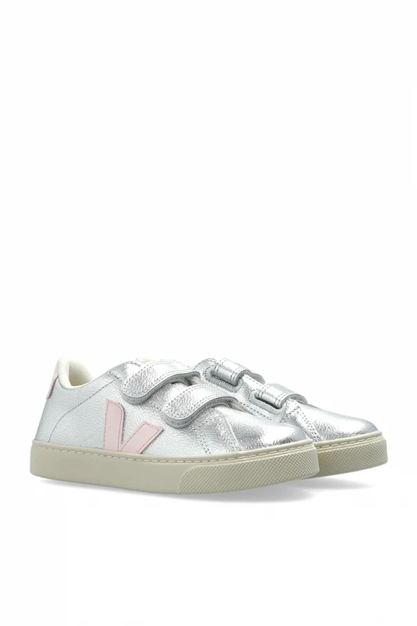 Experience refined sport-inspired style with the Veja Kids ‘Small Esplar Leather’ sneakers, exquisitely crafted in a luminous silver natural leather. Boasting a classic children's silhouette with softly rounded toes and a low-cut profile, these sneakers are both sophisticated and playful. The upper’s subtle metallic sheen adds a unique brilliance, elegantly contrasted by signature pale pink “V” logos on each side and a coordinating pink branded heel panel, underscoring Veja’s iconic identity.