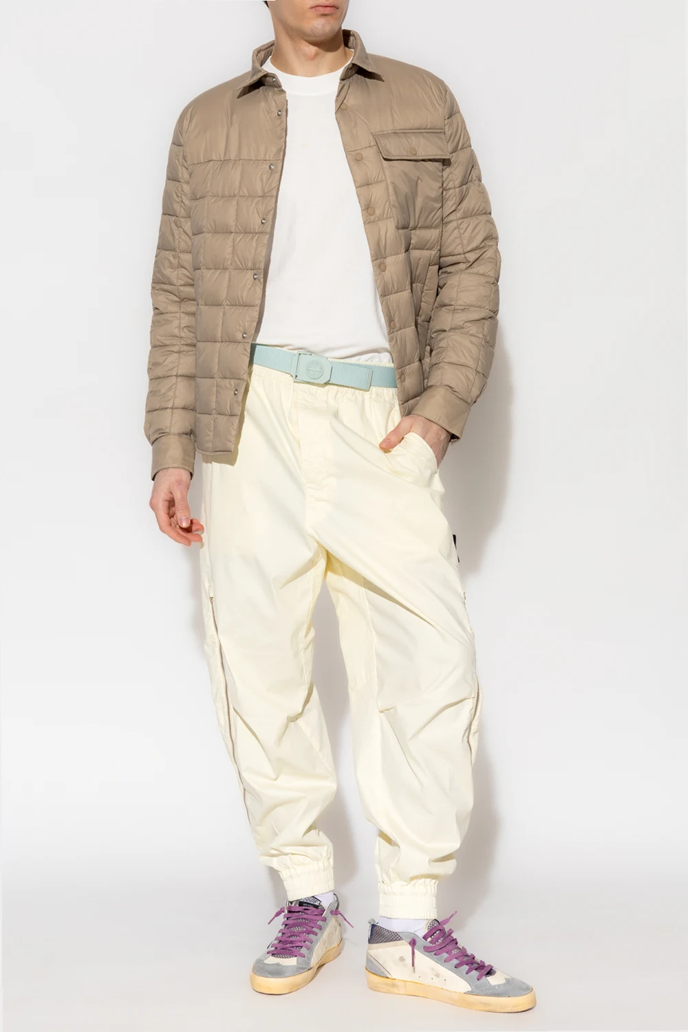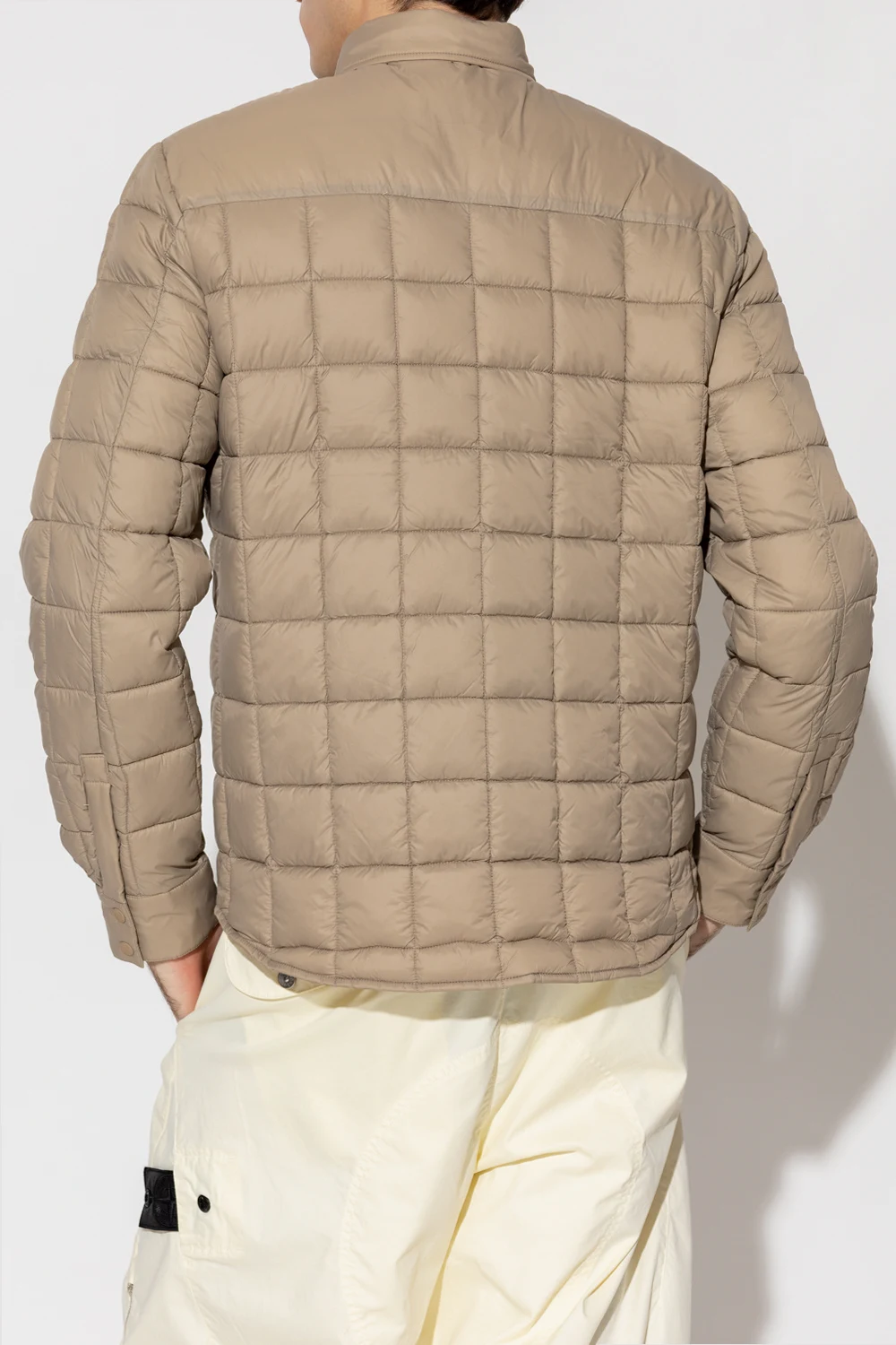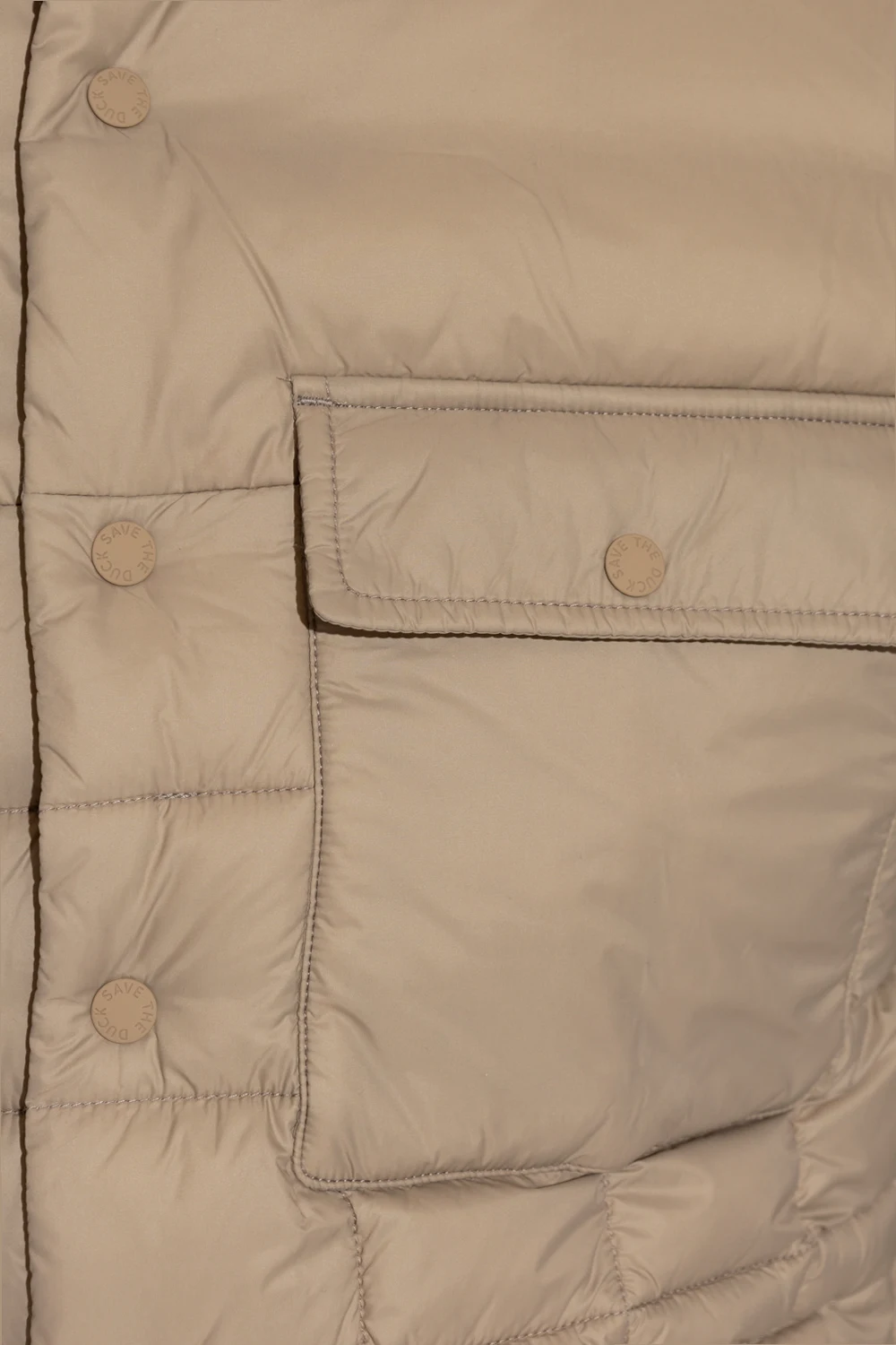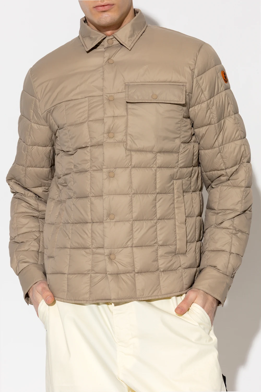 Greyish beige ‘Titan’ jacket from Save The Duck. Emblazoned with an orange and black logo patch, this style features snap fastenings and three snap-fastened pockets.