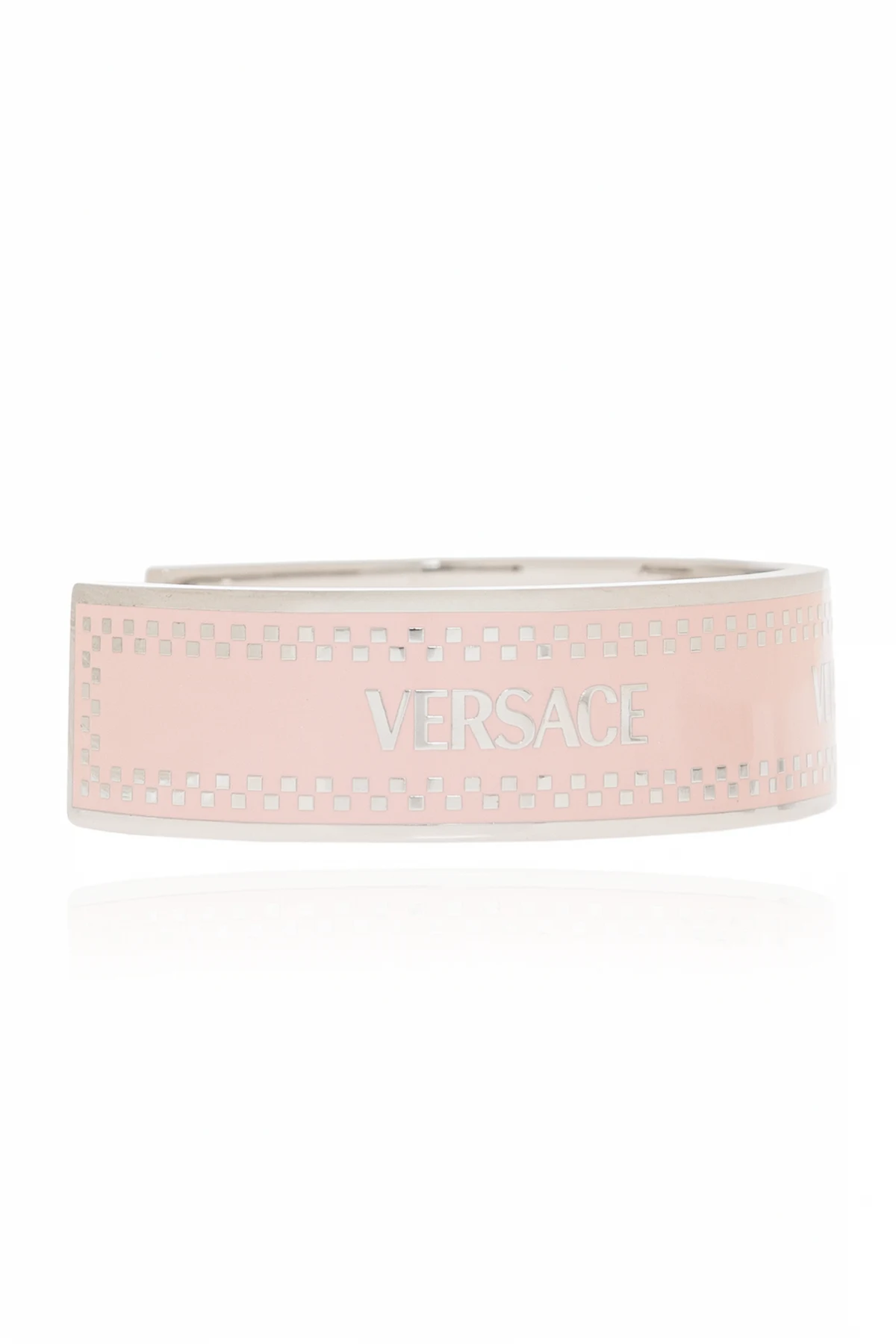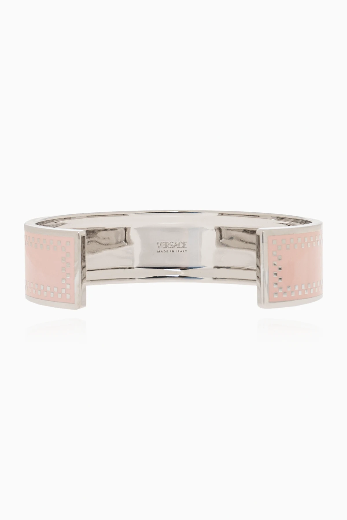Introducing the epitome of luxury and sophistication, the Versace Logo Bracelet. This exquisite piece is a testament to Versace's commitment to excellence and distinctive design. Crafted from 100% metal, this bracelet boasts a smooth, durable finish that gleams with a high polish, encapsulating the essence of high-end craftsmanship. The bracelet's surface is adorned with the iconic Versace logo, meticulously arranged in parallel lines that wrap elegantly around the wrist. Its dominant silver-pink hue adds a touch of femininity and modernity, making it a versatile accessory that complements both masculine and feminine attires. The secure metal clasp ensures a solid and durable closure, embodying both style and functionality. Why Choose This Product? Exclusive Design: Features the prestigious Versace logo, symbolizing luxury and high fashion. Versatile Elegance: Its unique silver-pink color scheme enhances any outfit, suitable for all genders. Premium Material: Crafted from high-quality metal, ensuring longevity and lasting luster. Secure Closure: Equipped with a robust metal clasp, offering peace of mind during wear.