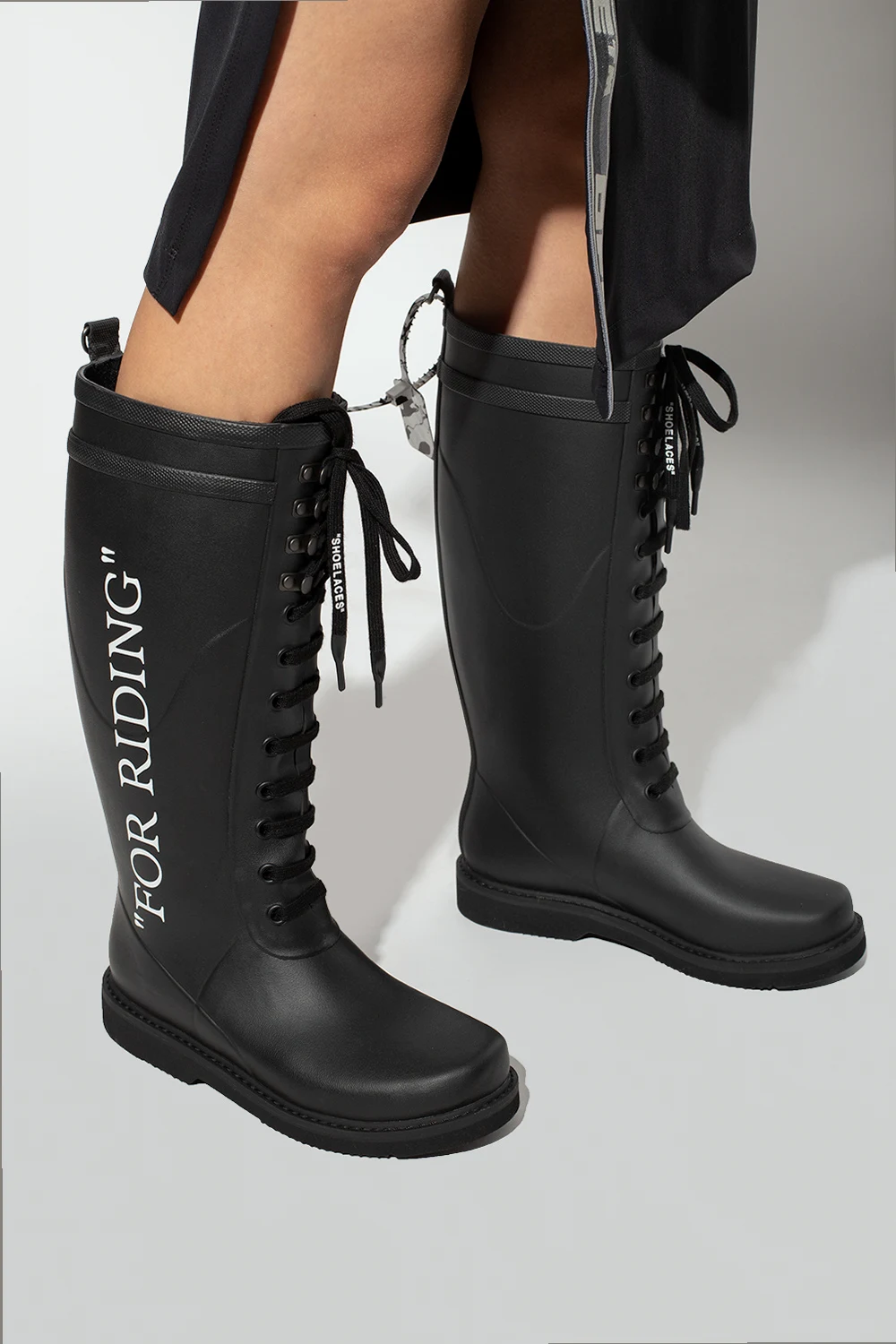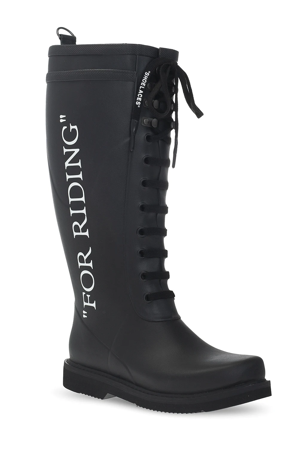 Black rain boots from Off-White. Resting on a black rubber sole, this lace-up pair is decorated with a ‘For Riding’ print.