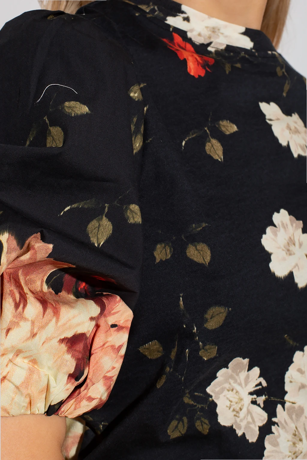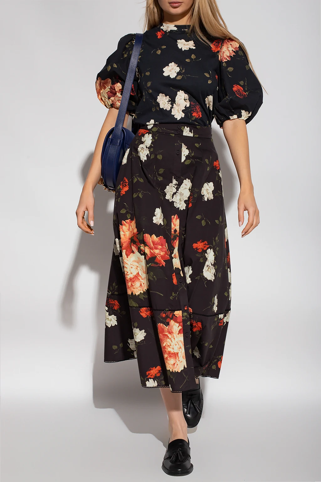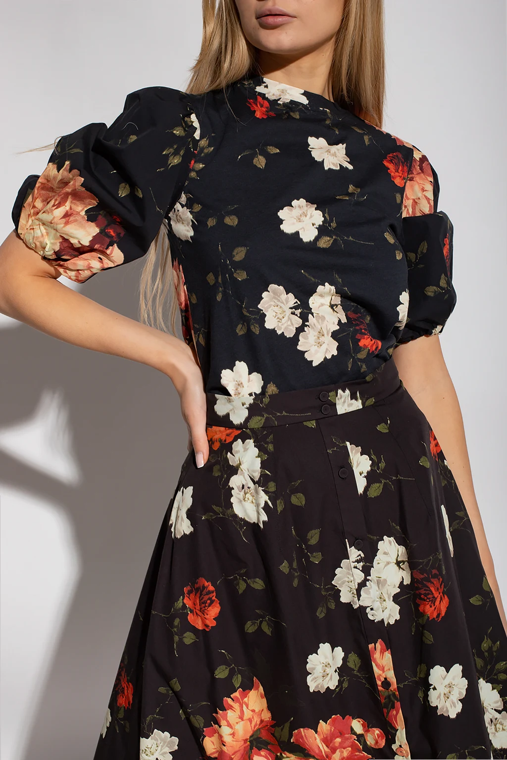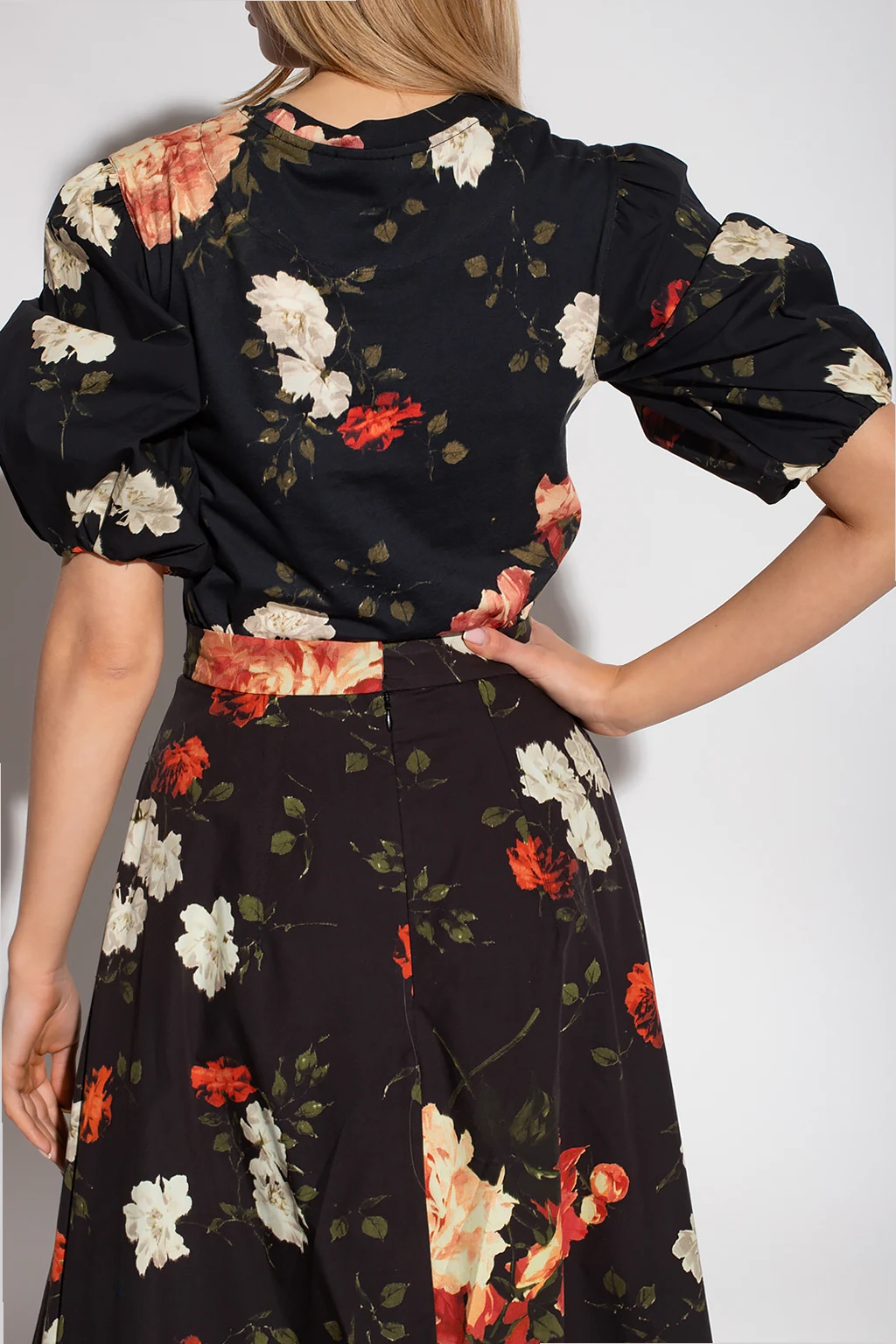 Black ‘Theodora’ floral top from Erdem. Crafted from cotton, this garment features a multicolored ‘Sitwell Bloom’ depicting roses and peonies, ribbed crew neck and short, puff sleeves.