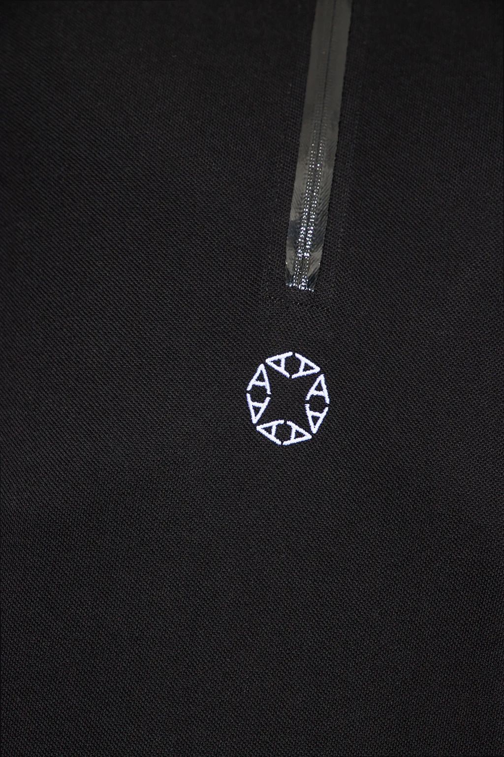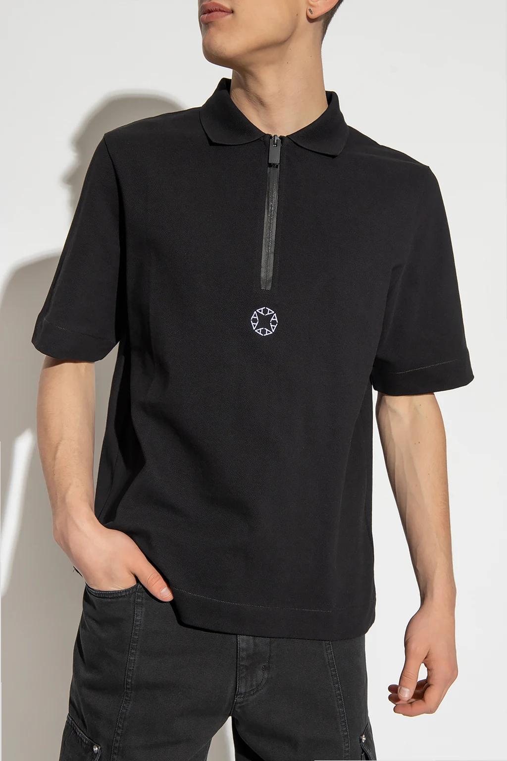 Black polo shirt from 1017 ALYX 9SM. Made of cotton, this short sleeve design features a zip and embroidered pattern in white.