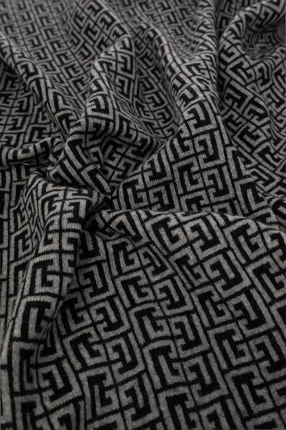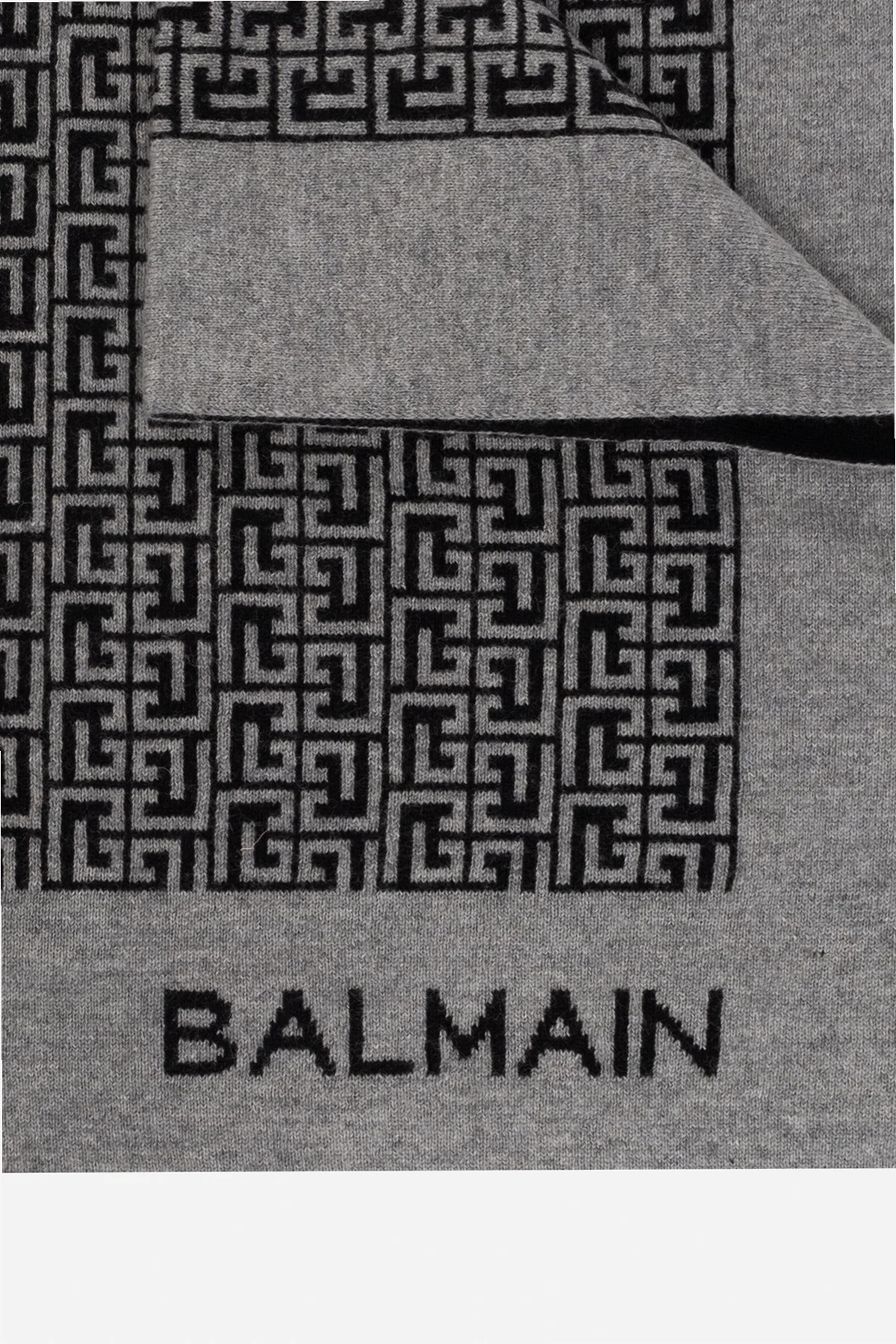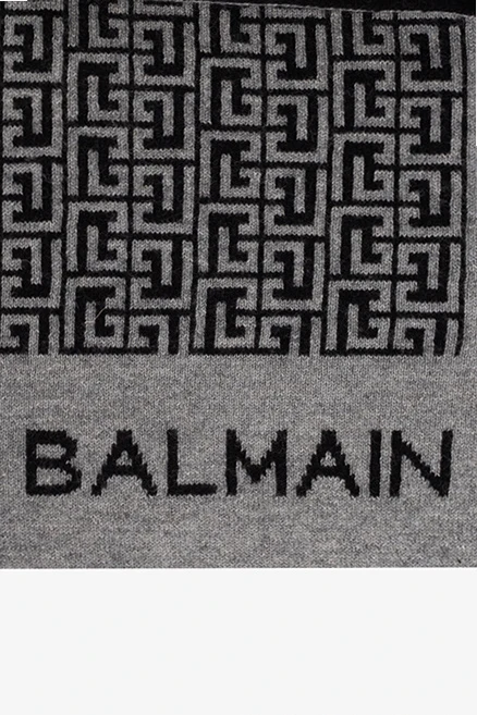 Grey and black blanket from Balmain Kids. Crafted from a wool, silk and cashmere blend, this item is decorated with a monogram pattern.