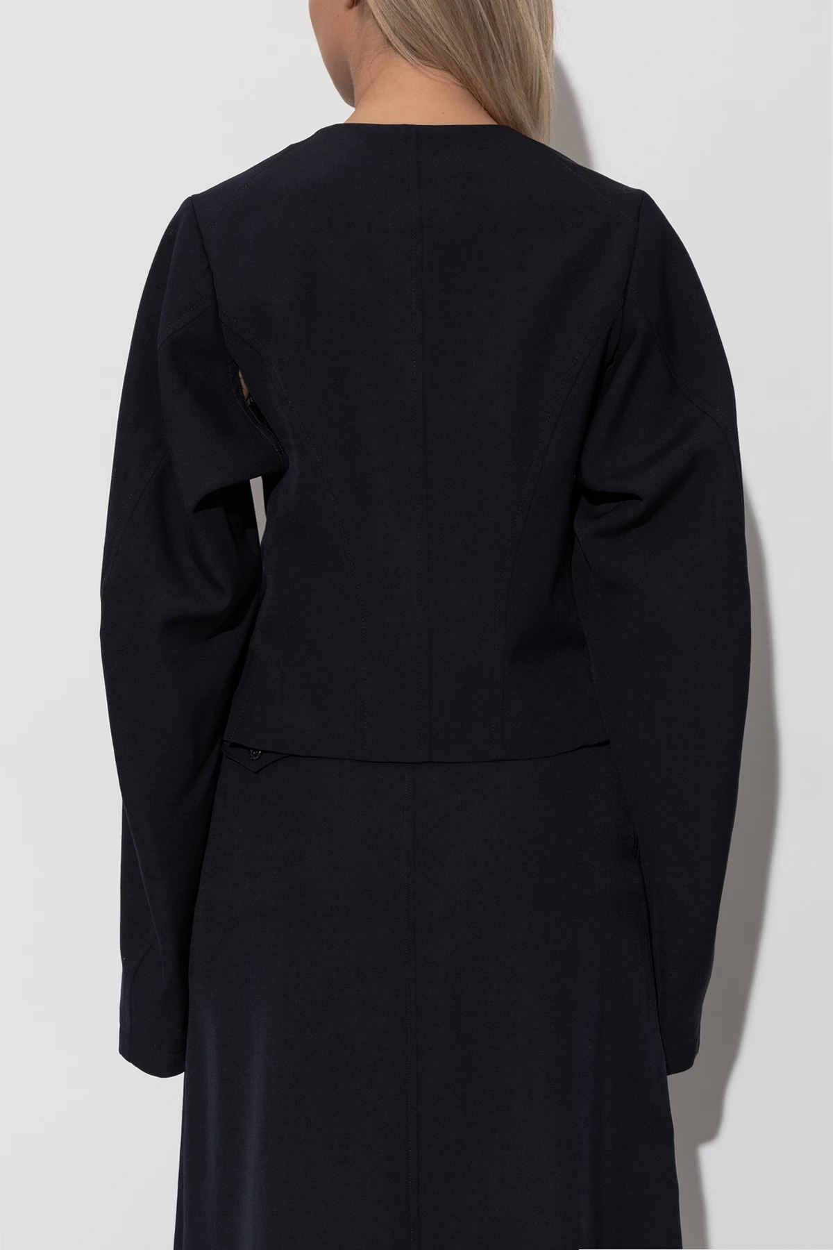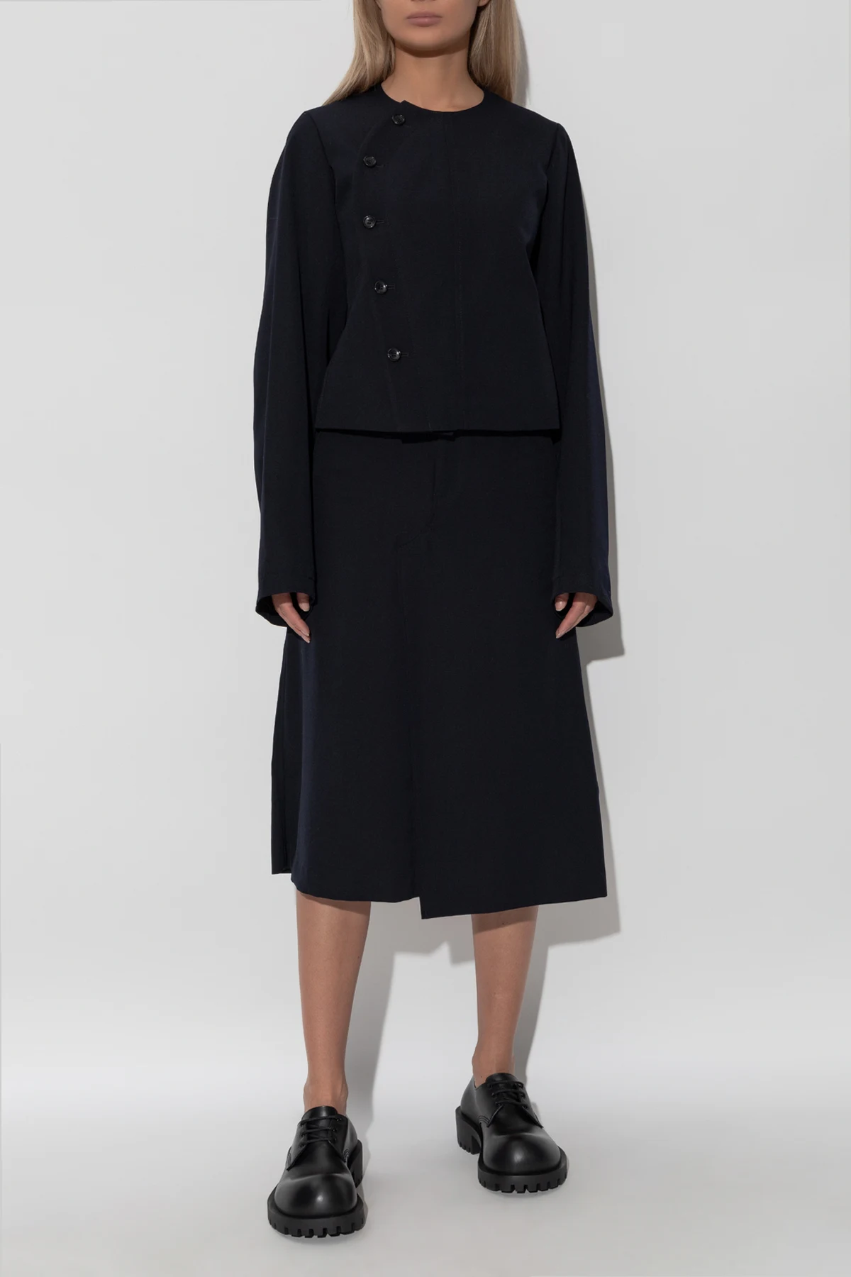Introducing the exquisite Wool Jacket from the CDG by Comme des Garçons collection. This jacket epitomizes sophistication with its sleek, tailored silhouette and timeless design. Crafted from premium wool, this jacket offers unparalleled comfort and quality. The navy hue exudes elegance, while the asymmetrical button closure adds a touch of modernity. The five black buttons, perfectly complementing the deep navy fabric, run from the left shoulder down to the right side, creating a distinctive and refined look. The jacket features a streamlined cut that reaches the waist, providing a classic and flattering fit. The long, straight sleeves and lack of a traditional collar lend a contemporary and minimalist aesthetic, making it a versatile addition to any wardrobe. Why You Should Buy This Product Expertly crafted from high-quality wool for supreme comfort and durability. Asymmetrical button closure for a unique and modern touch. Timeless navy color, perfect for both formal and casual occasions. Long, straight sleeves and minimalist design for a sleek, contemporary look. Designed by the renowned CDG by Comme des Garçons, ensuring luxury and exclusivity.
