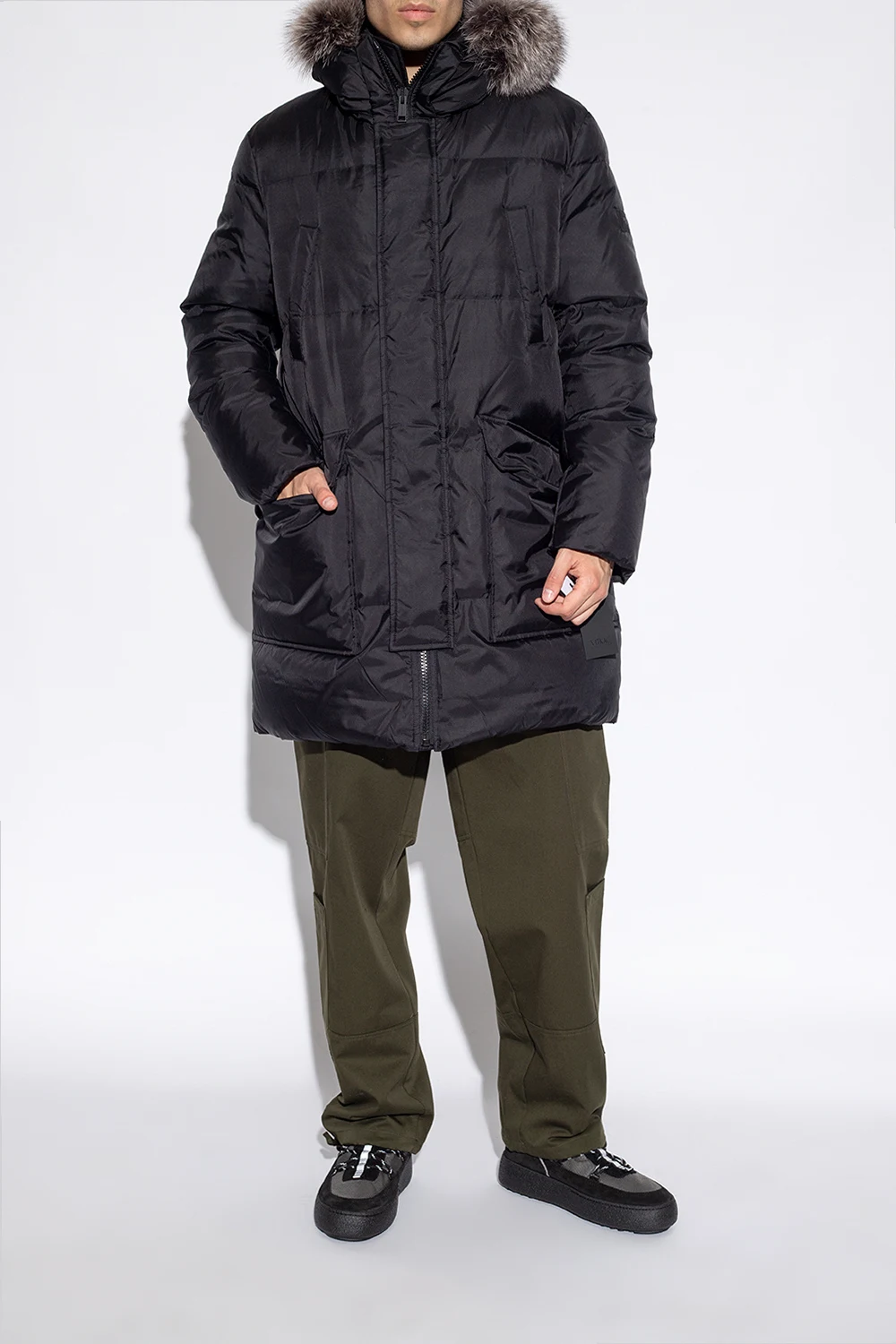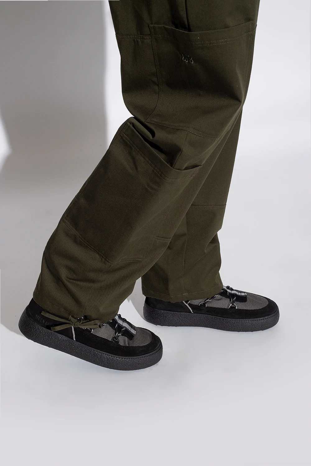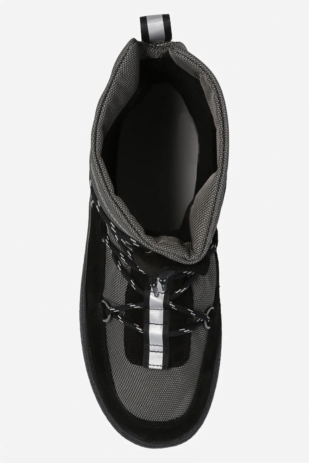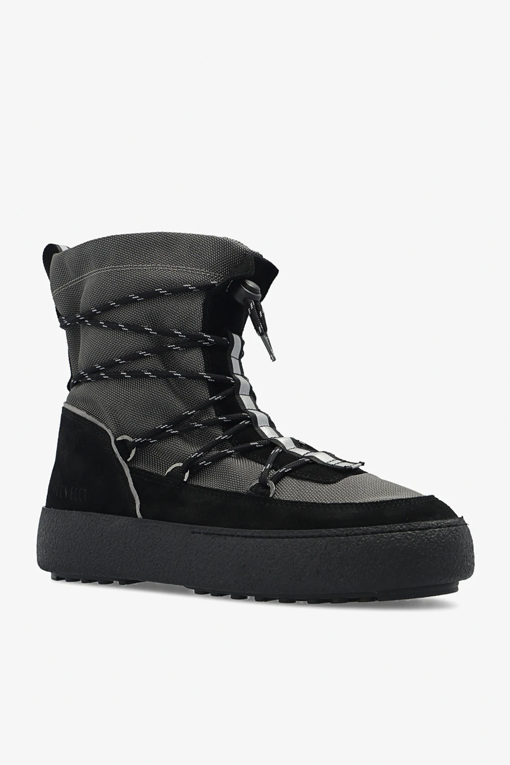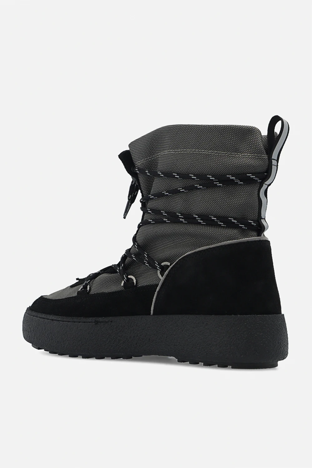 Grey and black ‘Mtrack’ snow boots from Moon Boot. Trimmed with suede, this pair features drawstrings, reflective stripe and black rubber sole.