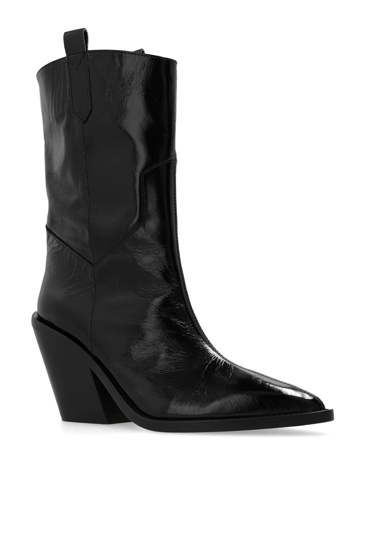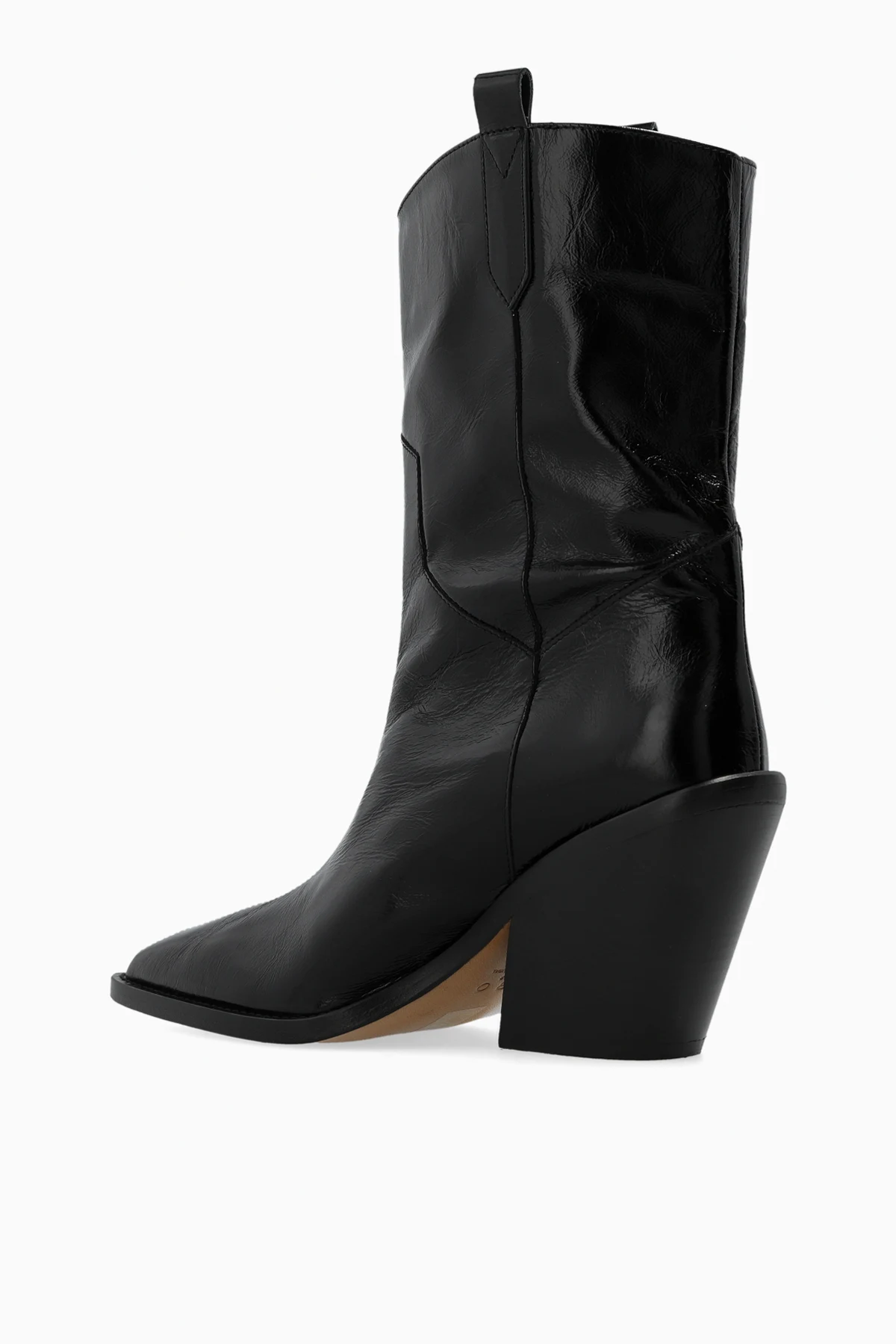 Black ‘Mazola’ cowboy boots from Iro. Made of patent leather, this slip-on pair features a pointed toe, angled heel and brown leather sole.