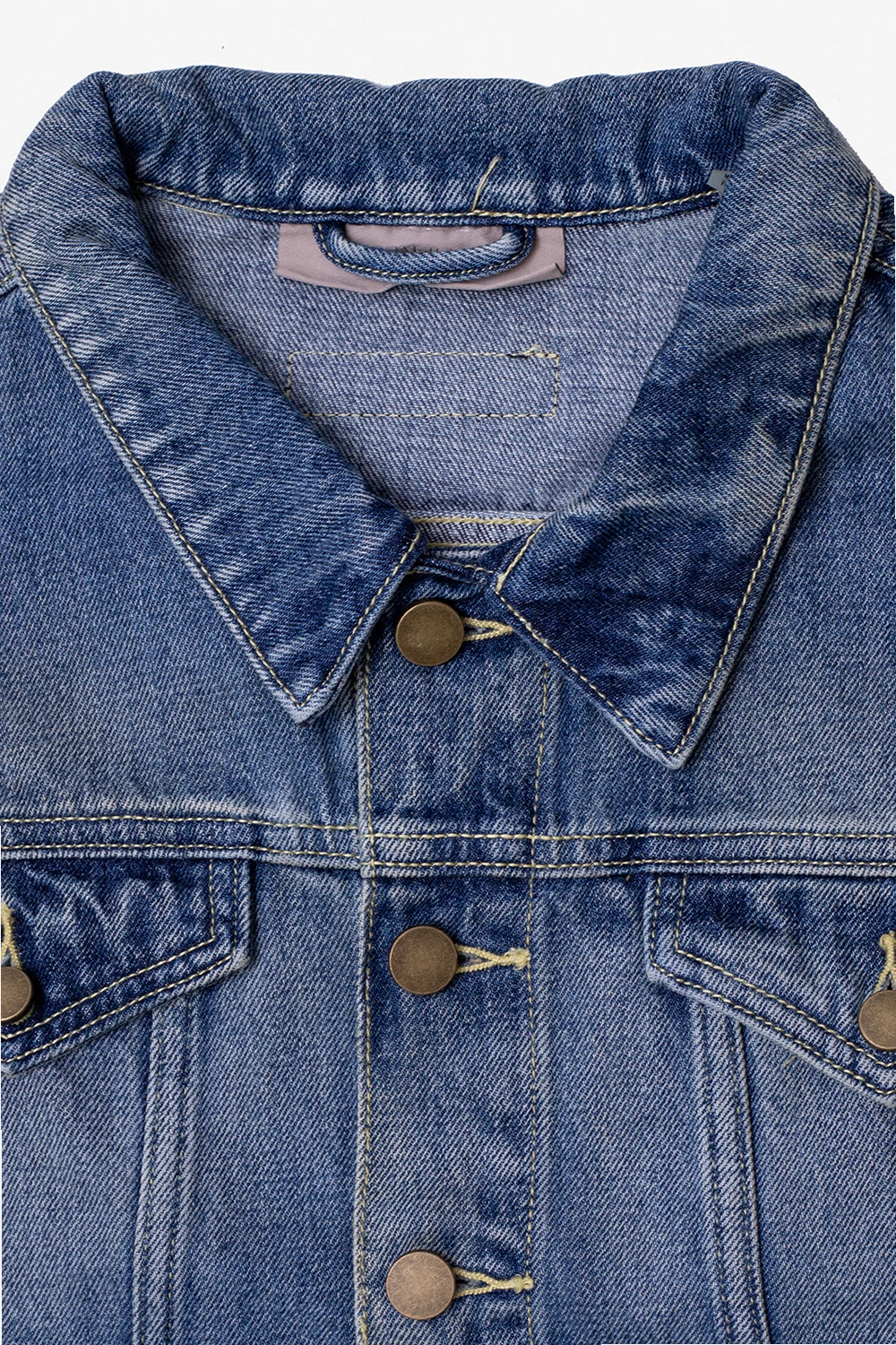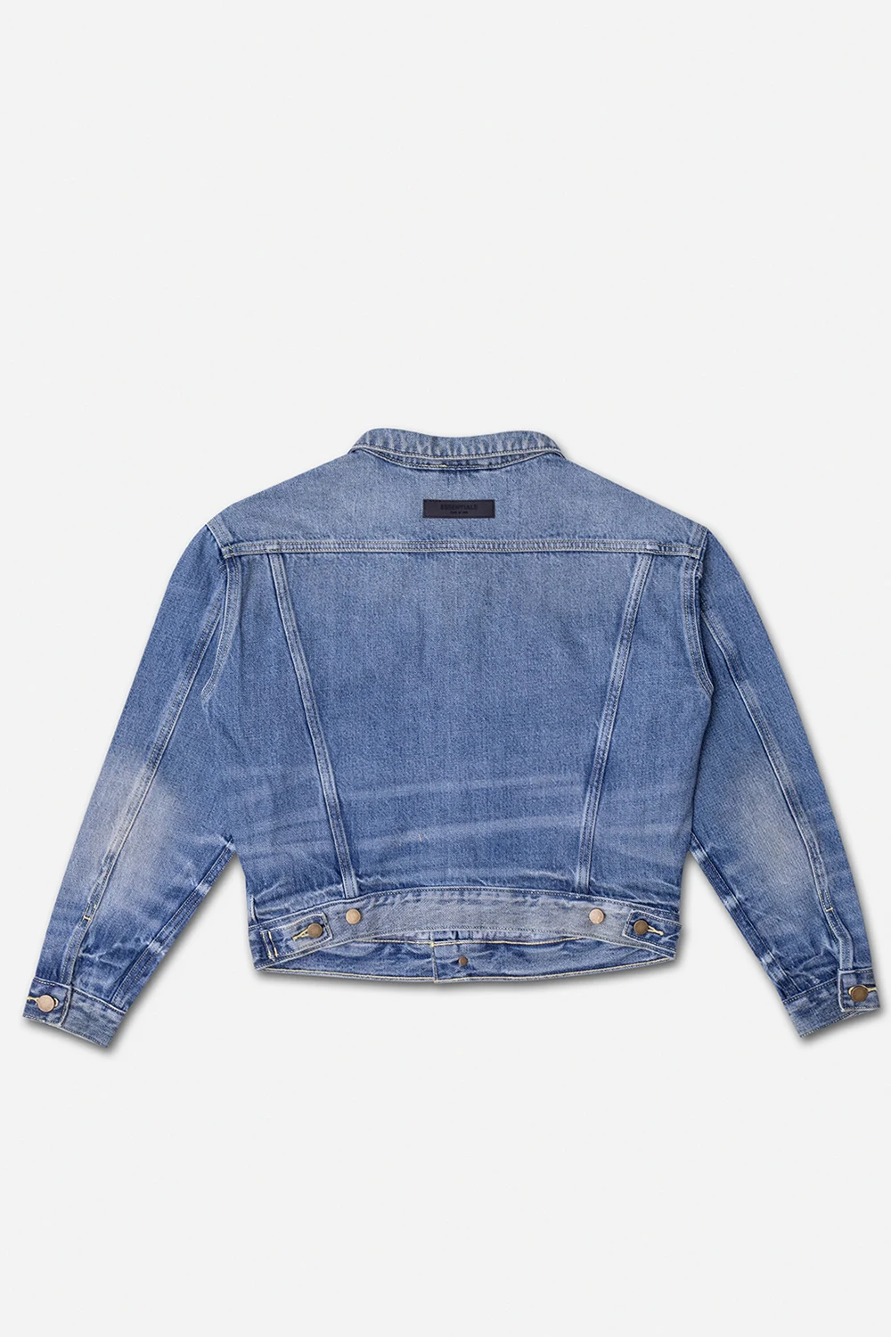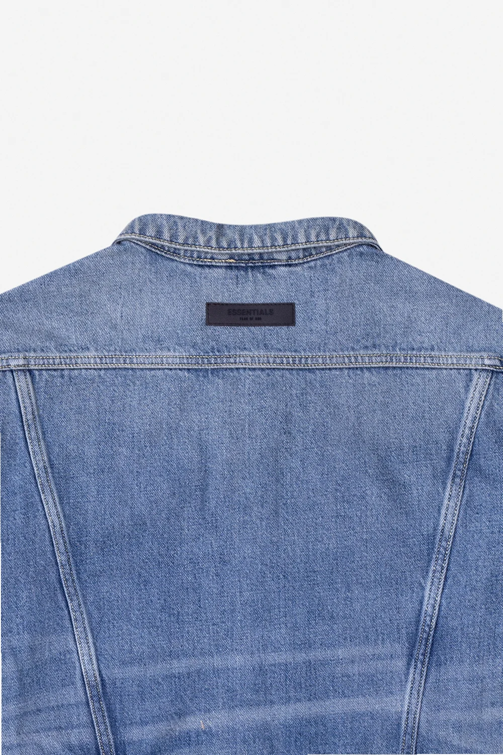 Blue and beige denim jacket from Fear Of God Essentials. Made of cotton, this garment features button fastenings, worn effect, two slip pockets, two flap pockets, logo patch at the back and long sleeves.
