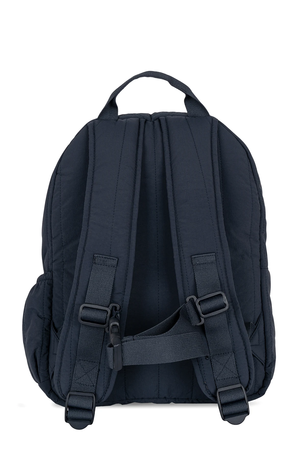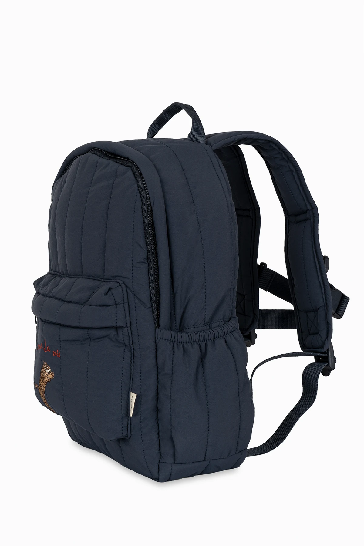 Navy blue ‘Juno’ quilted backpack from Konges Slojd. Made from fabric, this design fastens with a zip and showcases colourful graphic embroidery with a tiger and lettering, one zip front pocket, one top handle, adjustable shoulder straps, navy blue metal hardware and one internal compartment.